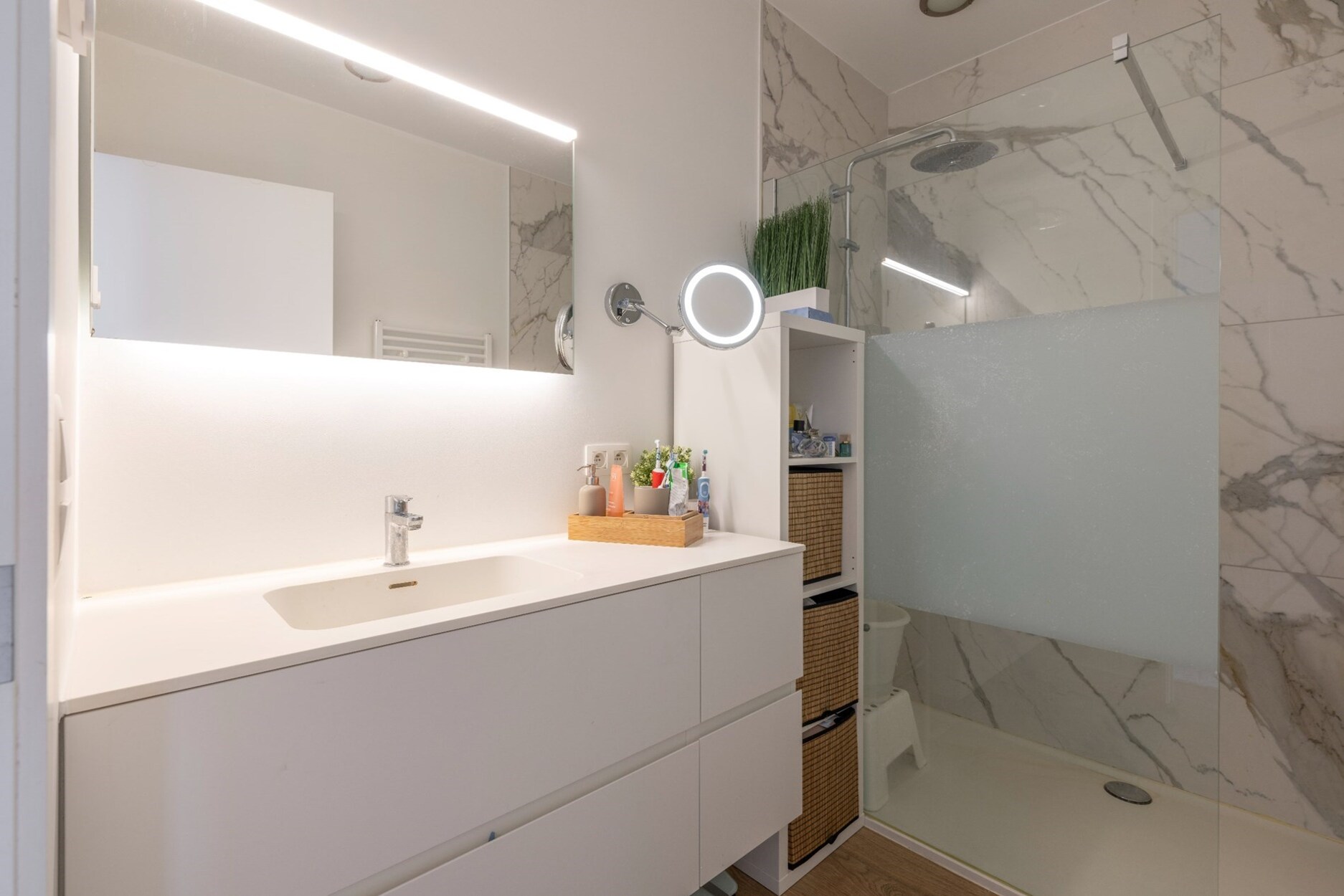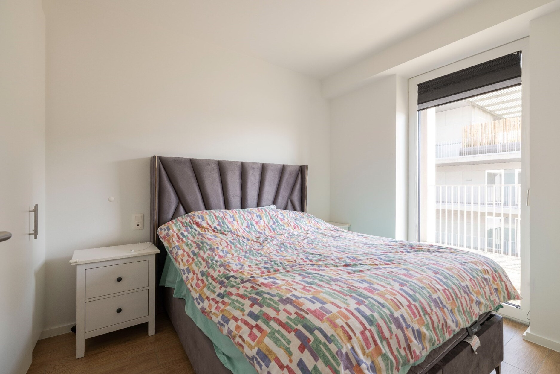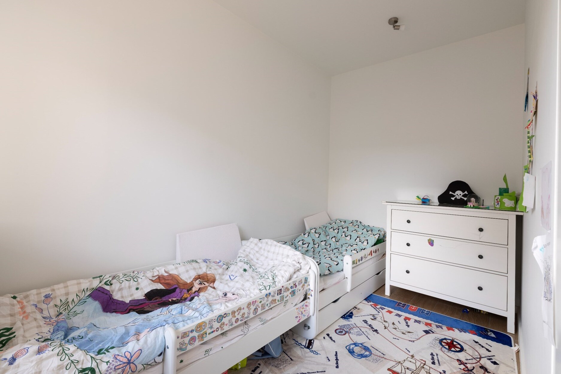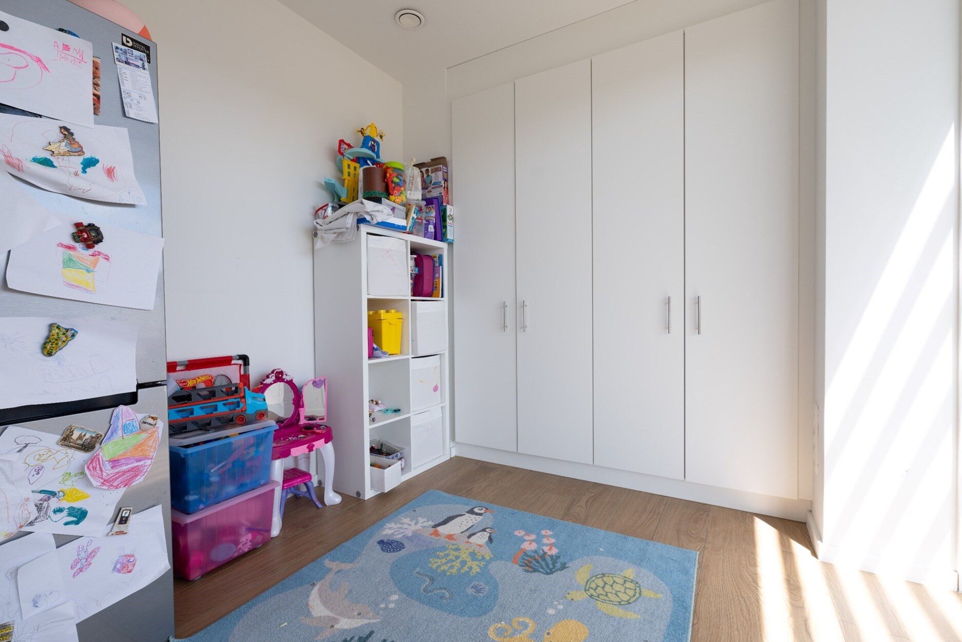 Het appartement beschikt over 3 slaapkamers met ingebouwde kasten, waarvan één slaapkamer met en-suite badkamer. Badkamer in marmerlook uitgerust met inloopdouche en lavabo in meubel. Keramische parket in alle ruimtes en vloerverwarming via het centraal systeem van de stad Antwerpen. Alle ramen uitgerust met verticale lamellen om de ruimte te verduisteren.