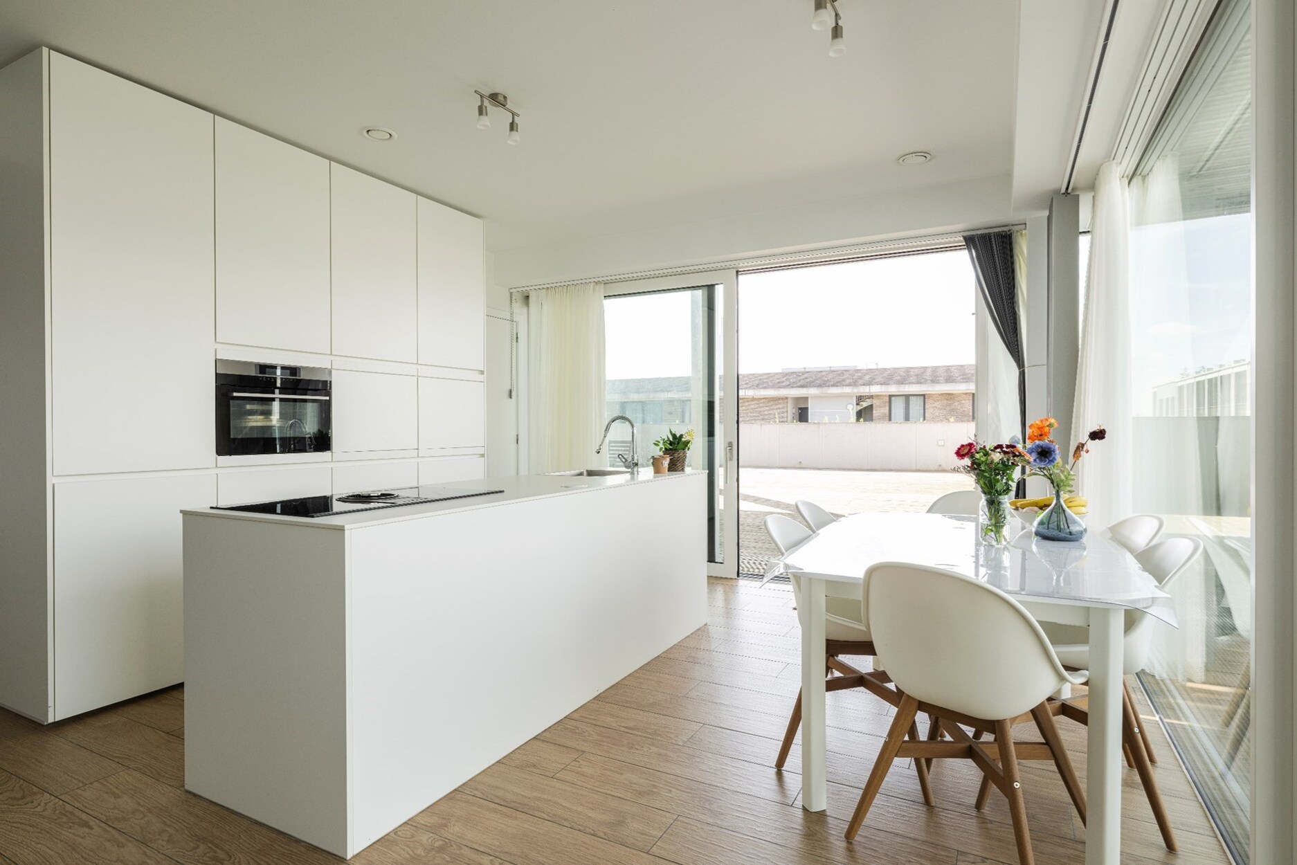 Via de inkomhal met videofonie, apart gastentoilet, vestiaire en wasplaats betreden we de leefruimte met open keuken. Keuken van Augustijns Keukens voorzien van ingebouwde kasten, vaatwasser, combi oven en ijskast met vriesvakken. Het kookeiland werd voorzien van een inductie kookplaat met ingebouwde afzuiging en rvs-gootsteen. Tot slot werden reeds alle leidingen aangelegd voor de installatie van een extra stoomoven en ingebouwde Espresso machine. Dankzij de grote raampartijen geniet u van veel lichtinval en een prachtig uitzicht. Vanuit de keuken heeft u toegang tot het riante Zuid-georiënteerd terras van maar liefst 130 m². De ideale plaats om gezellig te tafelen met familie en vrienden. Verlichting, waterkraan en elektriciteit voorzien op het terras.