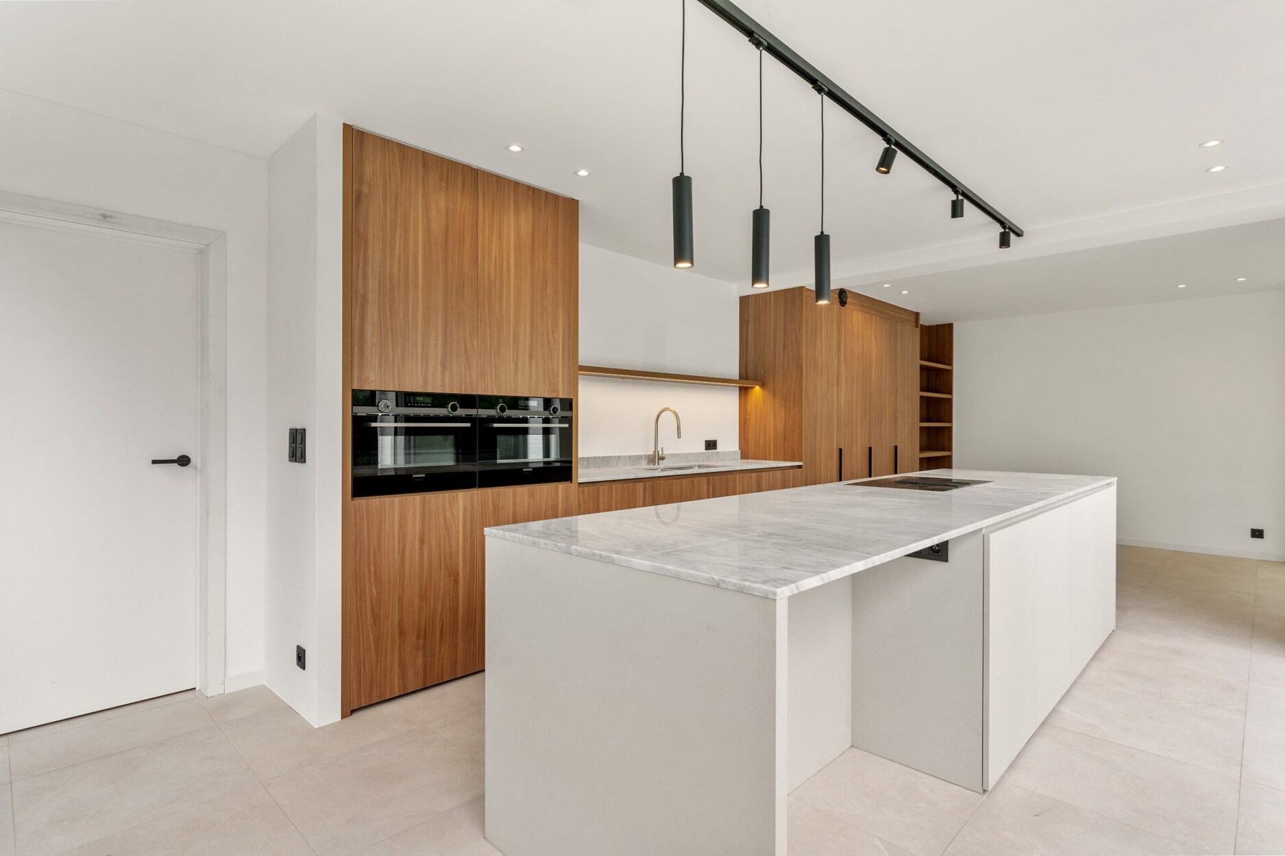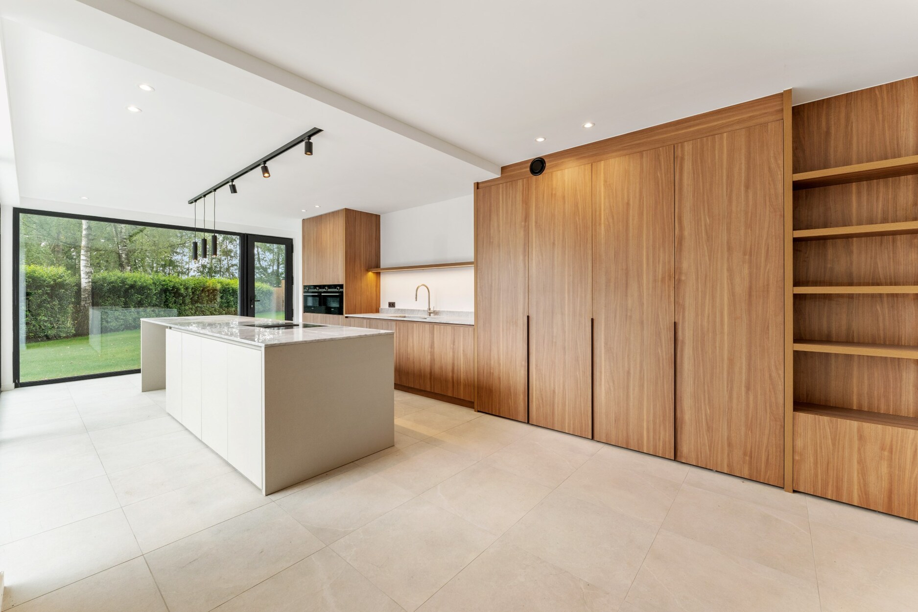 De centrale inkomhal met gastentoilet en vestiaire verleent toegang tot de ruime woonkamer. Deze geniet van veel natuurlijk lichtinval dankzij verschillende raampartijen. De woonkamer in L vorm heeft een speels karakter en stroomt mooi over in de schitterende woonkeuken. Deze keuken is compleet voorzien van modern keukenapparatuur, een natuurstenen werkblad, veel opbergkasten en een ruim kookeiland met ontbijthoek. De grote schuiframen vanuit deze woonkamer en leefkeuken geven toegang tot het mooi aangelegde terras op het westen.