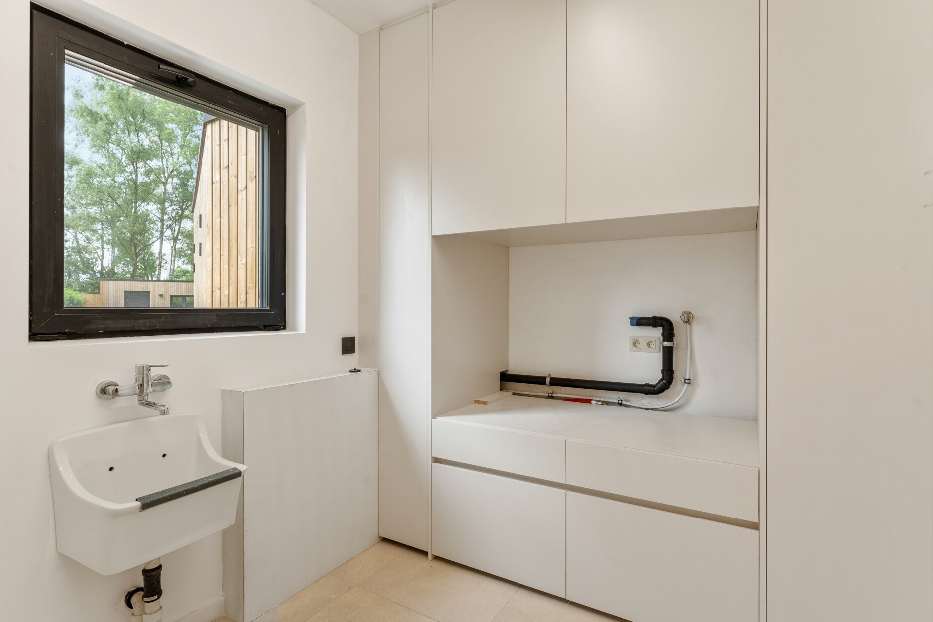 Aanpalend de keuken treft u een compleet ingerichte wasplaats met inbouwkasten en spoelbak en aansluitende garage met automatische poort.