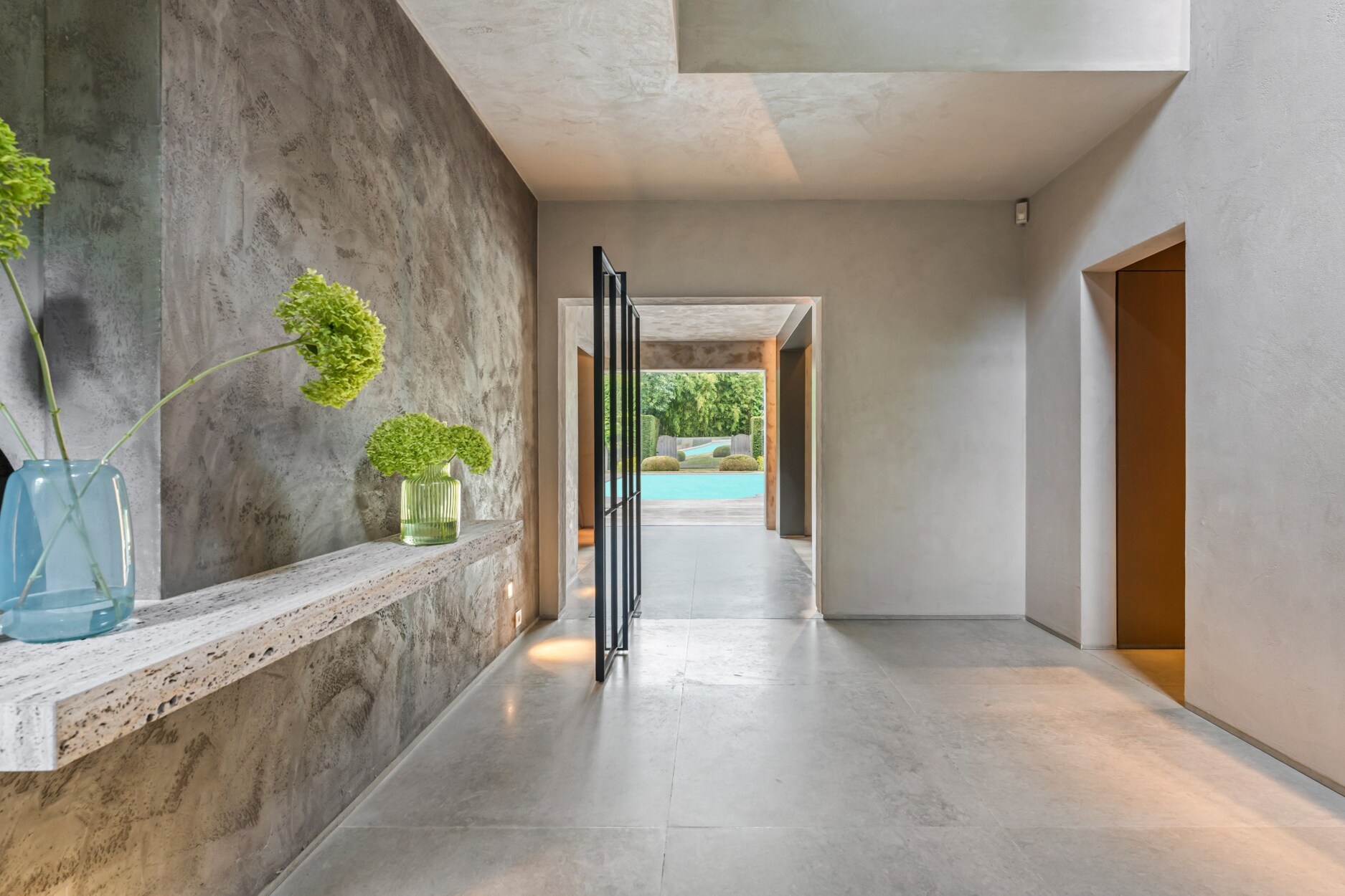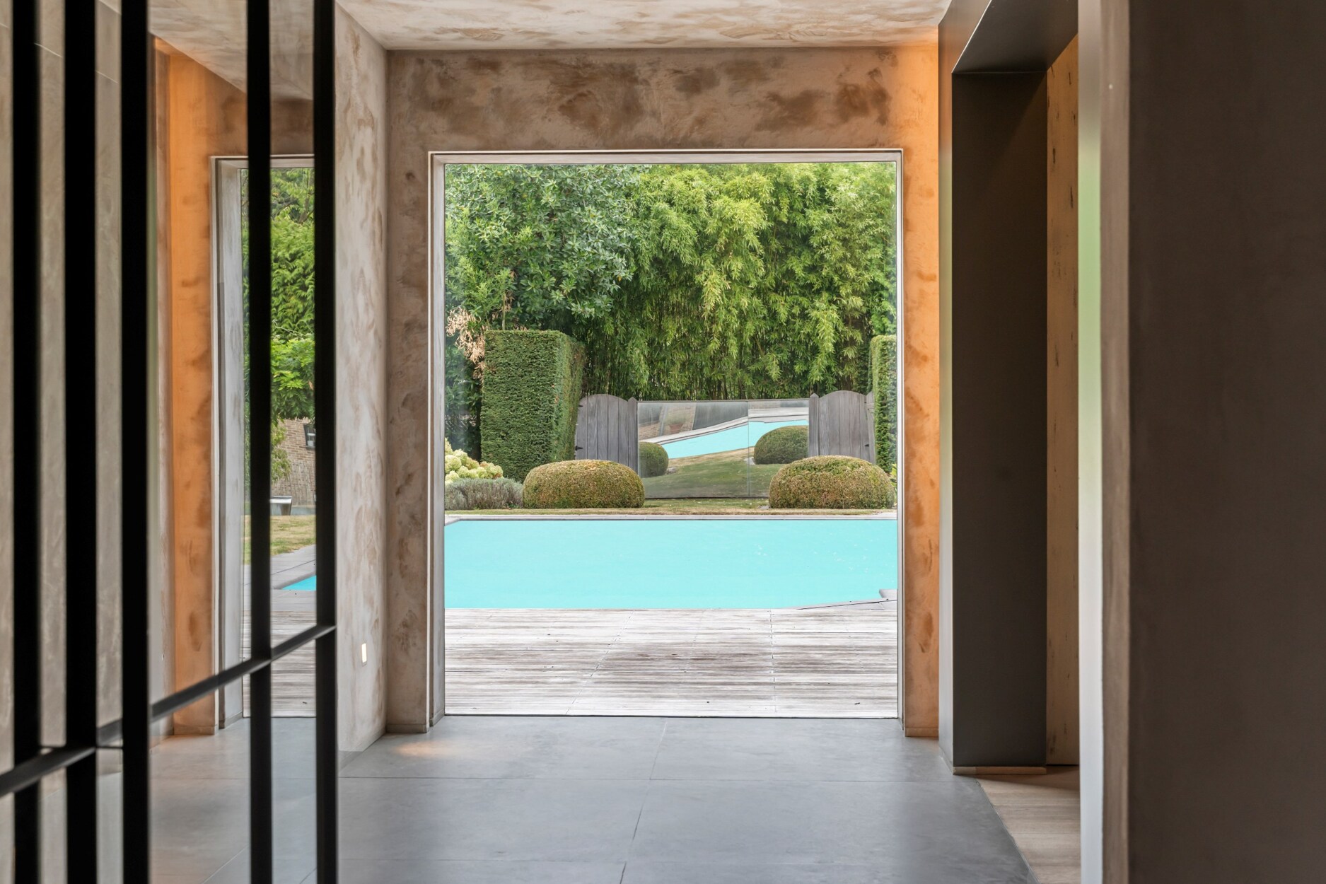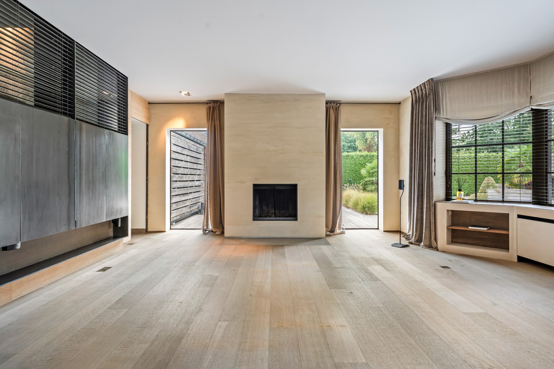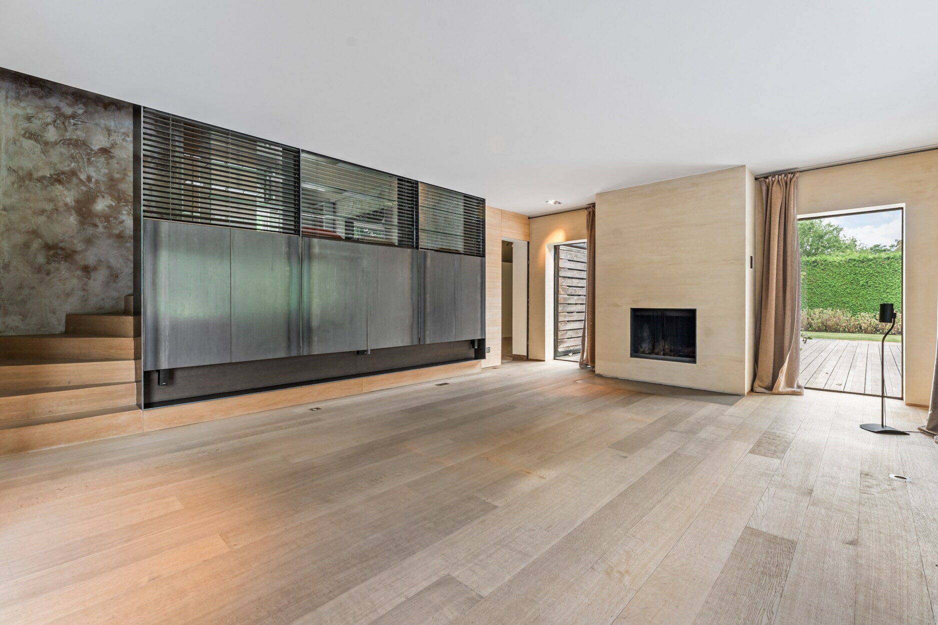 De stijlvolle inkomhal verwelkomt u met een gastentoilet en vestiaire. De lichtrijke leefruimte, volledig gericht op de tuin, is een toonbeeld van elegante indeling en hoogwaardige afwerking. Indirecte sfeerverlichting en een gezellige tv-hoek, bereikbaar via een aparte trap, zorgen voor een warme en huiselijke sfeer.