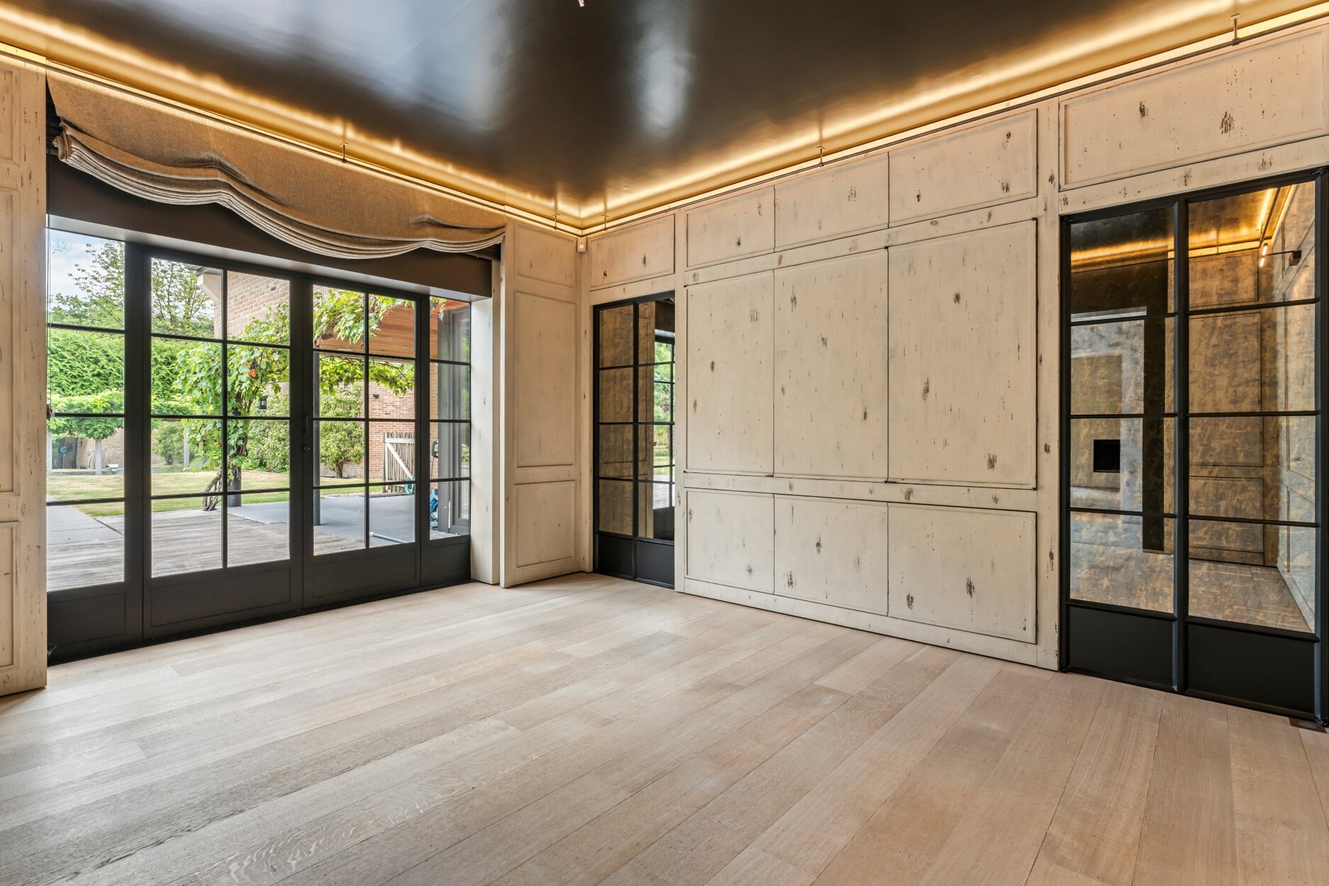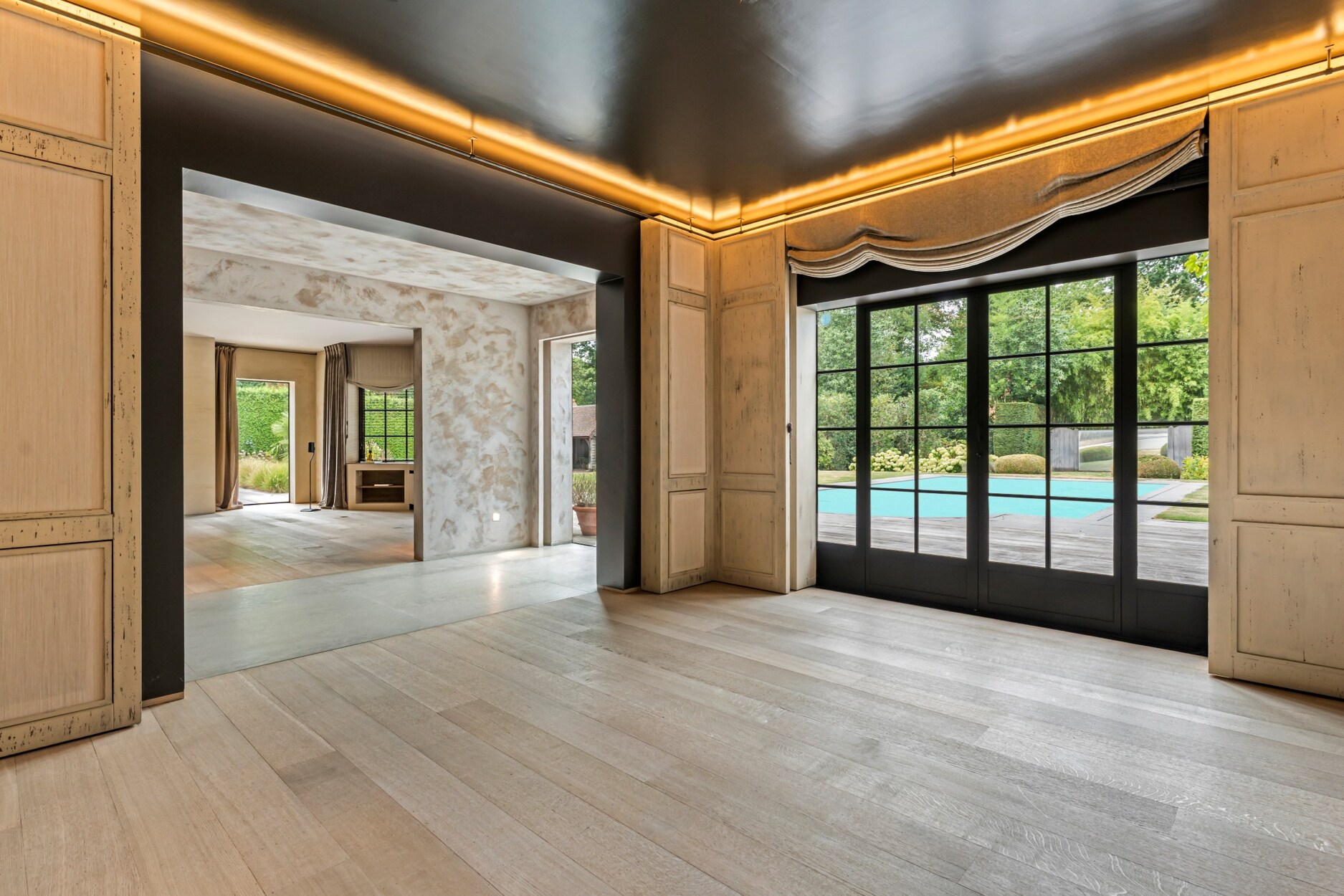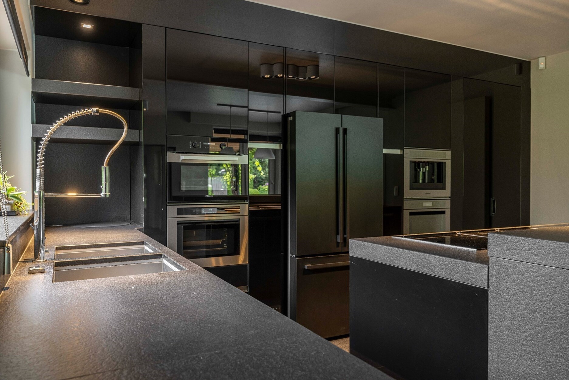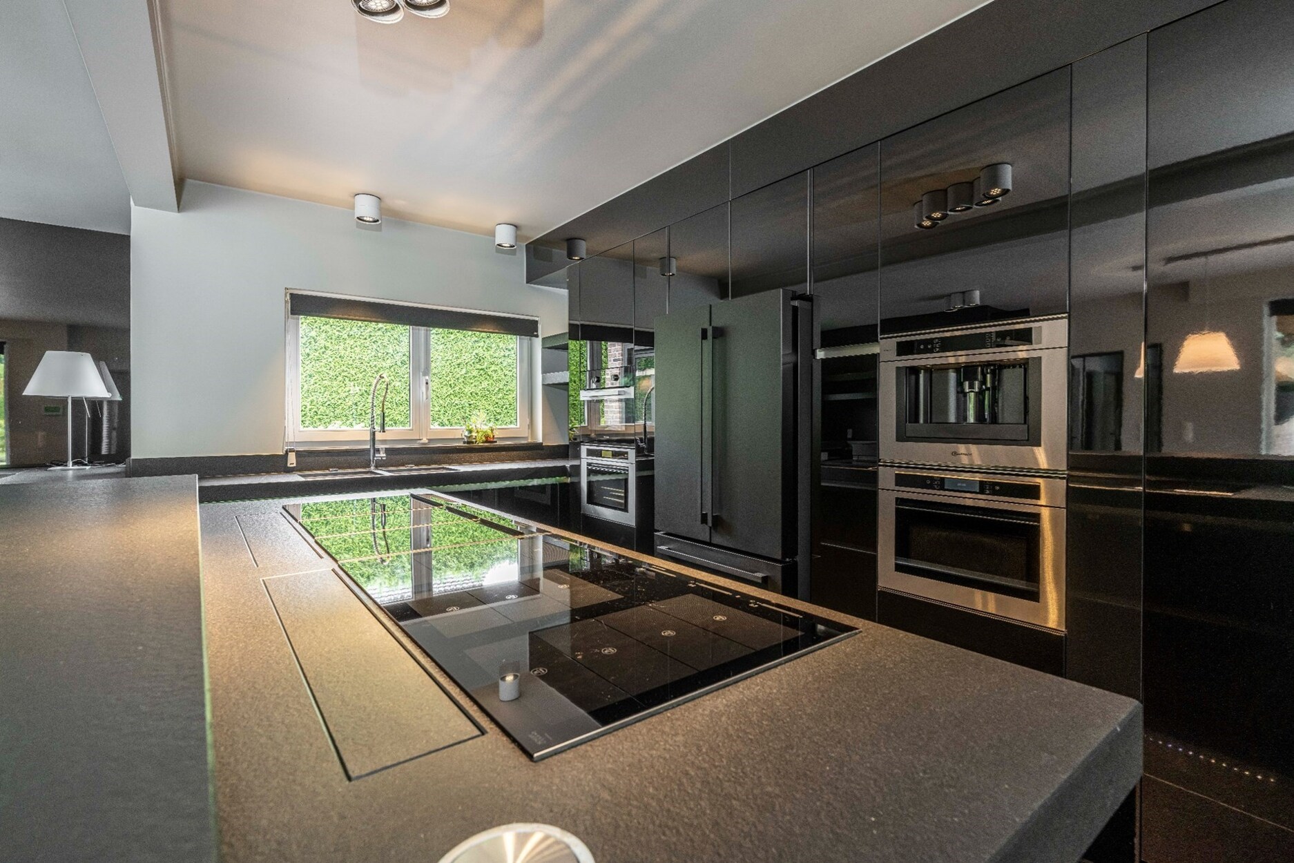 De stijlvolle inkomhal verwelkomt u met een gastentoilet en vestiaire. De lichtrijke leefruimte, volledig gericht op de tuin, is een toonbeeld van elegante indeling en hoogwaardige afwerking. Indirecte sfeerverlichting en een gezellige tv-hoek, bereikbaar via een aparte trap, zorgen voor een warme en huiselijke sfeer.