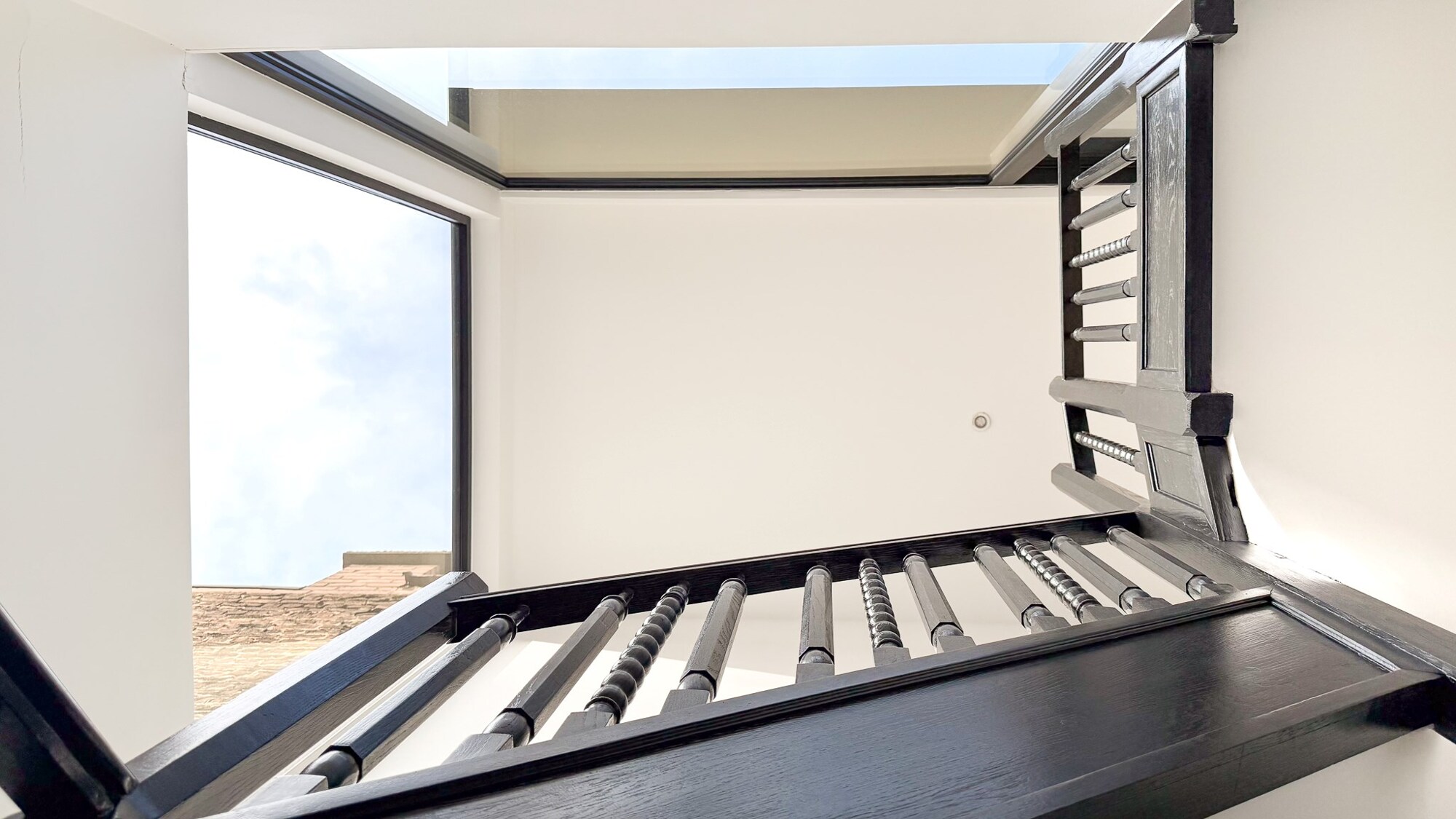 De eerste verdieping herbergt een suite met slaapkamer, douchekamer en een flexibele ruimte geschikt als dressing of kantoor.