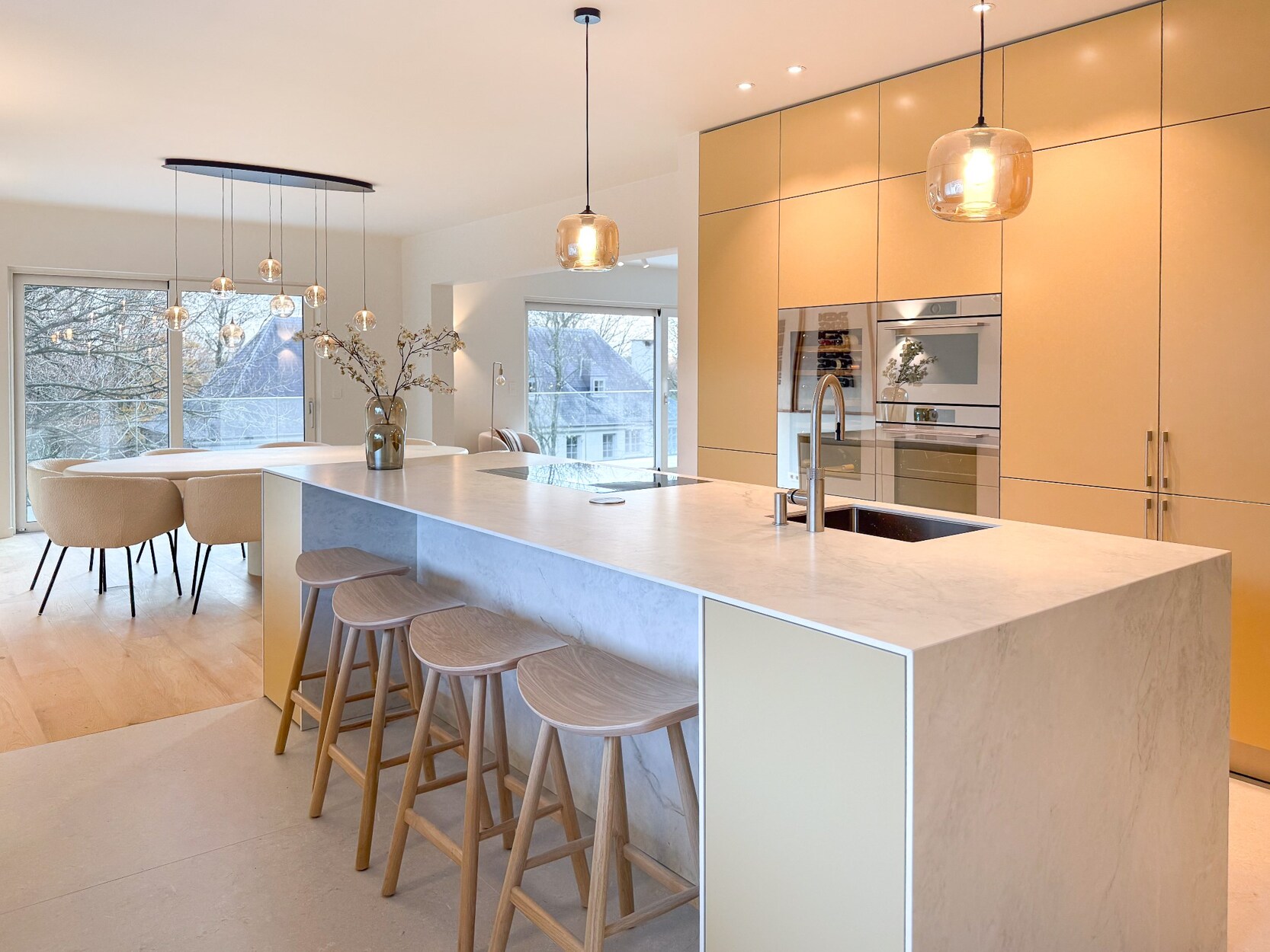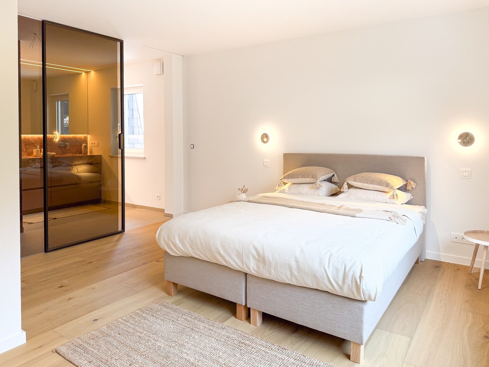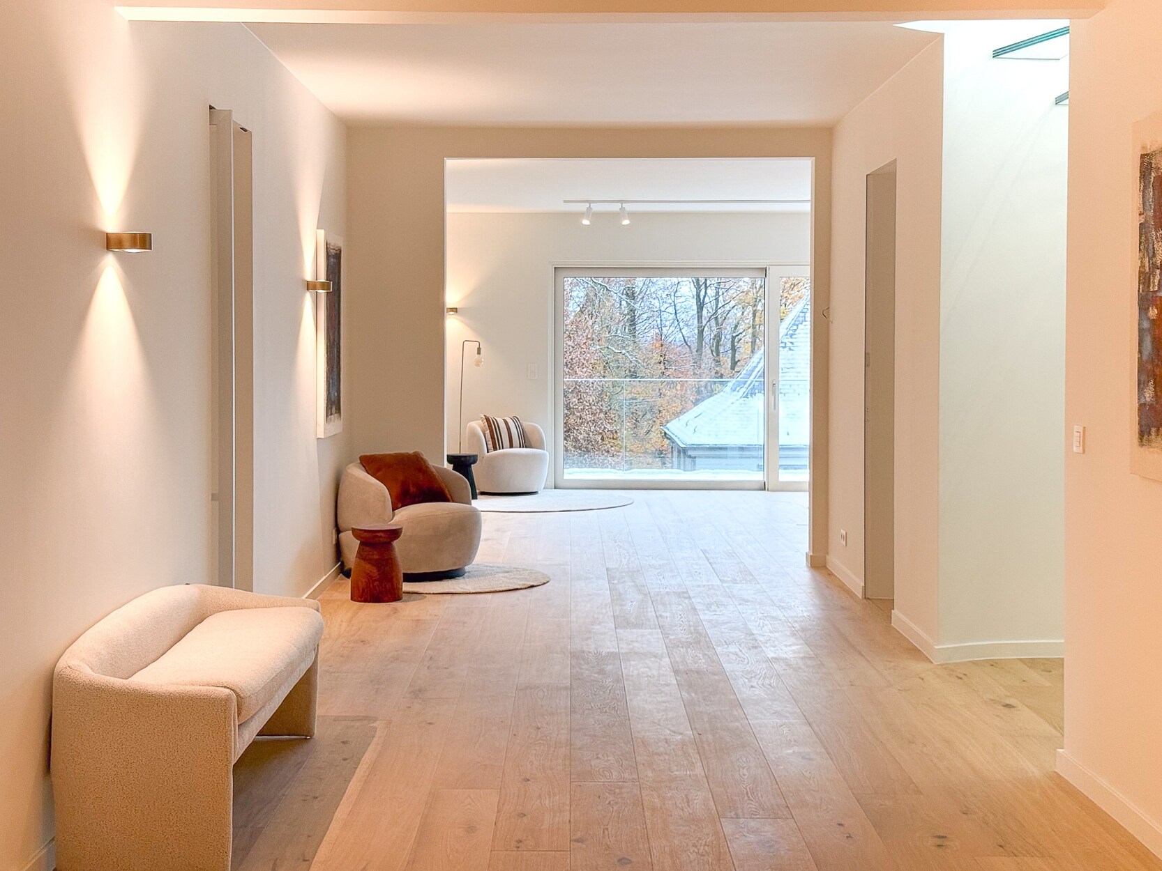 De penthouse verwelkomt u met een royale hal die toegang biedt tot perfect ontworpen leefruimtes. De Bulthaup keuken is uitgerust met hoogwaardige toestellen waaronder een Novy Panorama kookplaat, V-Zug ovens en wijnkast, en Quooker kokendwaterkraan. De keuken geeft uit op een balkon, terwijl de lichtrijke leefruimte een eetkamer en zitkamer met houtkachel en terrastoegang biedt.