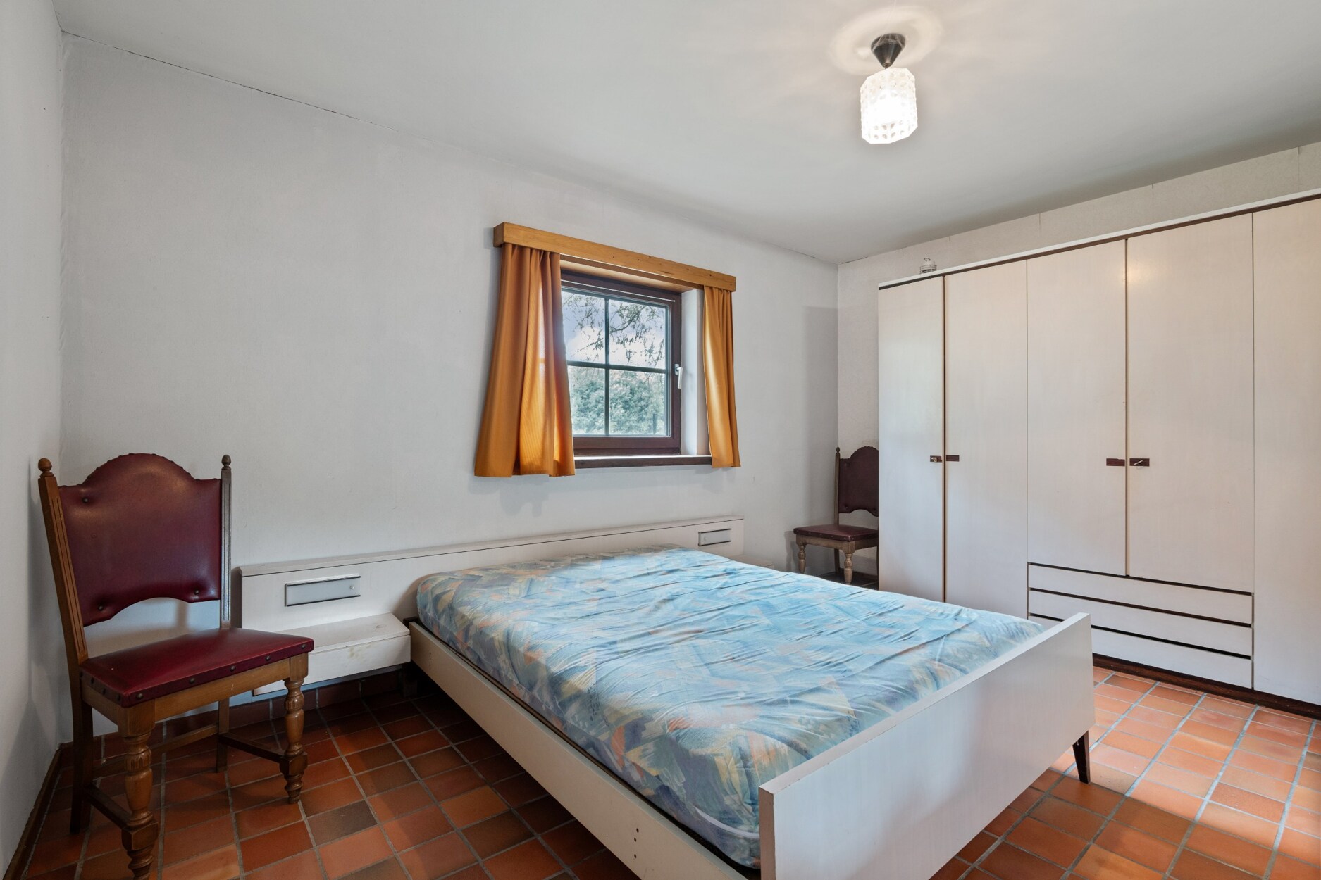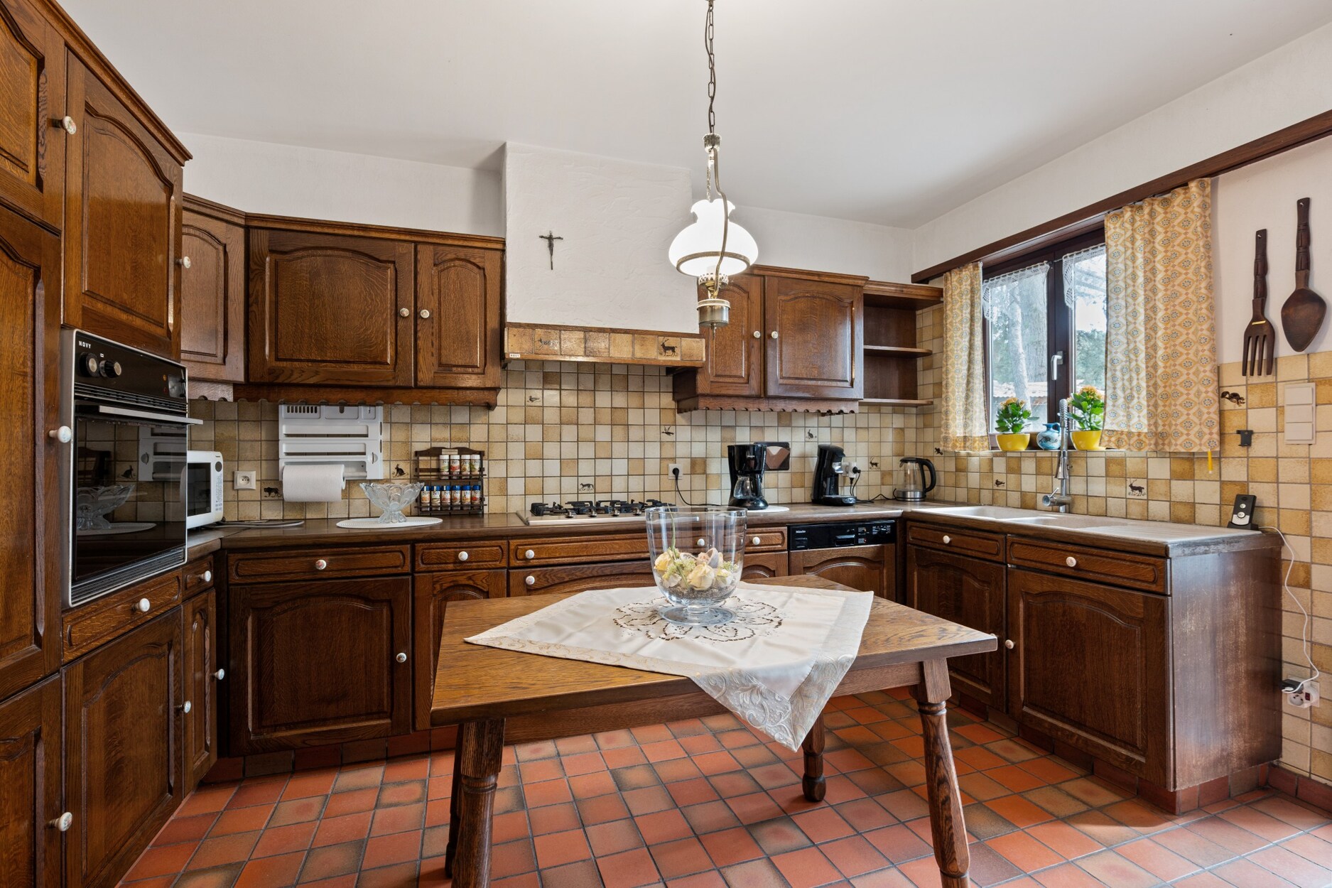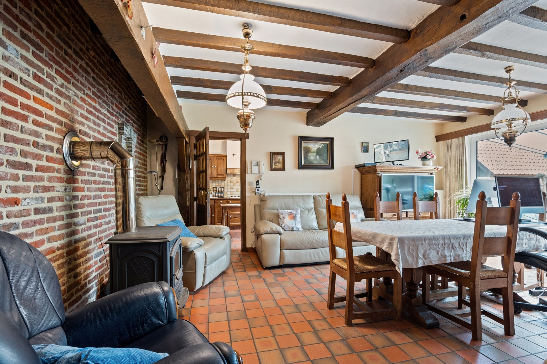 Via de voordeur komen we in de L-vormige leefruimte met houthaard. Hier is een vaste trap voorzien naar de zolder. De woonkamer staat in verbinding met de 3 slaapkamers en de eetkamer. Rechts in de woonkamer is de eerste kelder te bereiken, ideaal als wijnkelder. De eetkamer heeft een mooi uitzicht op de achterliggende grond. Hier sluit ook de veranda aan. De keuken is authentiek en voorzien van alle toestellen. De badkamer heeft een douchecabine, bad en wastafel. Het toilet is gelegen naast de badkamer. De aanpalende garage biedt voldoende plaats voor 2 wagens en meer opbergruimte.