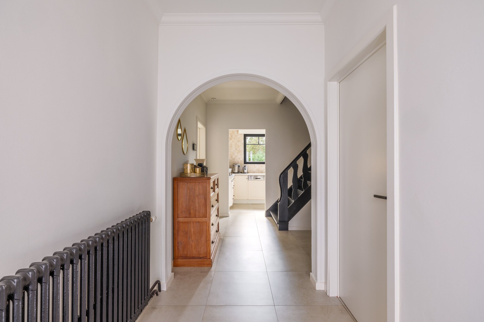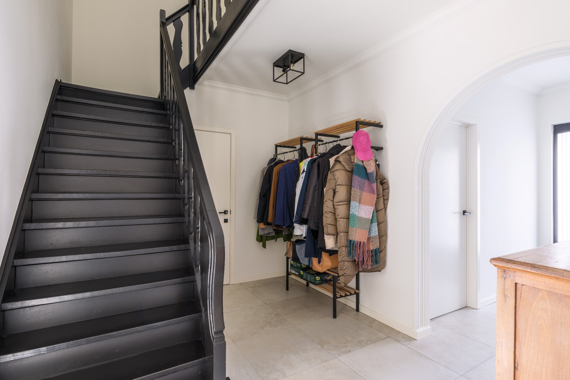 U betreedt de woning via de inkomhal met gastentoilet en vestiaire. Via de hal hebt u toegang tot de kantoorruimte (vooraan), de woonkamer en de keuken. De keuken is volledig ingericht met toestellen en geeft toegang tot een praktische opbergkelder.
