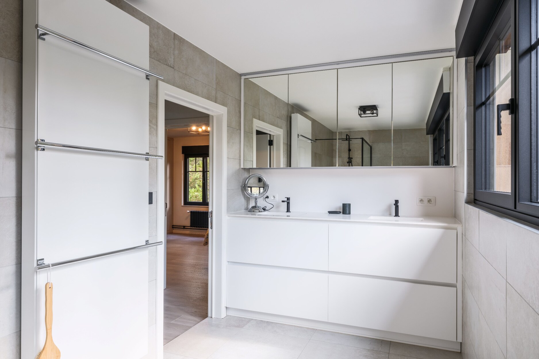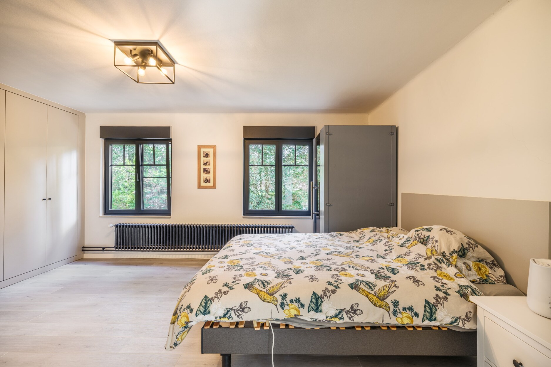 Op de eerste verdieping treft u 3 ruime slaapkamers, waarvan er 2 voorzien zijn van ingemaakte kasten. Verder een volledig vernieuwde badkamer voorzien van een inloopdouche, dubbele wastafel in meubel en een toilet. De zolder is toegankelijk via een vernieuwde vlizotrap en biedt nog extra mogelijkheden.