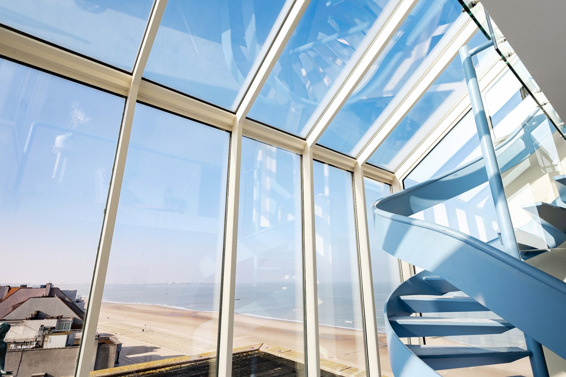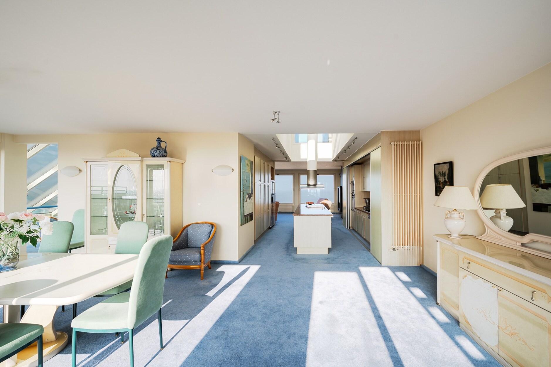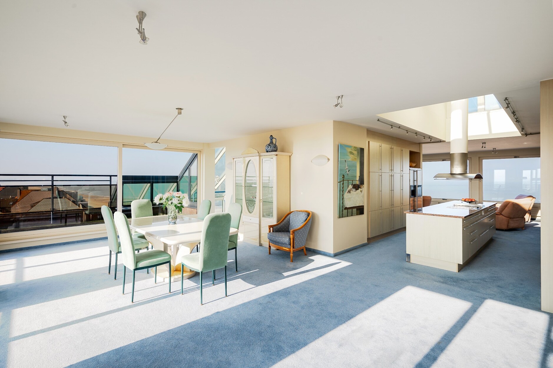 Bij binnenkomst op de 12de verdieping word je meteen verwelkomd door een indrukwekkende trap en een fenomenaal uitzicht. De lichtrijke leefruimte biedt een frontaal zeezicht, waardoor je dag in, dag uit geniet van een uniek uitzicht. De moderne open keuken met centraal eiland baadt in het daglicht dankzij een grote koepel en royale raampartijen. Aansluitend bevindt zich de eetkamer, omringd door ruime terrassen, ideaal voor gezellige diners met zicht op de horizon.