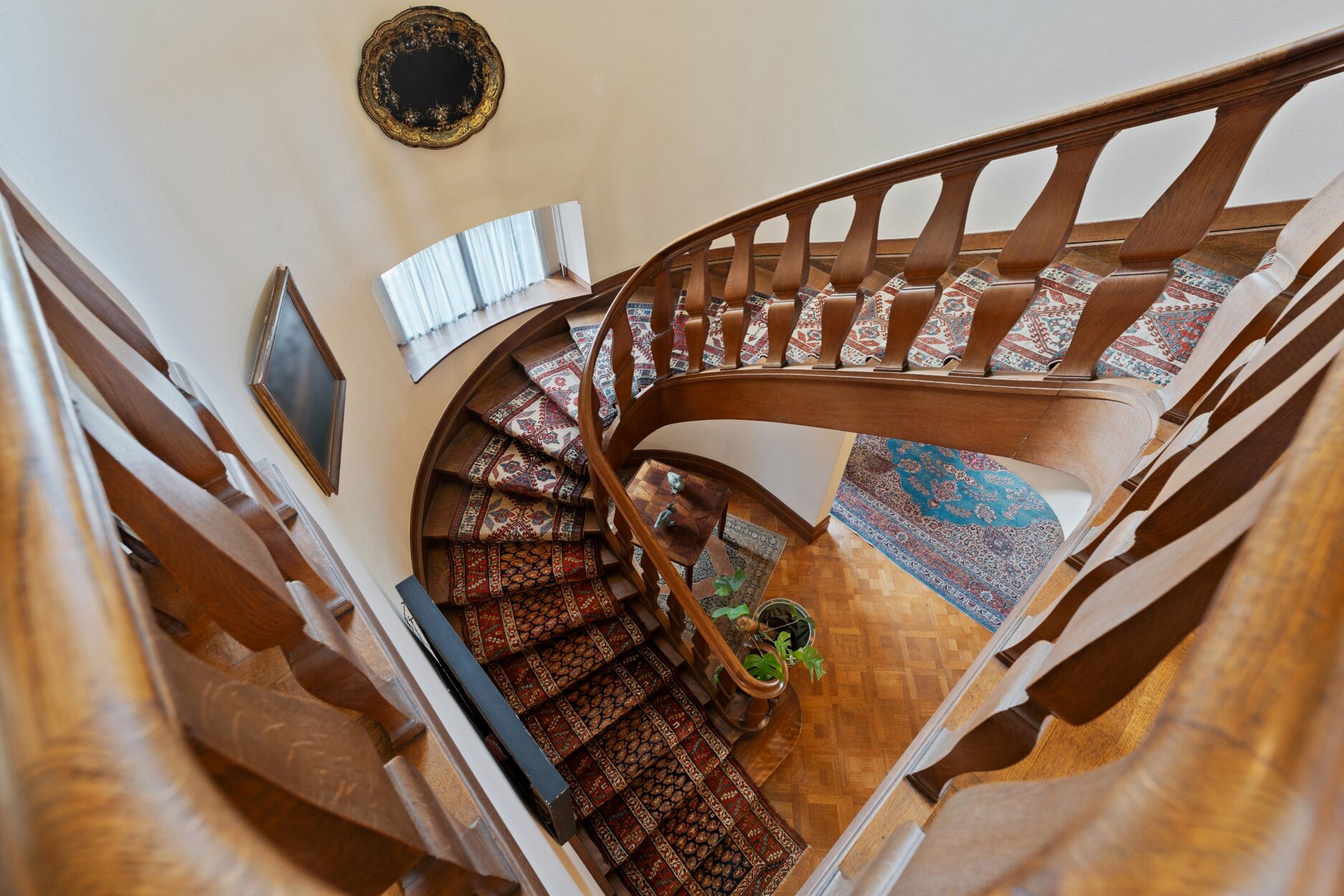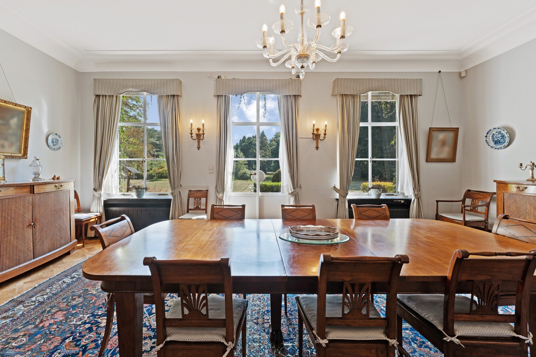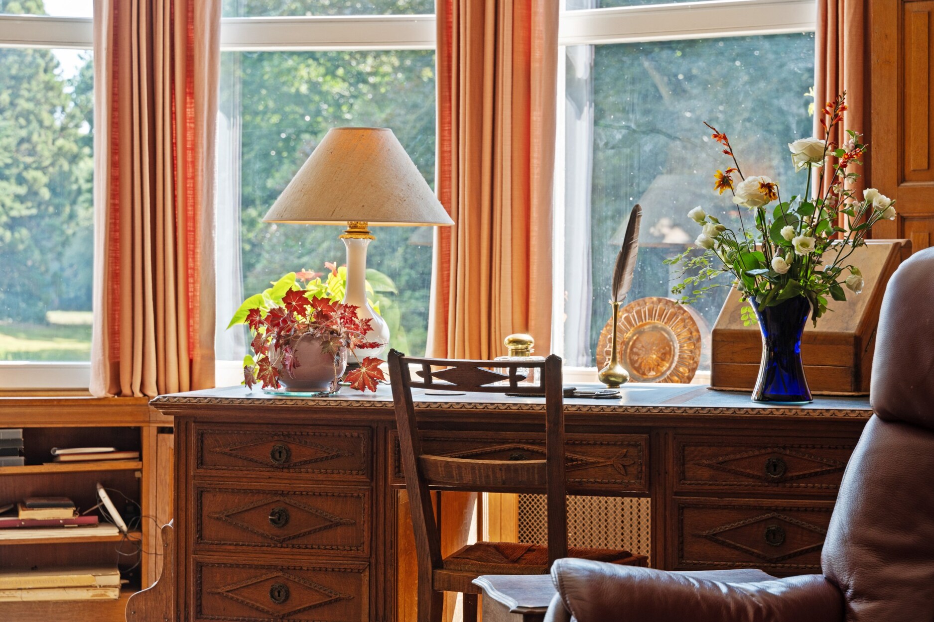 Het hart van het domein wordt gevormd door de prestigieuze villa. Een statige inkomhal leidt naar ruime ontvangstruimtes, waar hoogwaardige materialen zoals authentiek parket en sierlijke afwerkingen warmte en karakter brengen. De eetkamer met hoge plafonds en brede deuren, de prachtige bibliotheek met open haard en ingemaakte kasten, en het royale salon met meerdere zithoeken vormen samen een setting die zowel stijlvol als functioneel is.