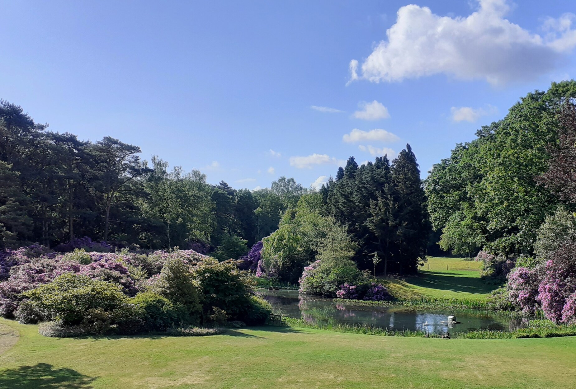 Park met vijver, eeuwenoude bomen, rododendrons, gazons en bospercelen
