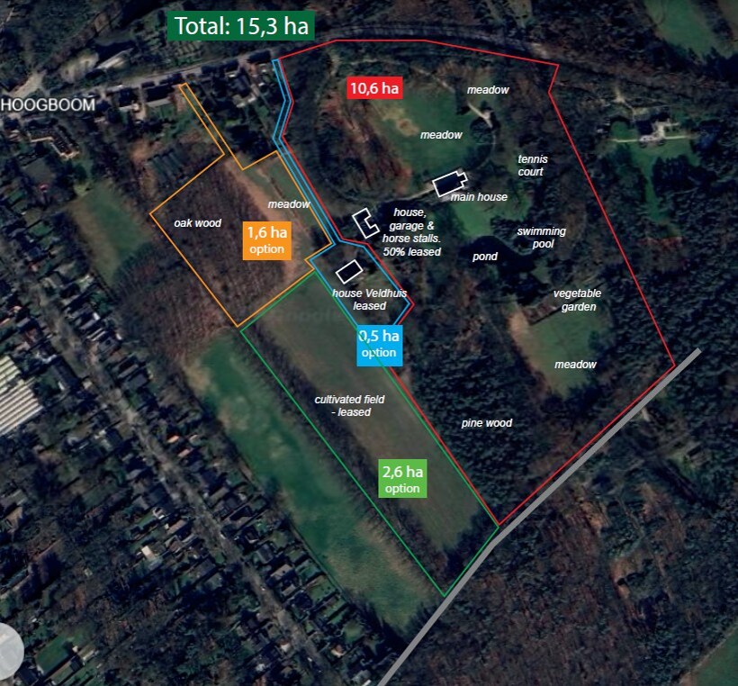 Een afzonderlijk landhuis met tuin en afzonderlijke toegangsweg wordt optioneel aangeboden evenals bijkomende gronden, bossen en weiden. Het uitzonderlijke domein verruimd dan van ca. 10 ha naar ca. 12.5 ha.