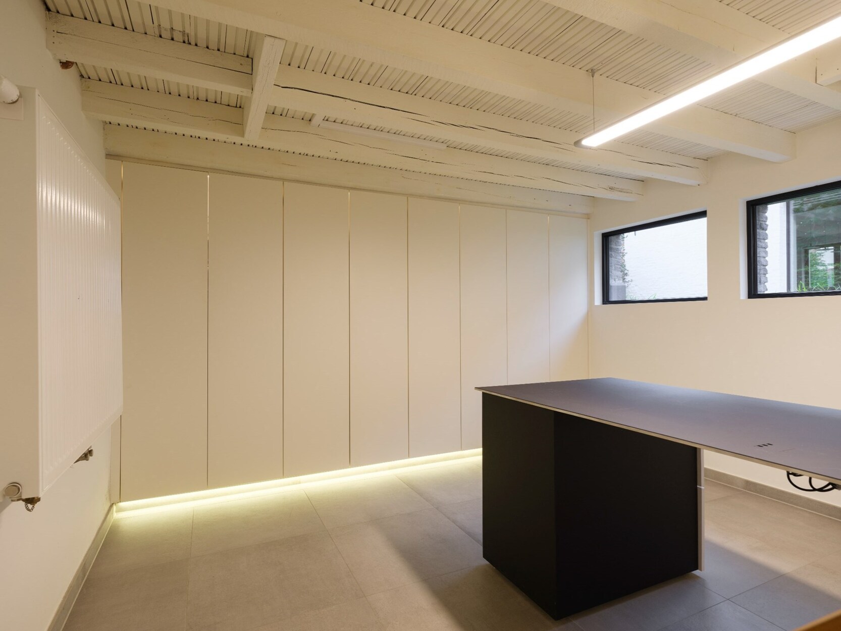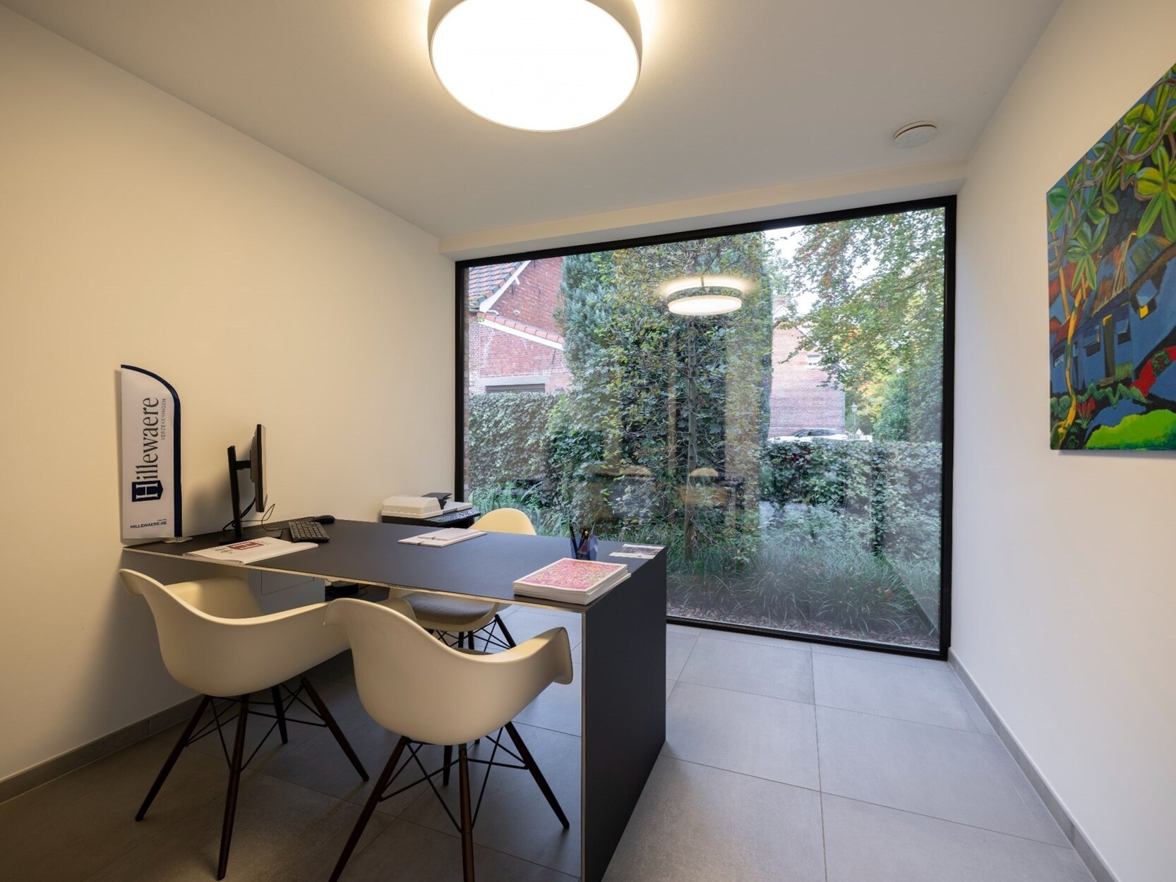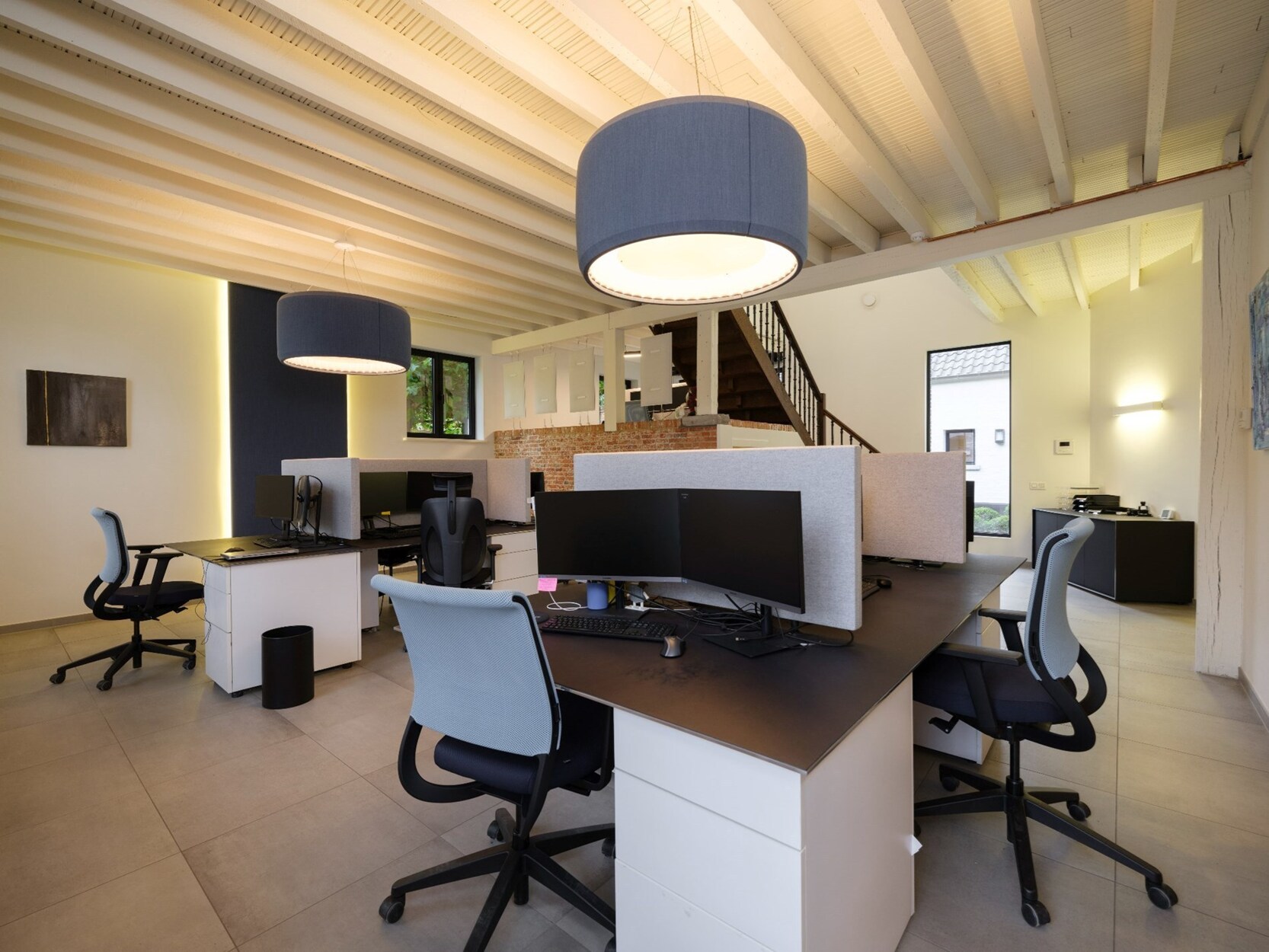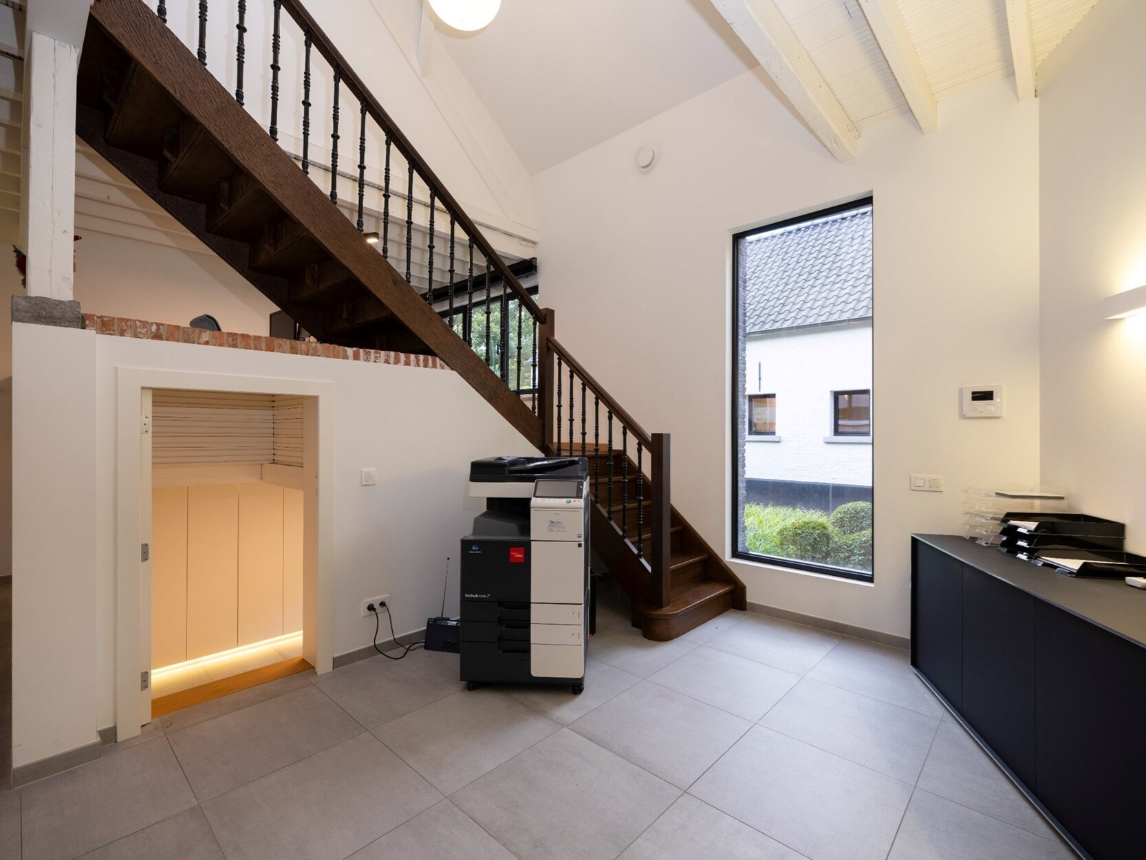 Via een binnentrap bereikt men de eerste etage dewelke evenzo volledig instapklaar is. Deze eerste verdieping is ingedeeld in een vergaderruimte, een open office, zithoek, berging en badkamer.