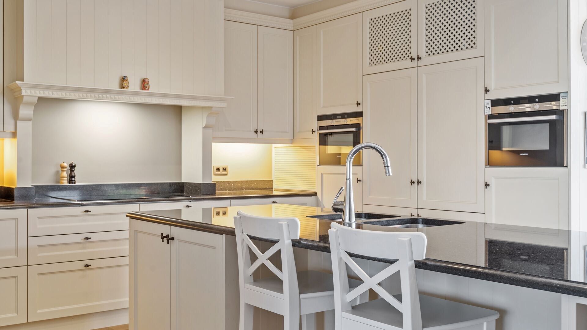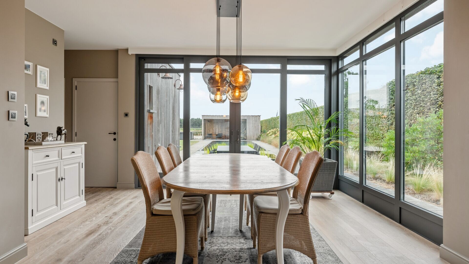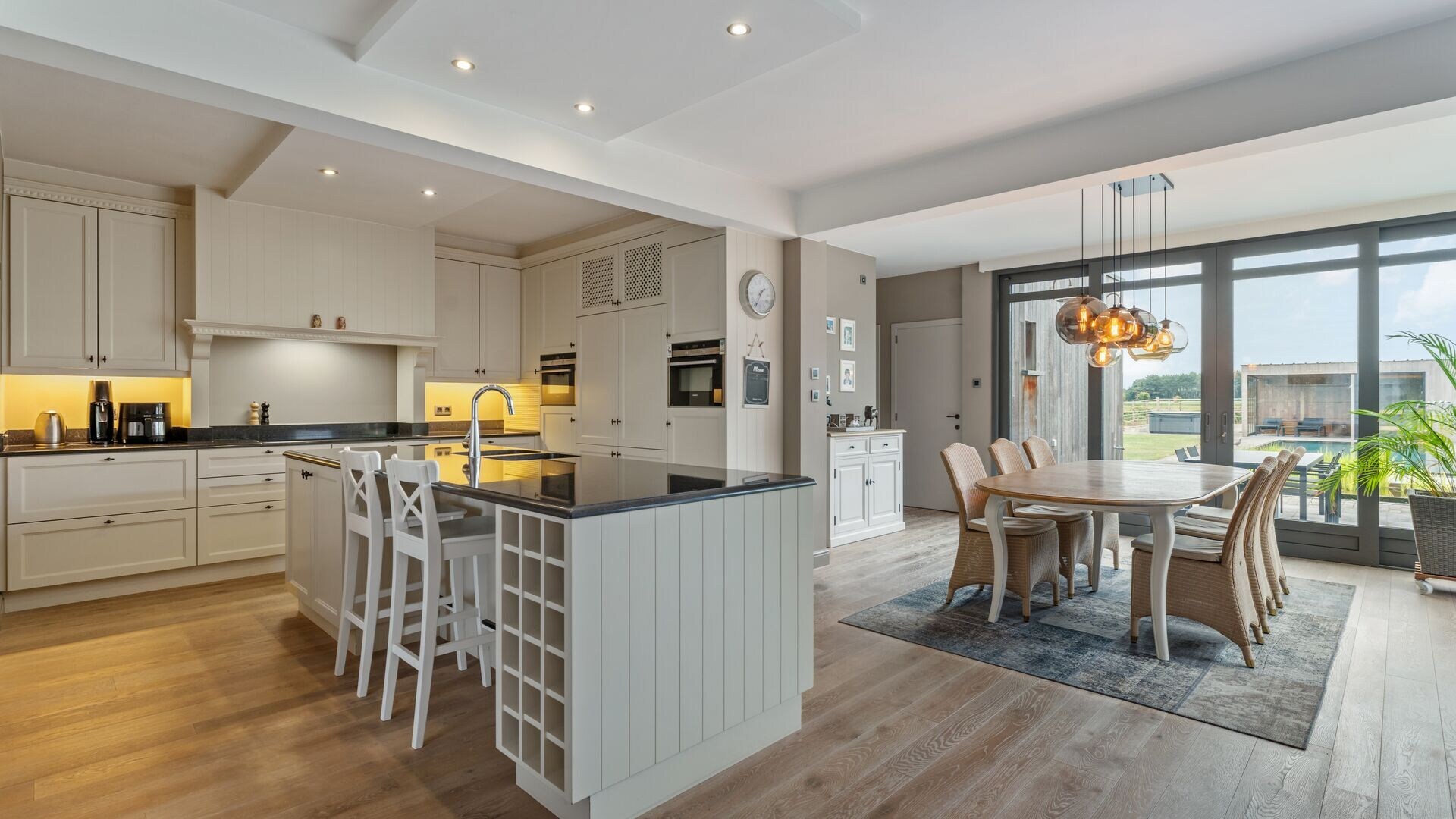 - Ruime, volledig uitgeruste keuken met kookeiland en eetruimte met uitzicht op de tuin en het zwembad