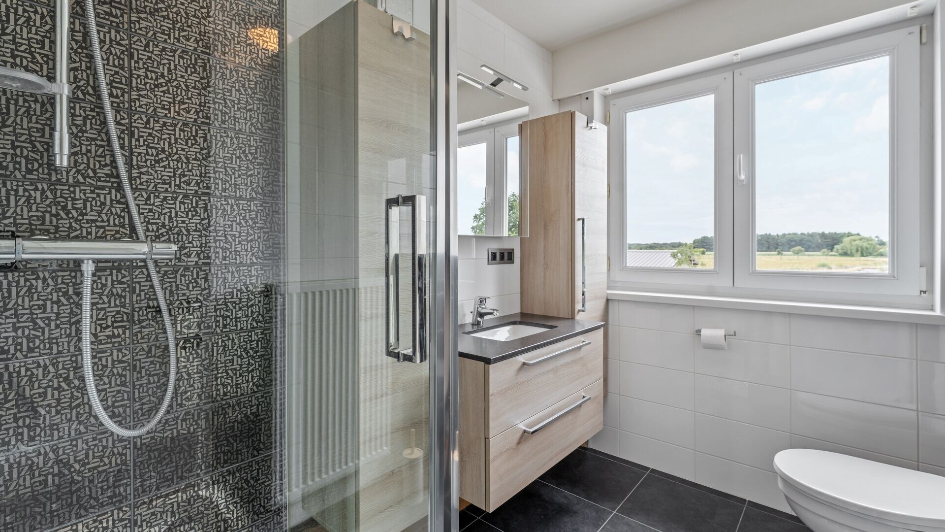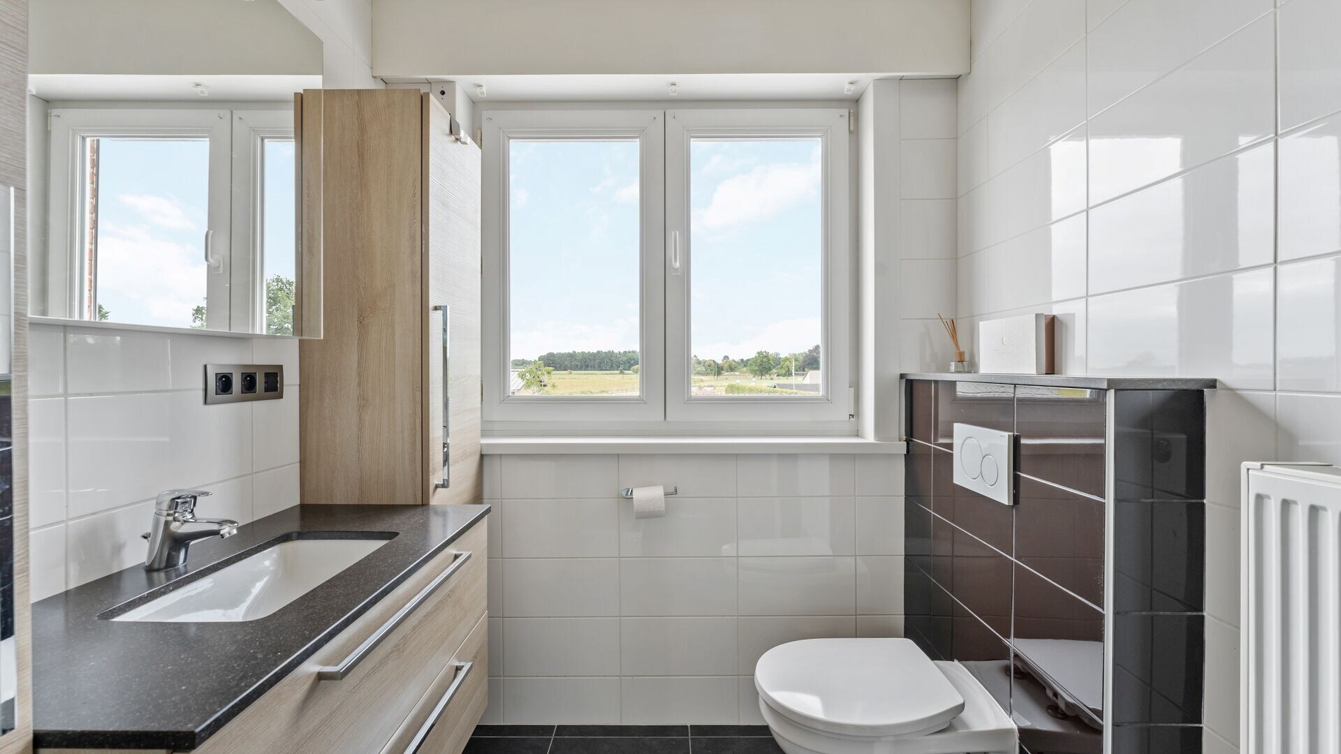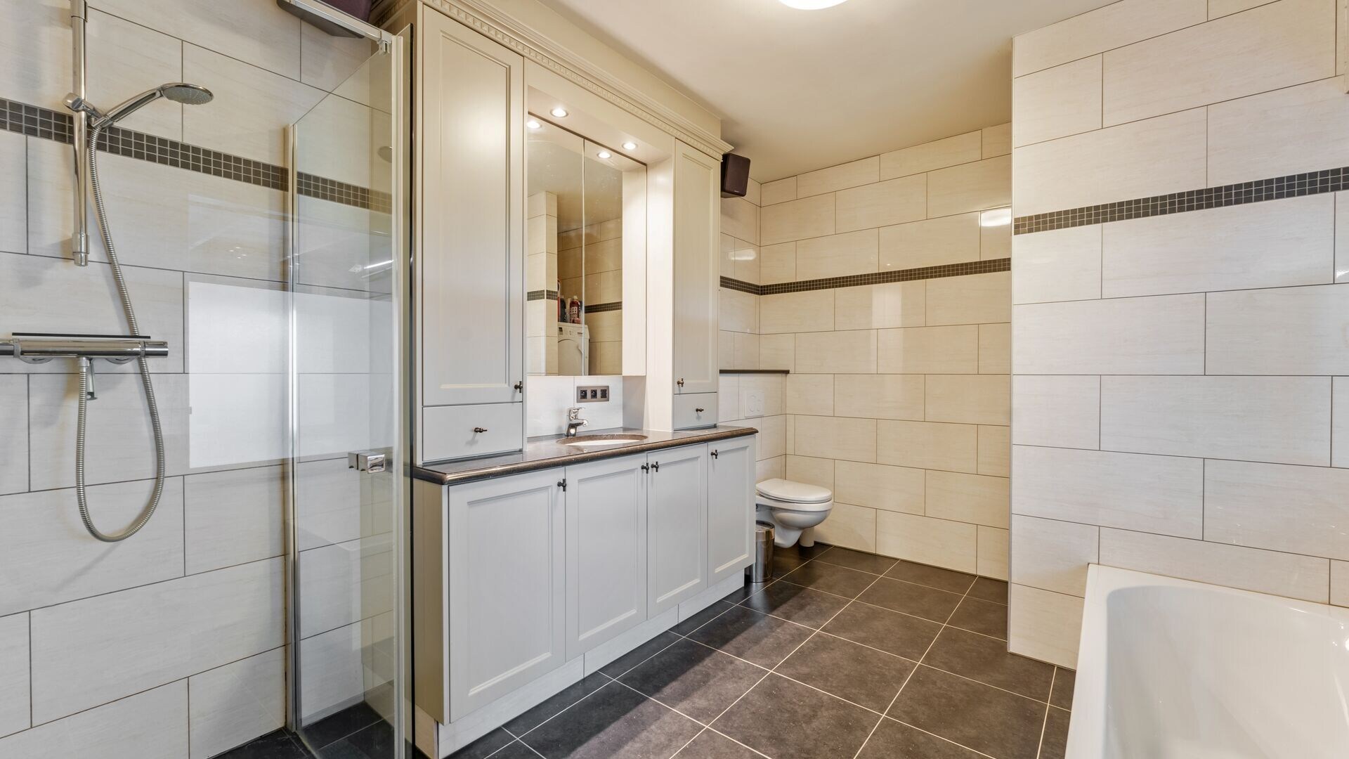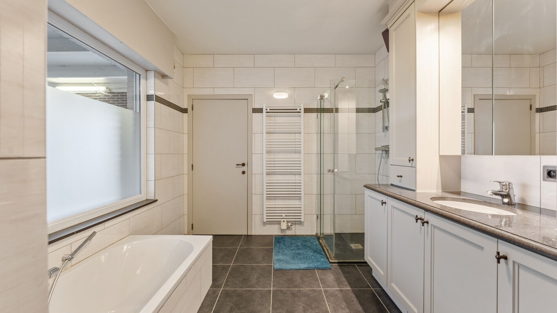 - Grote badkamer met ligbad, douche, dubbele lavabo en toilet