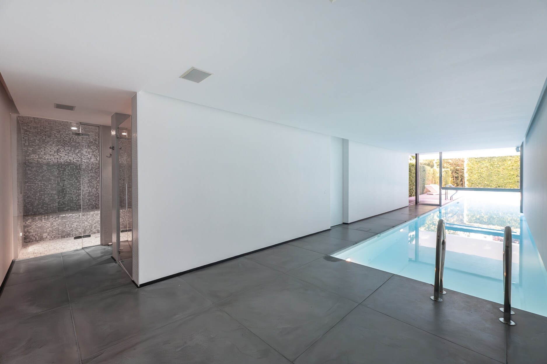 Het wellnessgedeelte omvat een binnen- en buitenzwembad, hammam, poolhouse en kleedruimte. Technische uitrusting: gepolierde betonvloeren, volledige domotica, audiovisuele installaties, elektrische rolluiken, 34 zonnepanelen, vloerverwarming, airconditioning, regenwaterput en Buderus condensatieketel. Een garage voor vier wagens, buitenparking en aangelegde tuin vervolledigen het geheel.