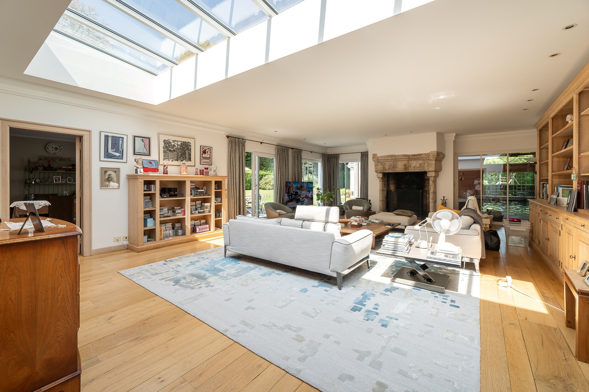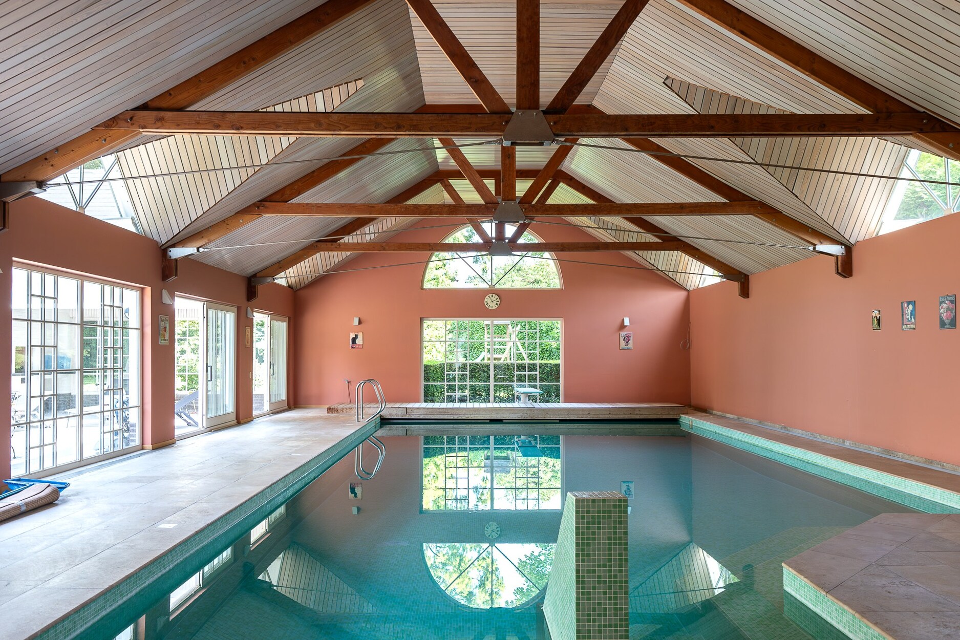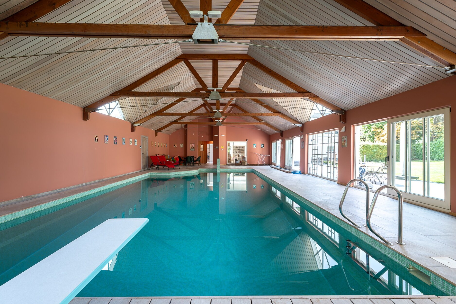 De inkomhal leidt naar de leefruimtes en een eerste slaapkamer met eigen badkamer op het gelijkvloers, ideaal voor wie gelijkvloers wil wonen of een professioneel gebruik wenst. De woonkamer met open haard is doorzon en geeft uit op de tuin. Aansluitend bevindt zich een aparte eetkamer en een volledig uitgeruste keuken met bijkeuken. Een bureau en bibliotheek vervolledigen dit niveau. Het binnenzwembad opent naar een overdekt terras met ingebouwde barbecue, sauna en douche.