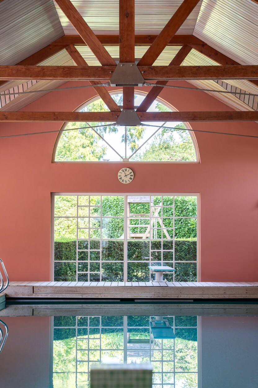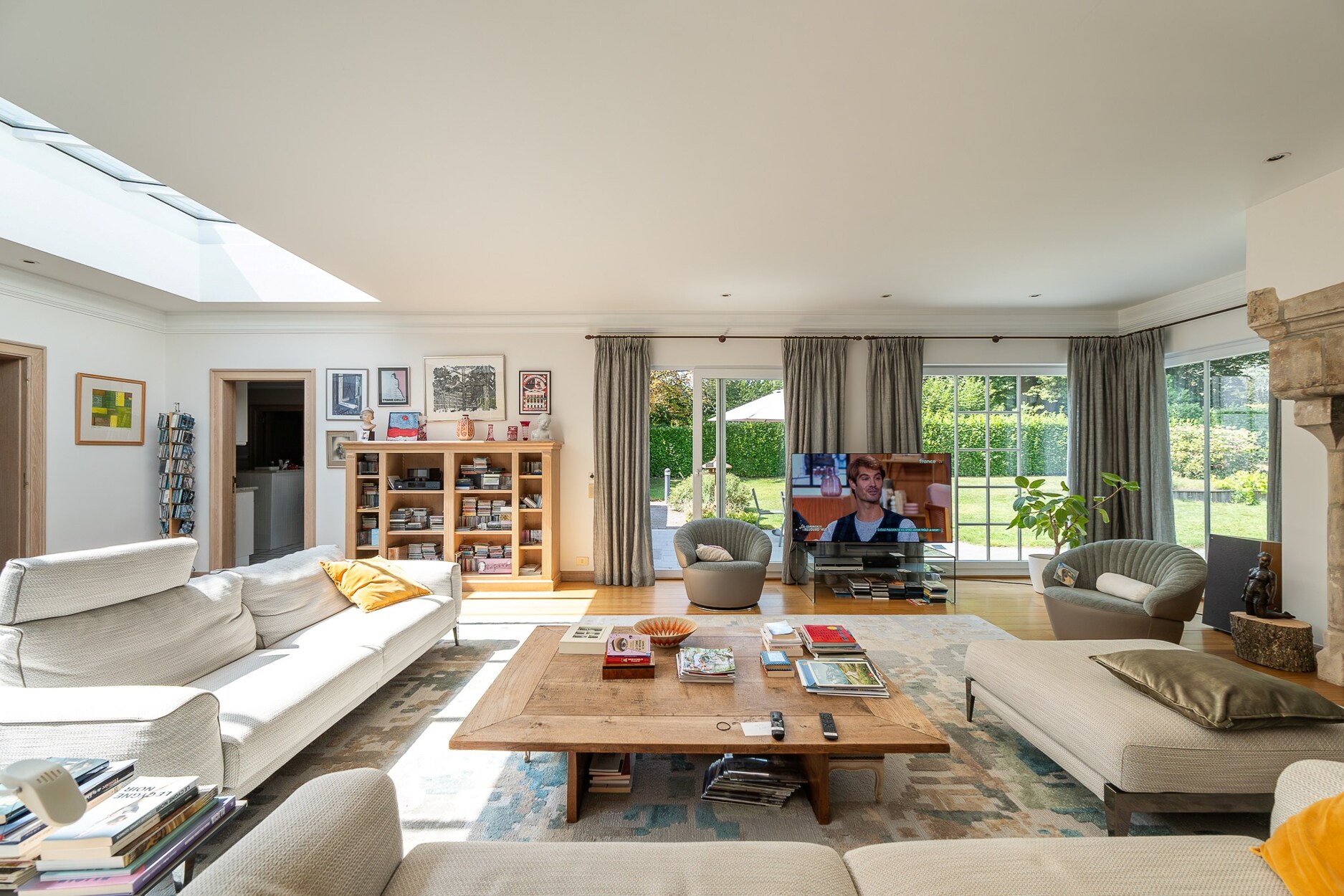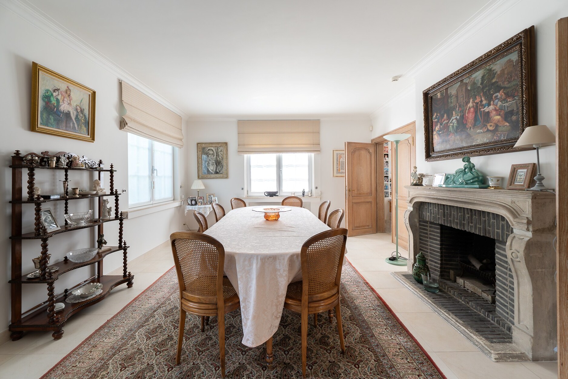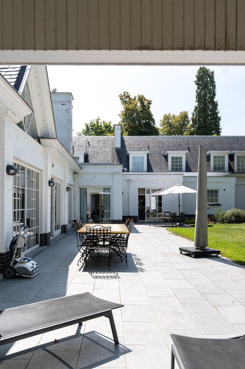 De inkomhal leidt naar de leefruimtes en een eerste slaapkamer met eigen badkamer op het gelijkvloers, ideaal voor wie gelijkvloers wil wonen of een professioneel gebruik wenst. De woonkamer met open haard is doorzon en geeft uit op de tuin. Aansluitend bevindt zich een aparte eetkamer en een volledig uitgeruste keuken met bijkeuken. Een bureau en bibliotheek vervolledigen dit niveau. Het binnenzwembad opent naar een overdekt terras met ingebouwde barbecue, sauna en douche.