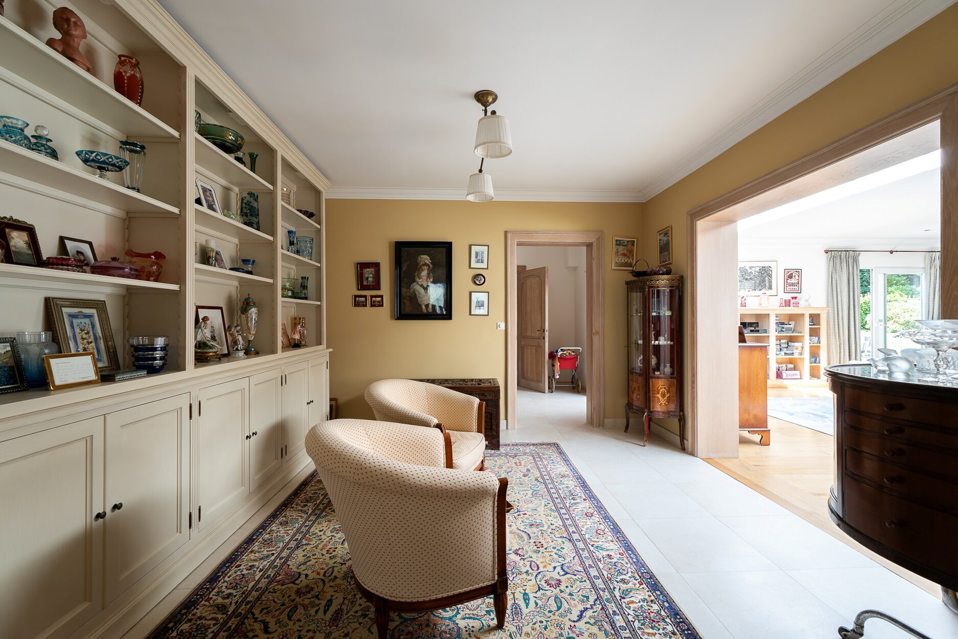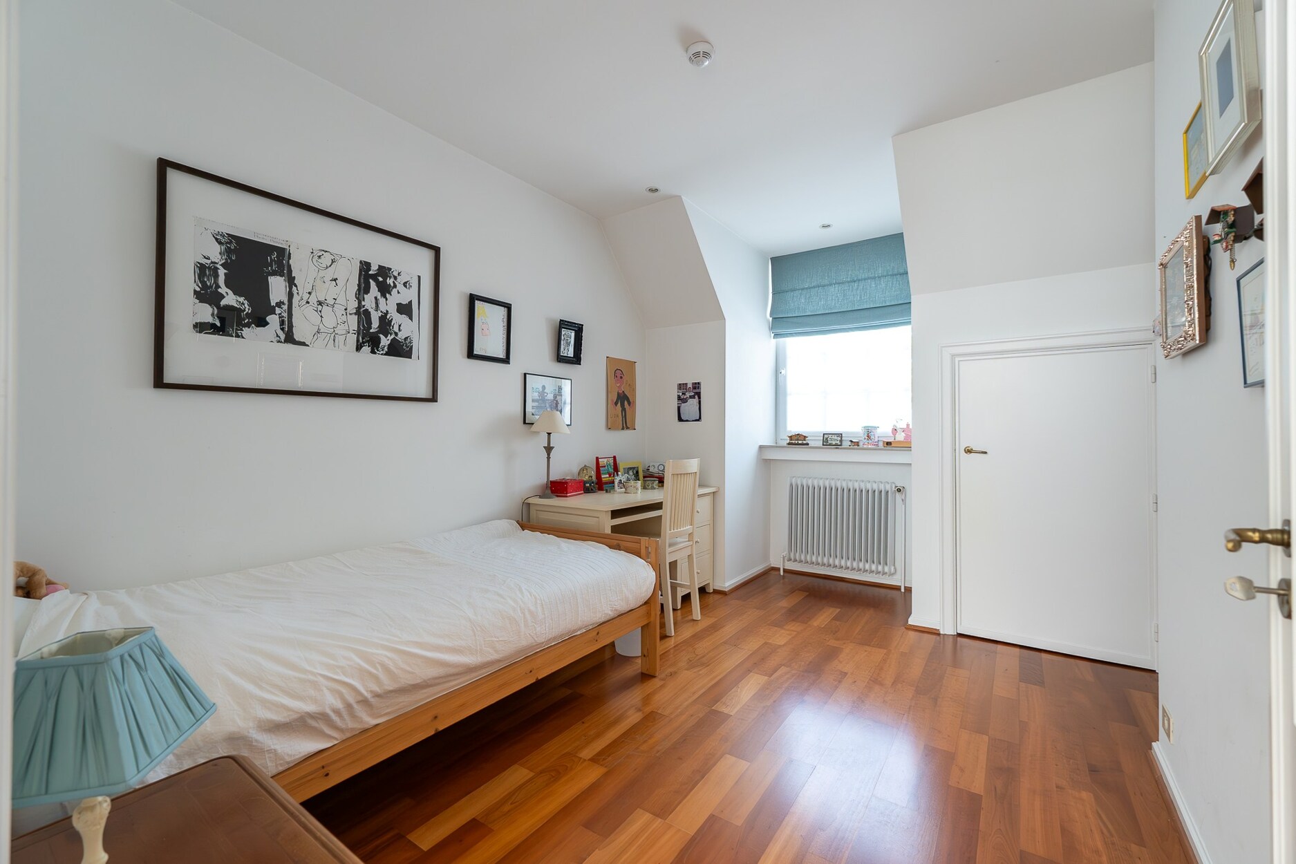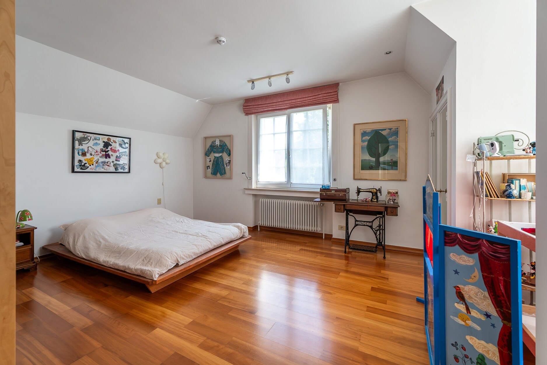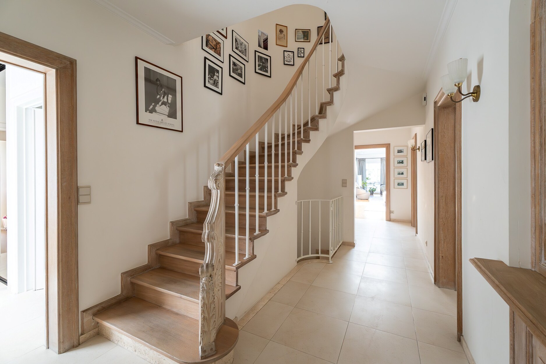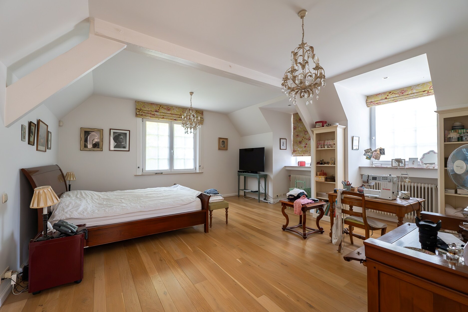 Op de bovenverdieping bevinden zich drie slaapkamers, elk met een eigen badkamer, waaronder een master suite met dressing. De kelderverdieping omvat meerdere bergruimtes, een wijnkelder en een dubbele garage.