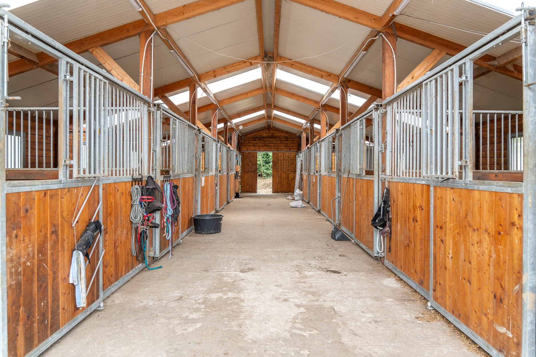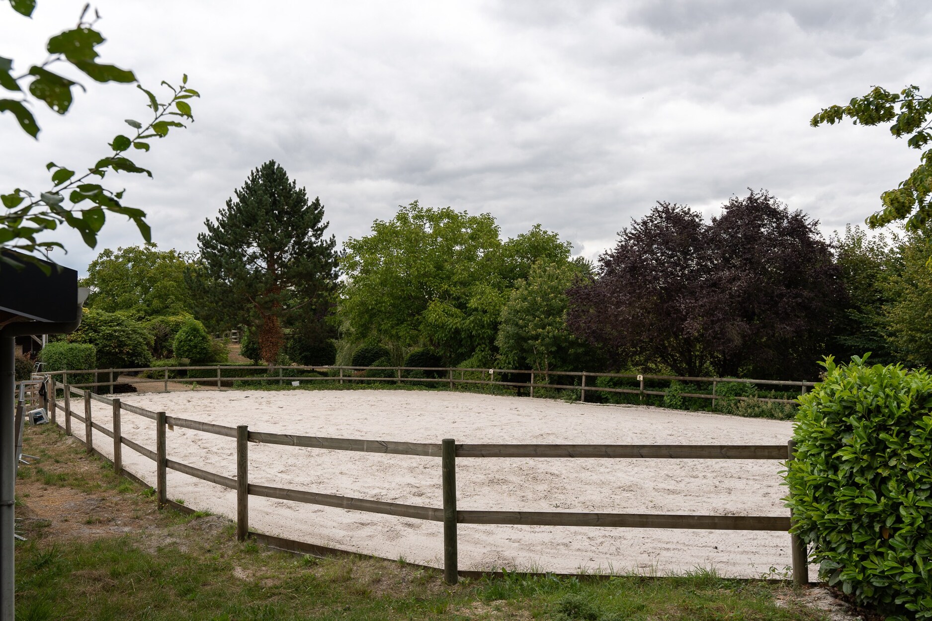 Het domein omvat ook een woonhuis, een schuur, een garage en een klein bos, wat een aangename en functionele woonomgeving biedt.