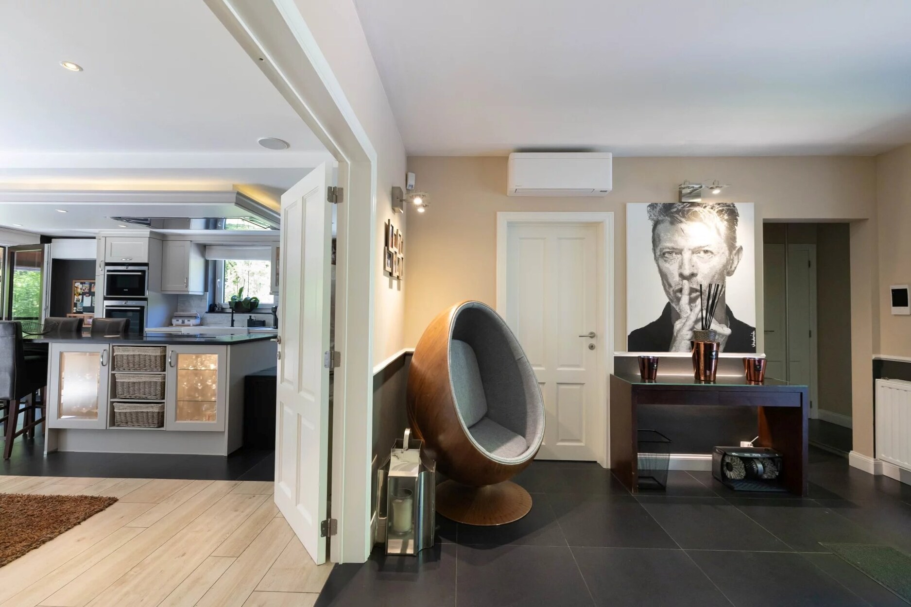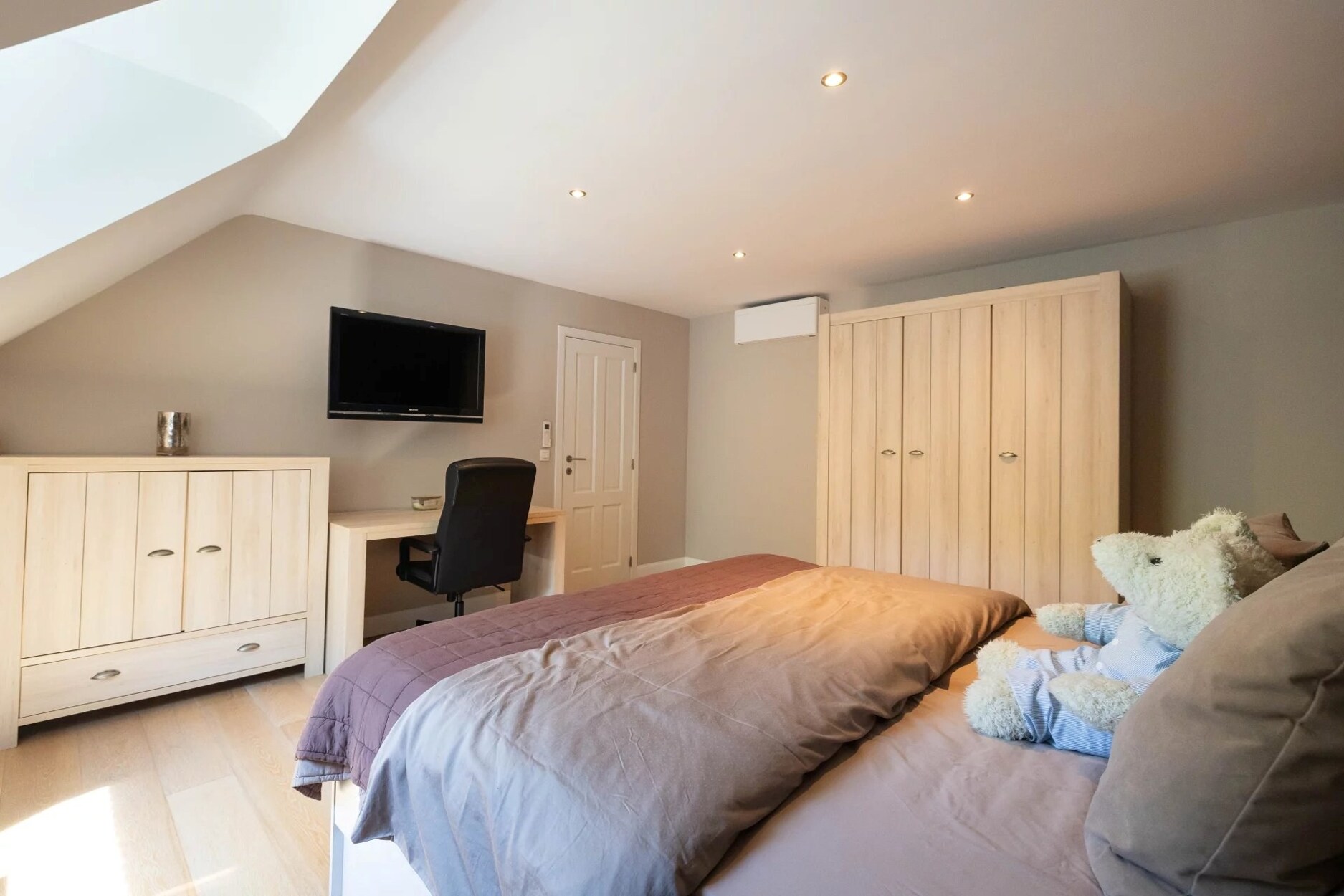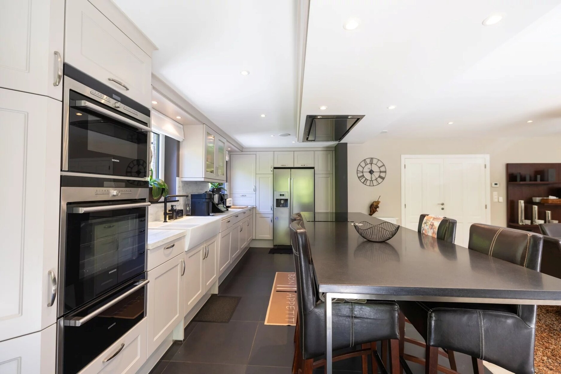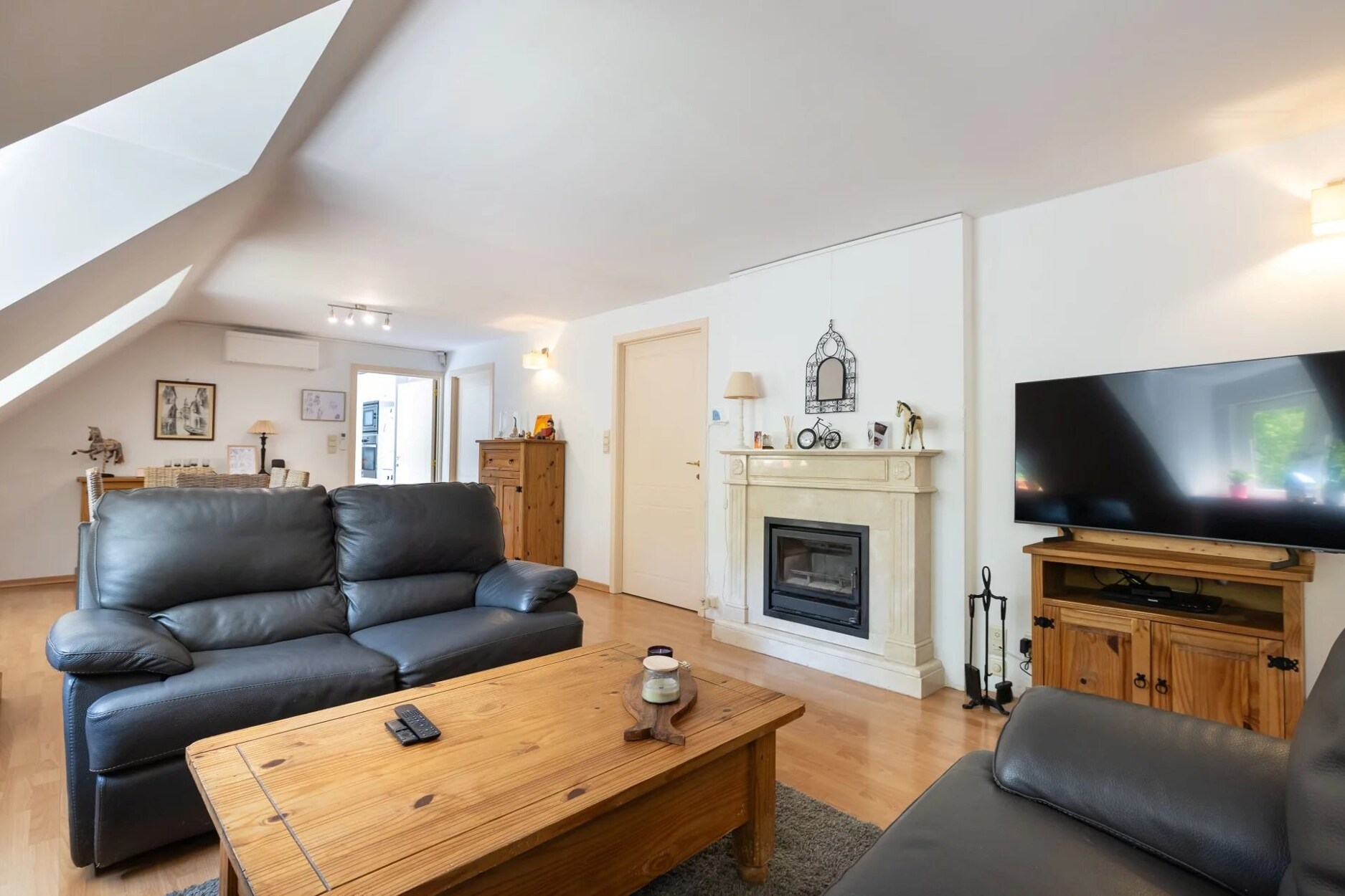 Op de begane grond is er een woonkamer van ± 90 m² met een open ingerichte keuken, een wintertuin met open haard, een ruim kantoor, een wasruimte en toilet. De bovenverdieping heeft drie lichte slaapkamers, een badkamer en een ouderlijke suite met kleedkamer en badkamer. Alle kamers zijn voorzien van omkeerbare airconditioning. Het zelfstandig appartement heeft een woonkamer, keuken, terras, wasruimte en zolder.