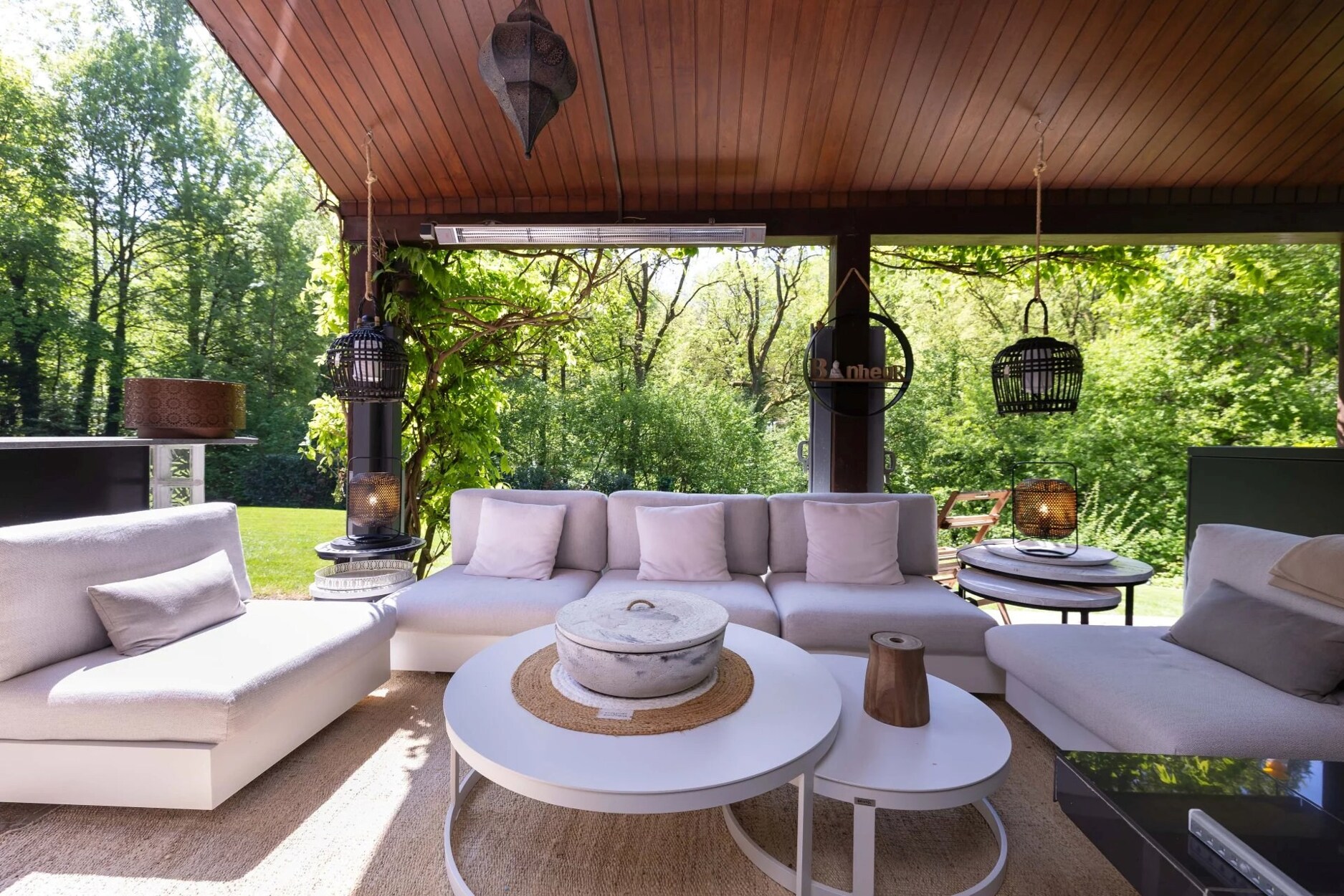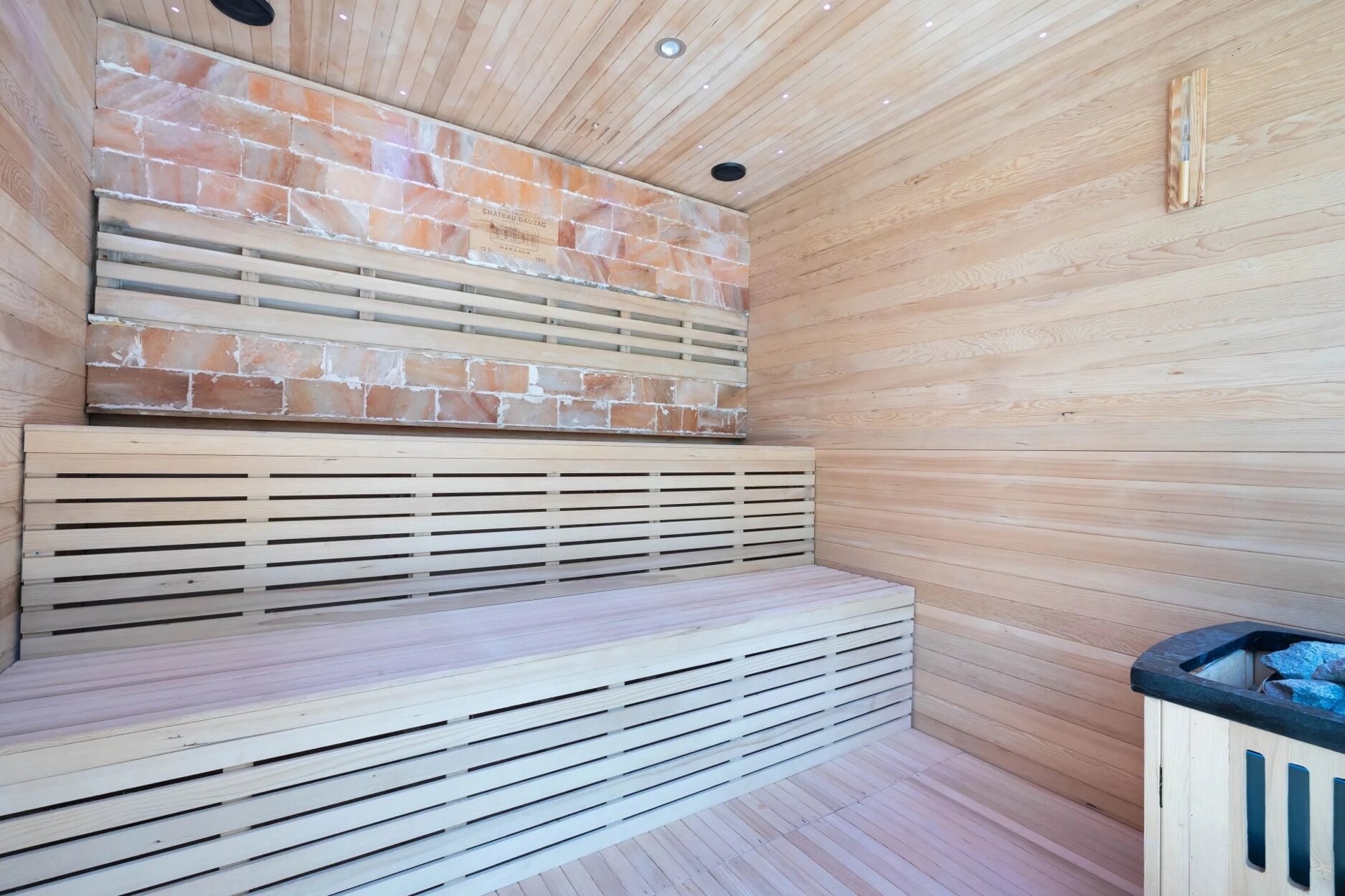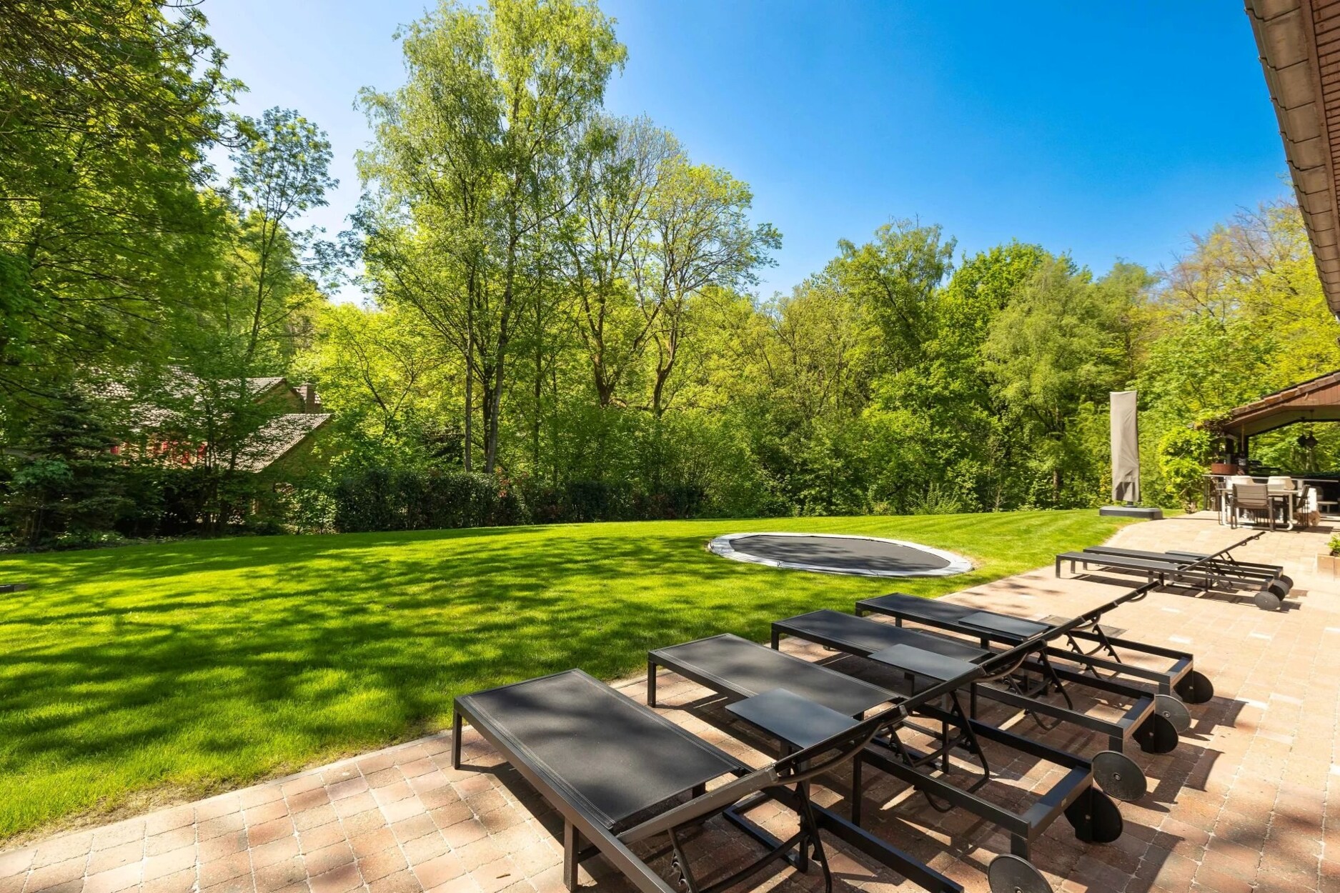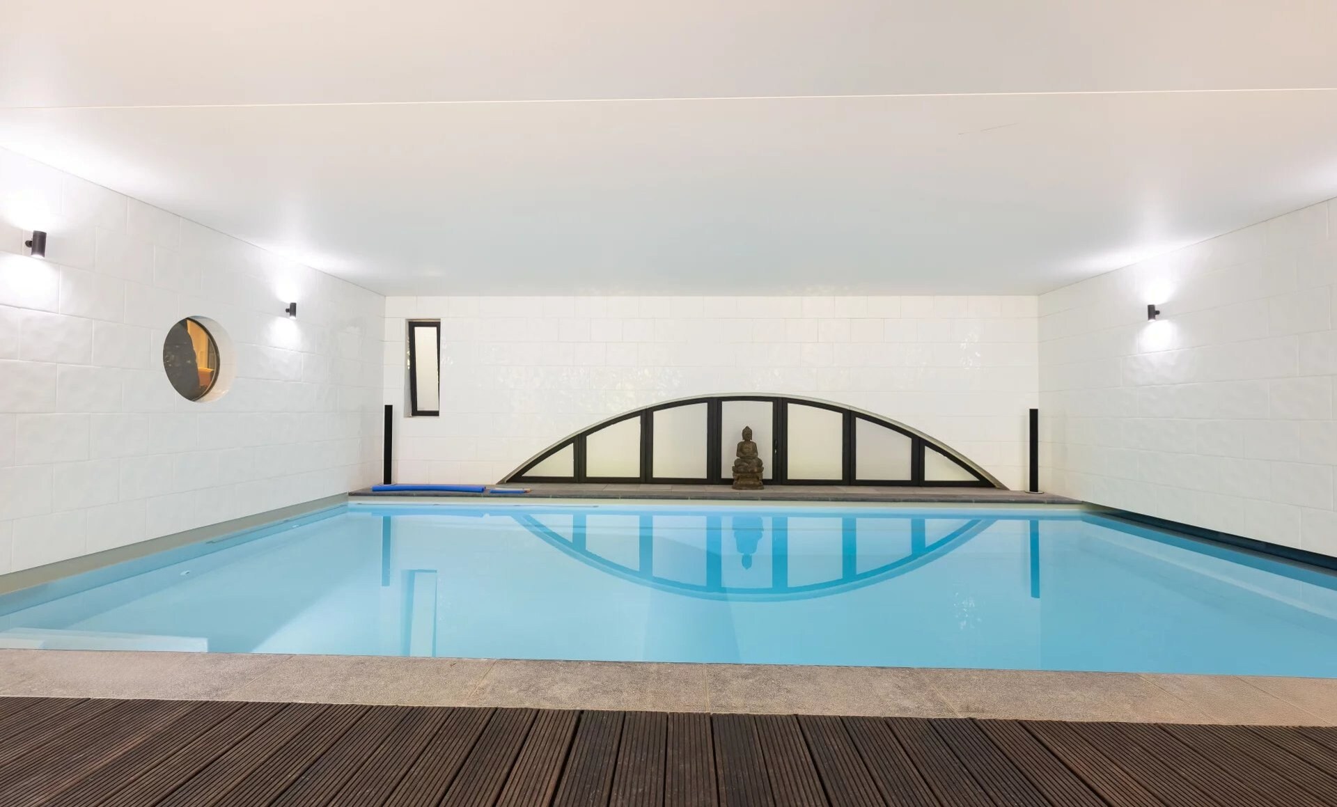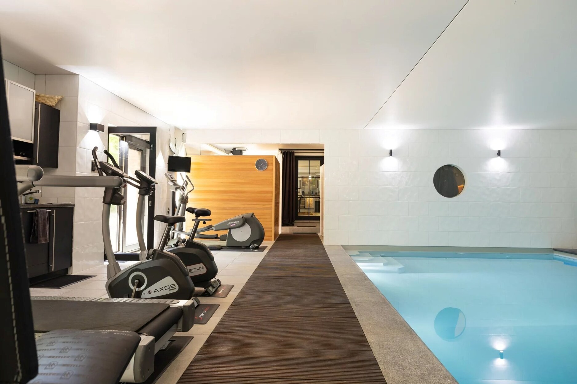 De wellnessruimte bestaat uit een verwarmd zwembad (11 x 5,5 m), sauna, volledig uitgeruste fitnessruimte en zomerkeuken. Buiten is er een zuidelijk gelegen terras van ± 106 m² met overdekte lounge, bar en barbecue voor een gezellige sfeer.