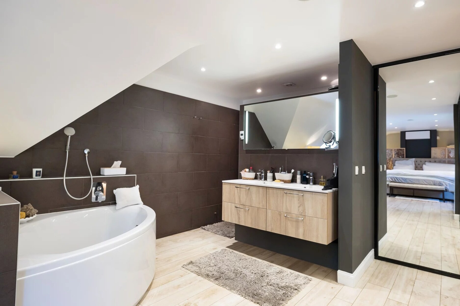 Verscholen in het hart van het Bois du Hautmont, op een bebost terrein van ± 75 are, ontwikkelt deze volledig gerenoveerde Brabantse villa uit 2022 en 2024 een bruto oppervlakte van ongeveer 800 m². Het bestaat uit 4 slaapkamers, 2 badkamers en een zelfstandig appartement van ± 100 m² met 2 slaapkamers, een badkamer en een eigen ingang (ideaal voor een vrij beroep, conciërge).
