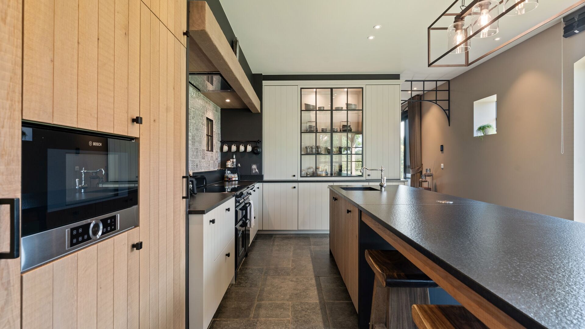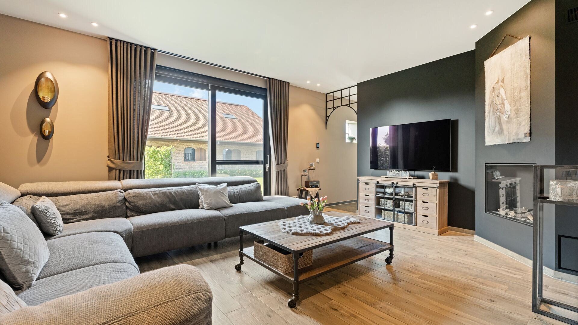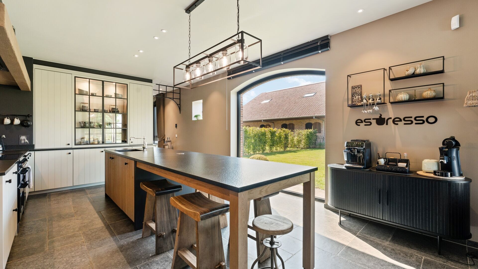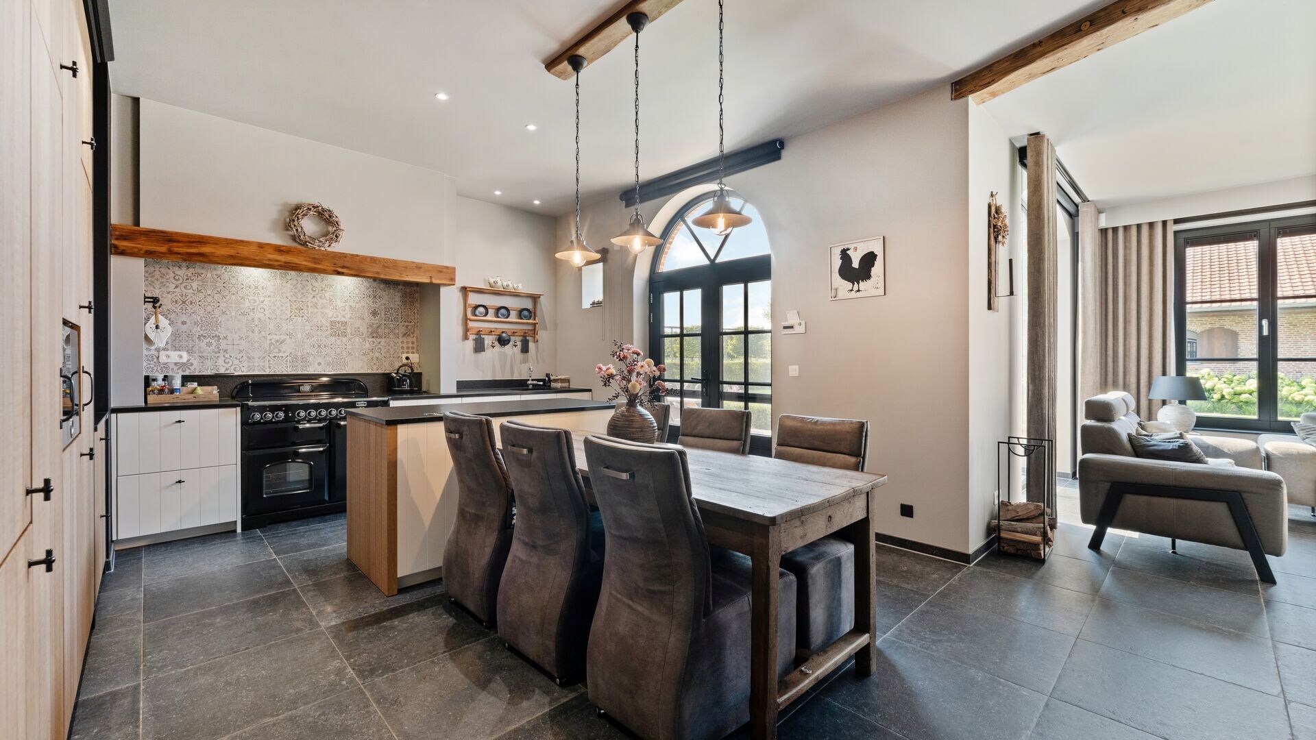 Via de inkomhal betreedt u de royale leefruimte, die aansluit op een gezellige leeshoek en een keuken. De keuken is volledig uitgerust met moderne toestellen en biedt een prachtig uitzicht op de tuin en de paardenstallen. Aansluitend bevindt zich een overdekt terras, ideaal om te genieten van warme zomeravonden. De keuken biedt een ontbijthoek aan het kookeiland.