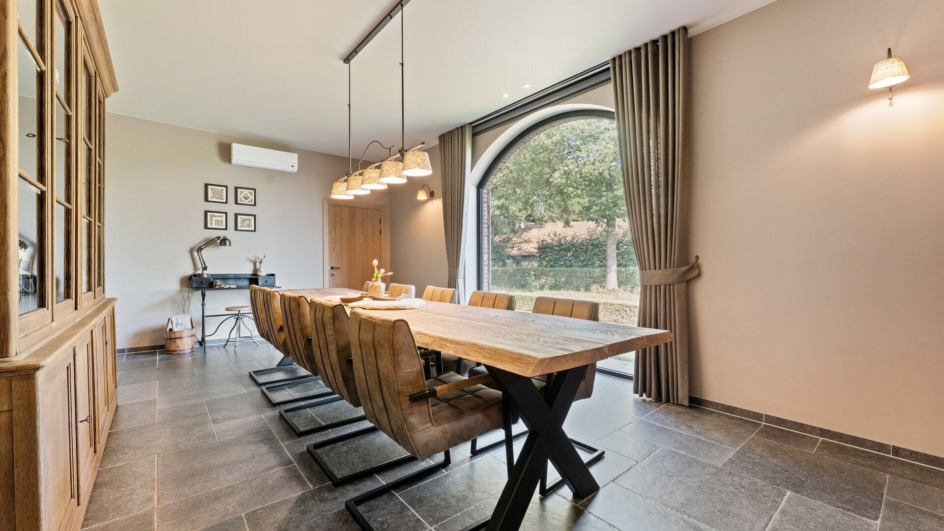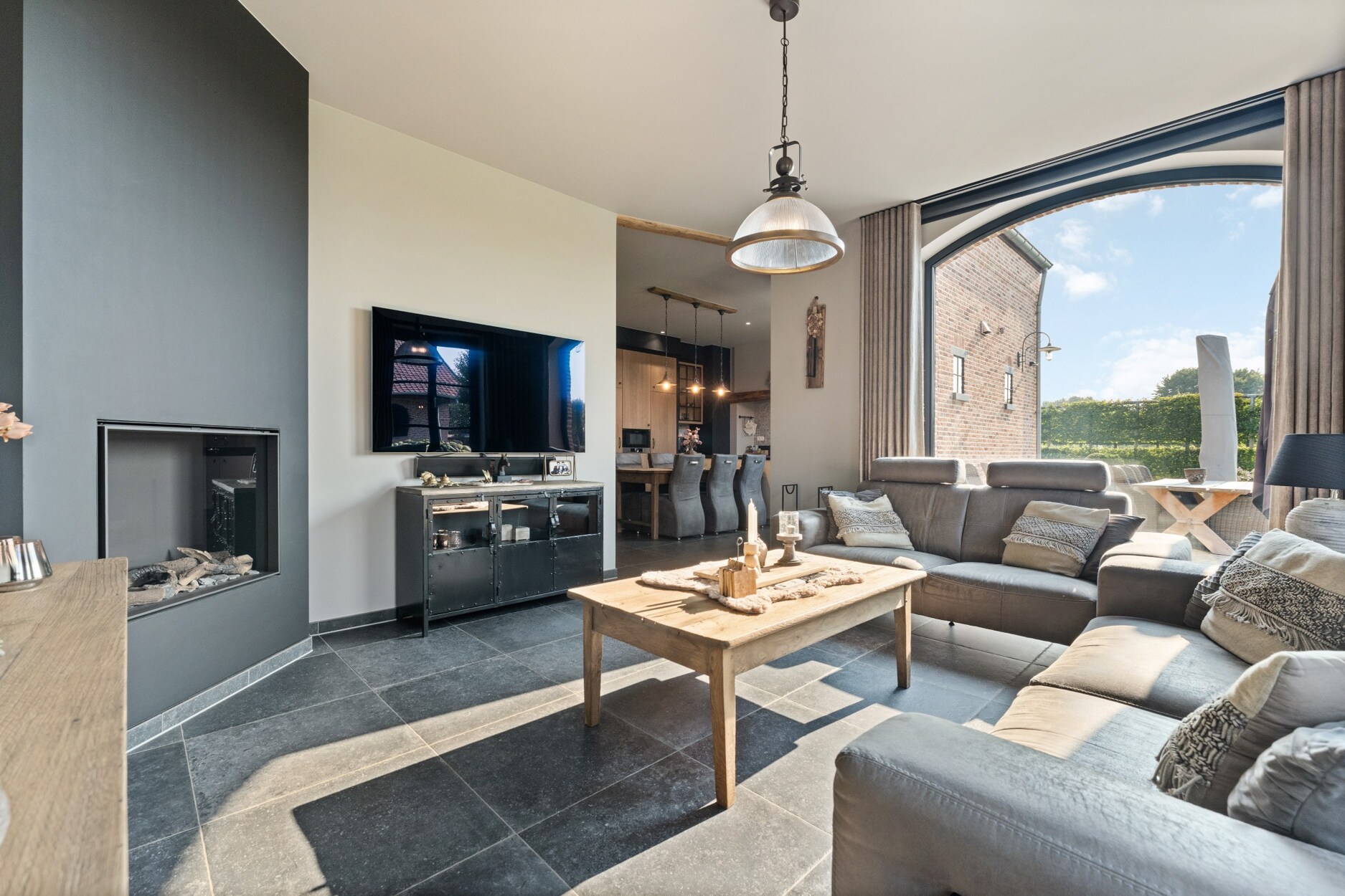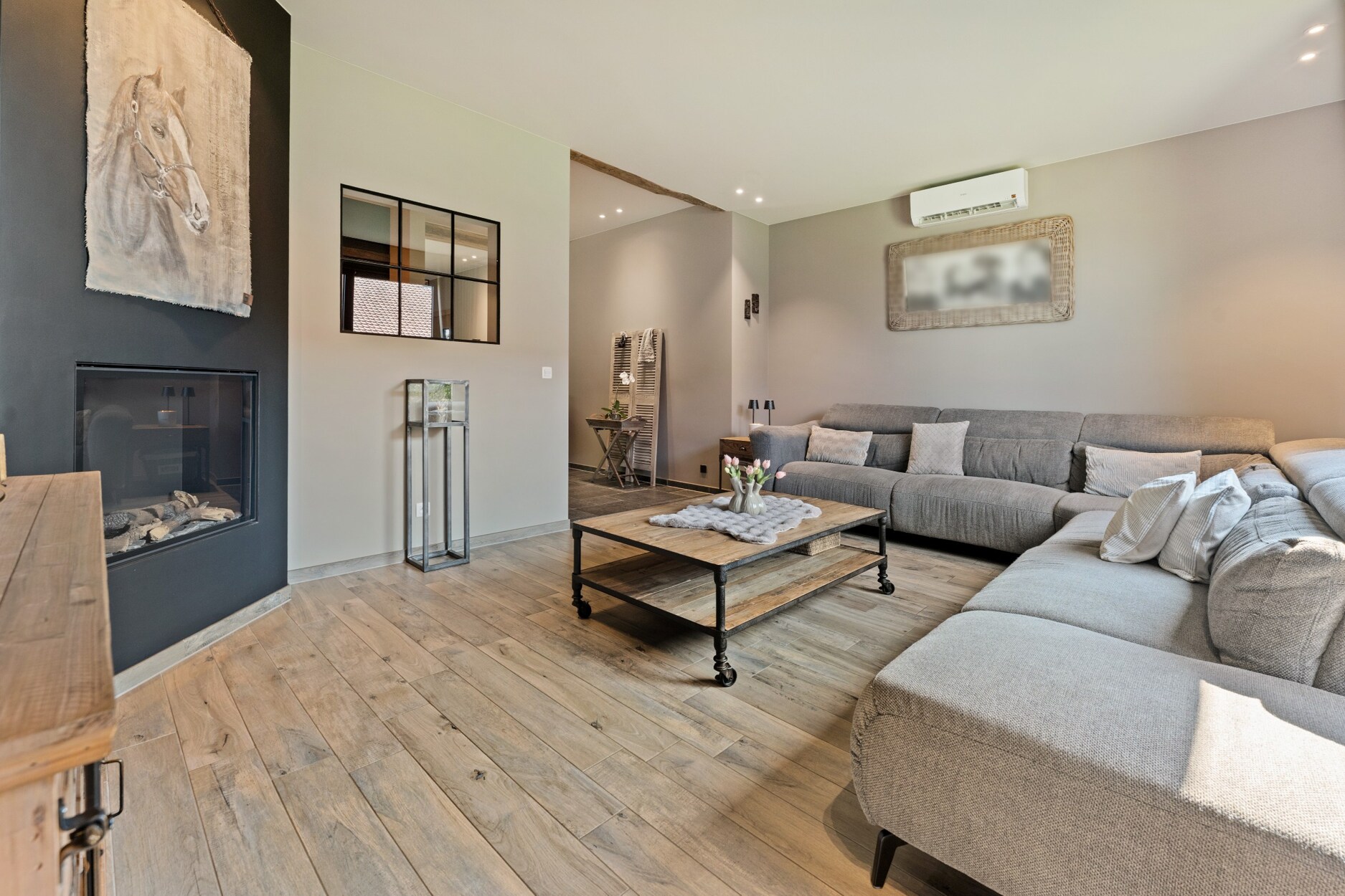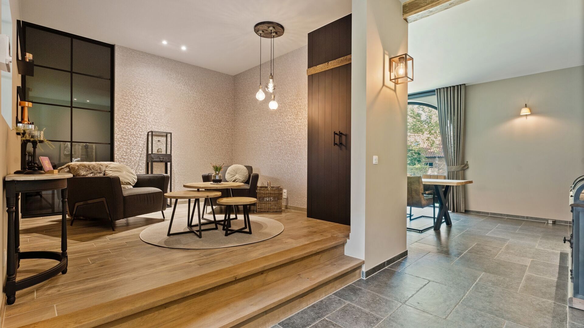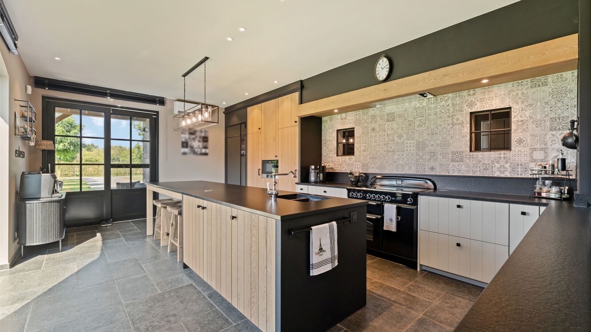 Via de inkomhal betreedt u de royale leefruimte, die aansluit op een gezellige leeshoek en een keuken. De keuken is volledig uitgerust met moderne toestellen en biedt een prachtig uitzicht op de tuin en de paardenstallen. Aansluitend bevindt zich een overdekt terras, ideaal om te genieten van warme zomeravonden. De keuken biedt een ontbijthoek aan het kookeiland.
