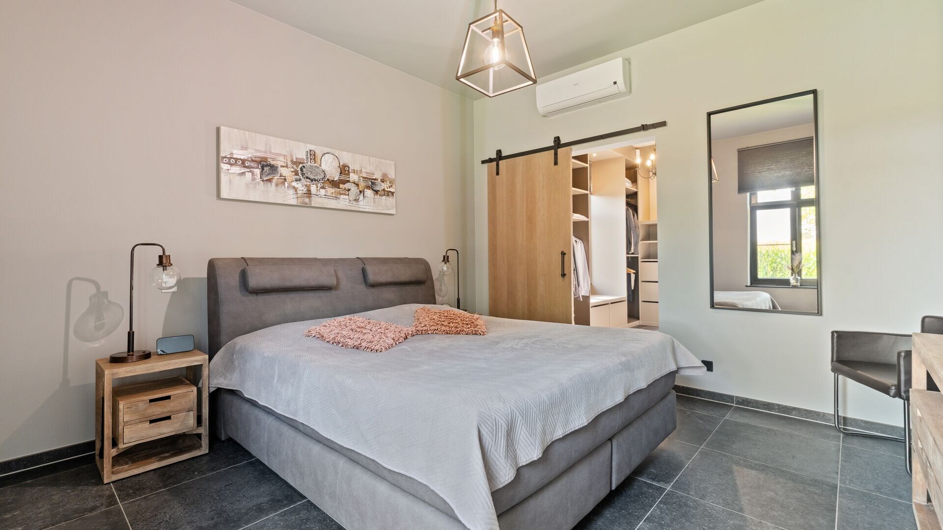 Verder vinden we op het gelijkvloers een aparte bureauruimte (of multifunctionele kamer), een ruime slaapkamer met dressing en een luxueuze badkamer voorzien van dubbele lavabo, inloopdouche, bad en toilet. Ook is er een aparte wasruimte met plaats voor wasmachine en droogkast.
