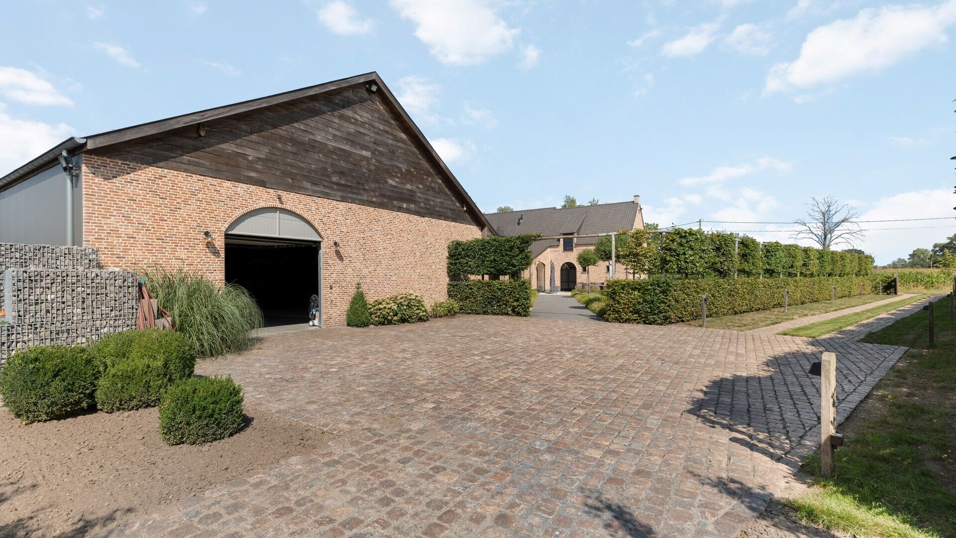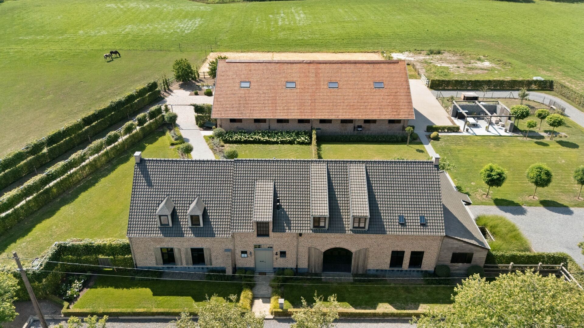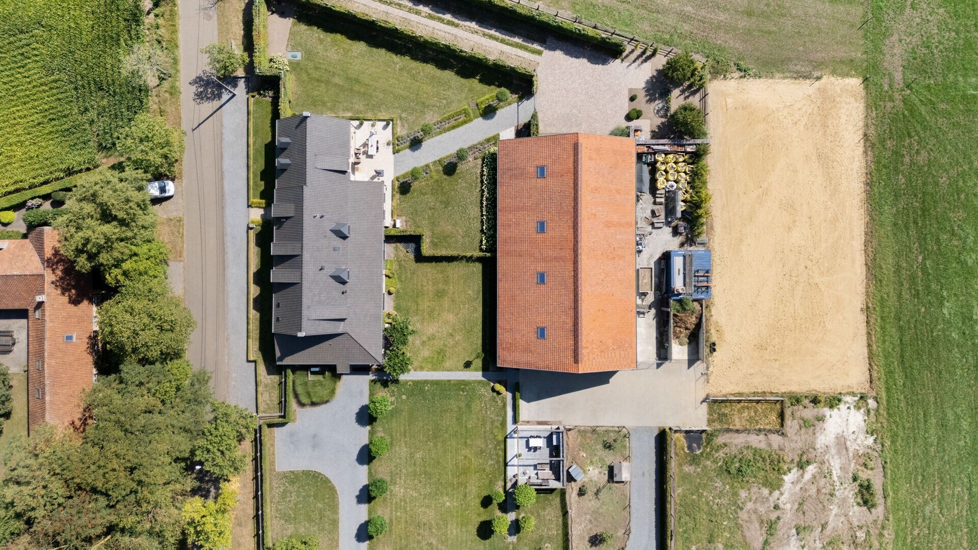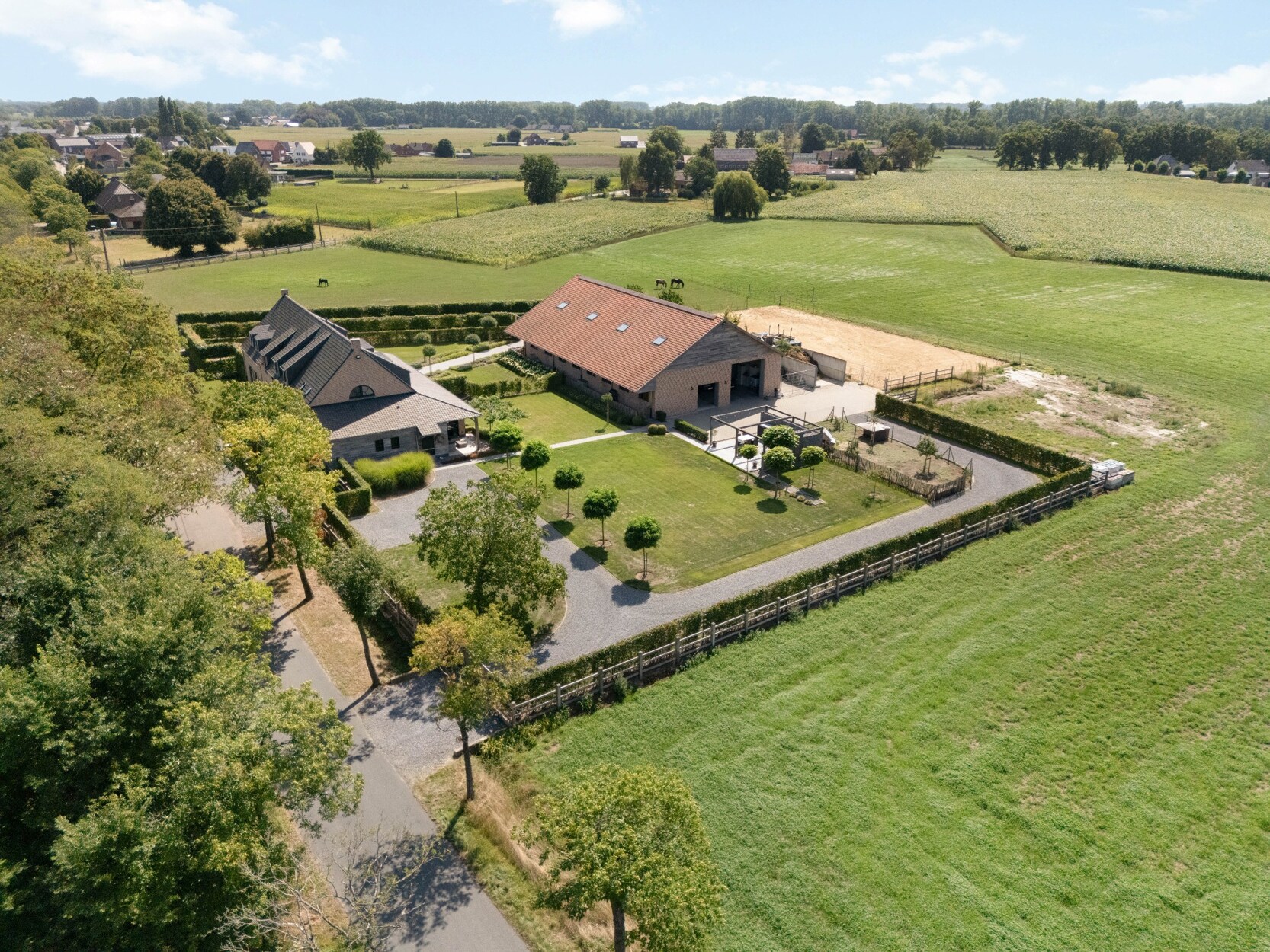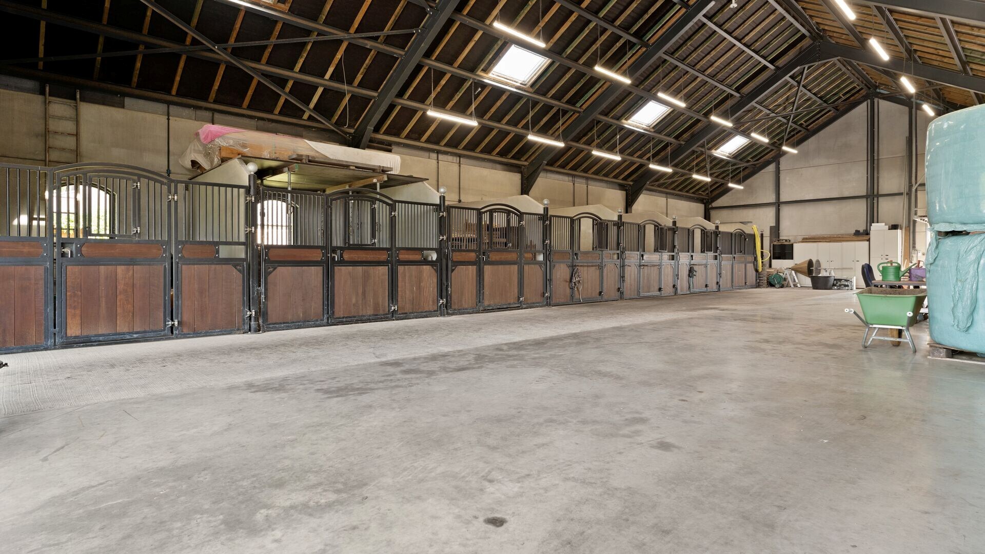 Het bijgebouw, volledig in dezelfde stijl als de woning, is ingericht met 7 paardenstallen en een wasplaats. De loods beschikt over automatische poorten en is toegankelijk met een camion – ideaal voor zelfstandigen of professionelen in de paardenwereld. Buitenshuis bevindt zich bovendien een buitenpiste.