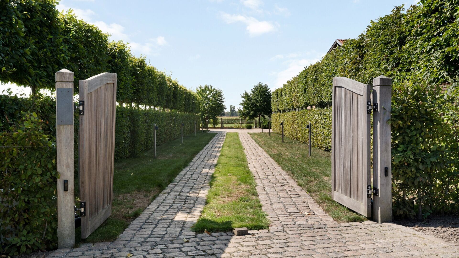 De tuin is volledig aangelegd en beschikt over twee aparte opritten met automatische poorten. Achteraan is een groot terras voorzien.