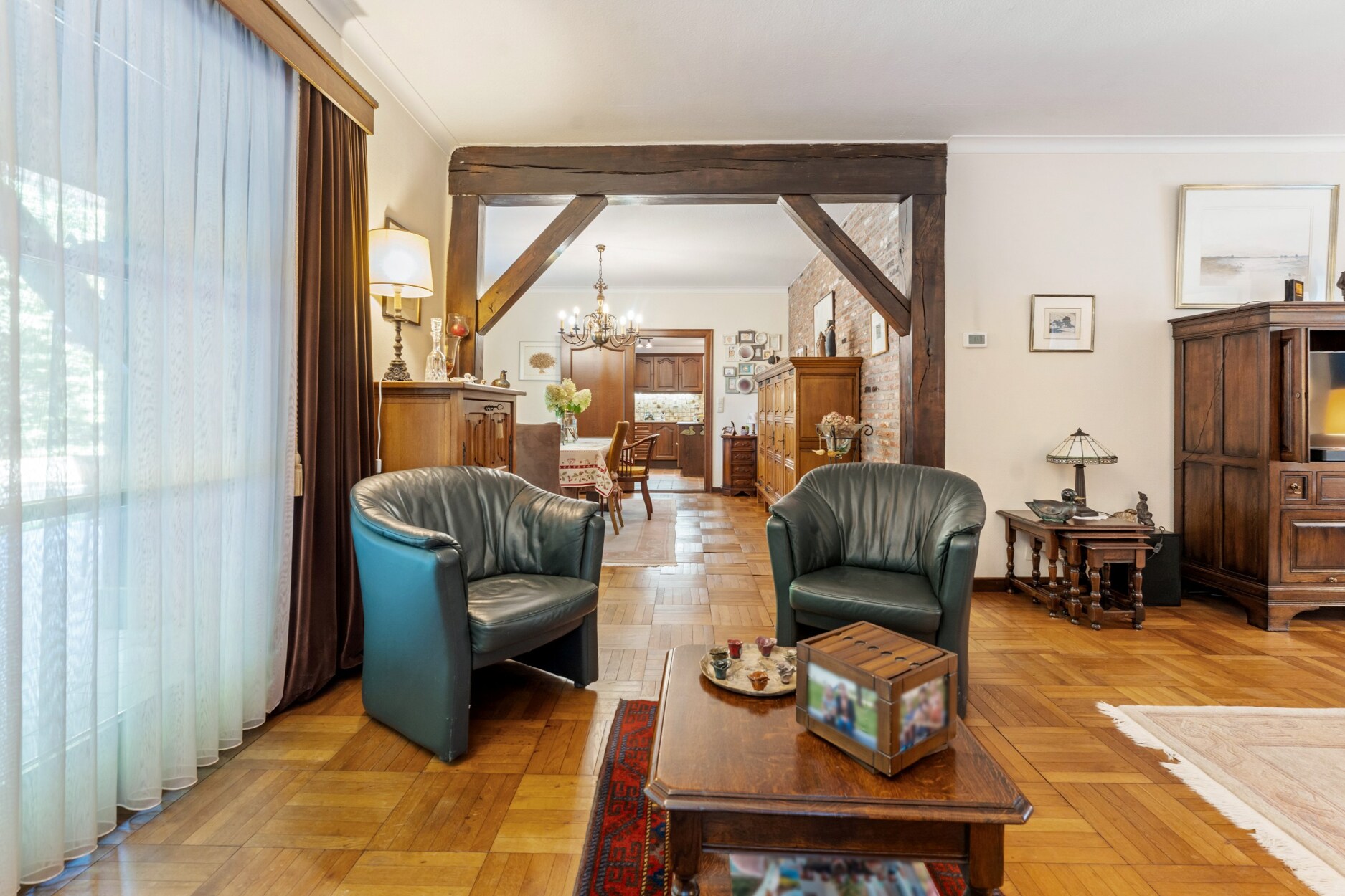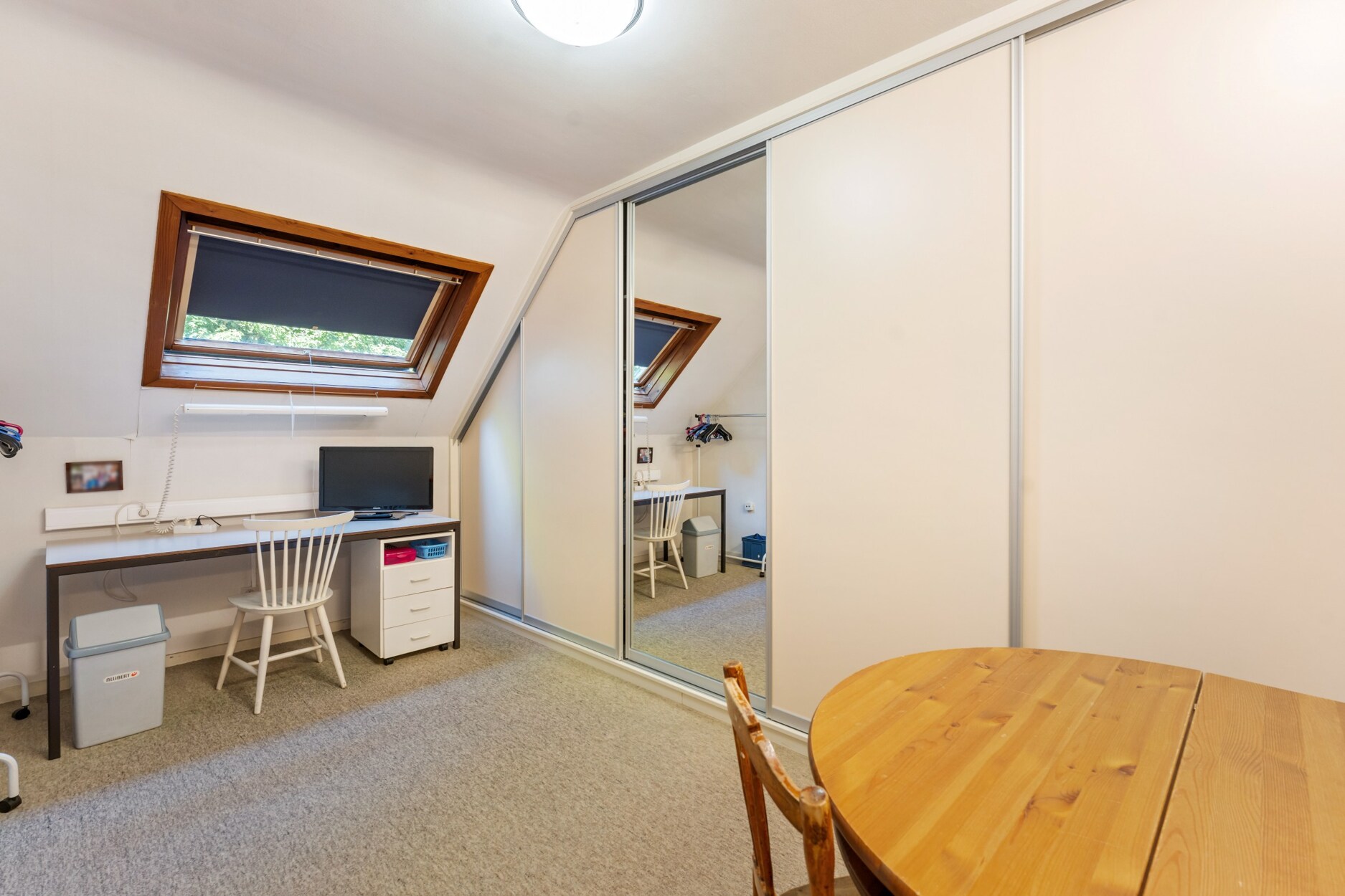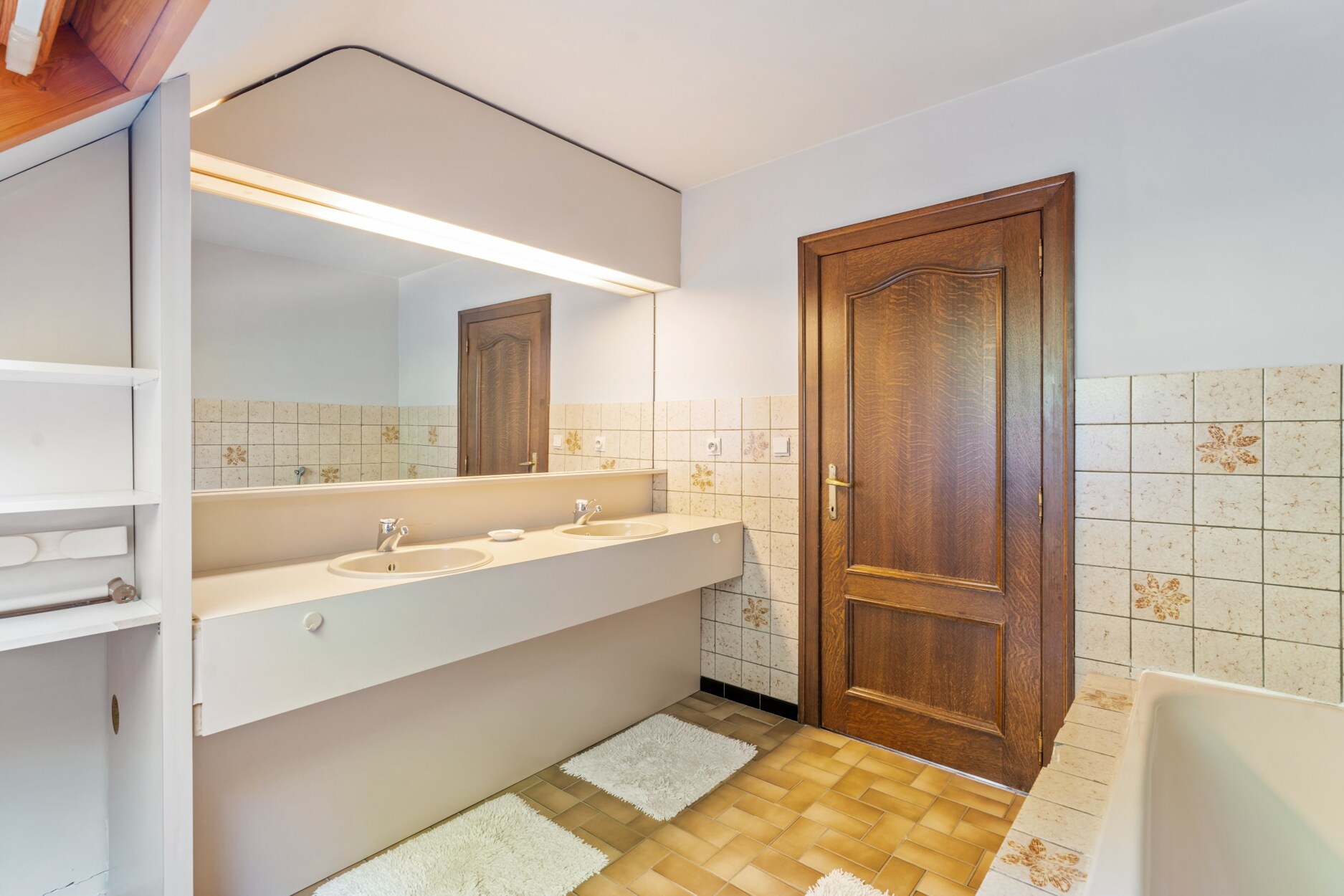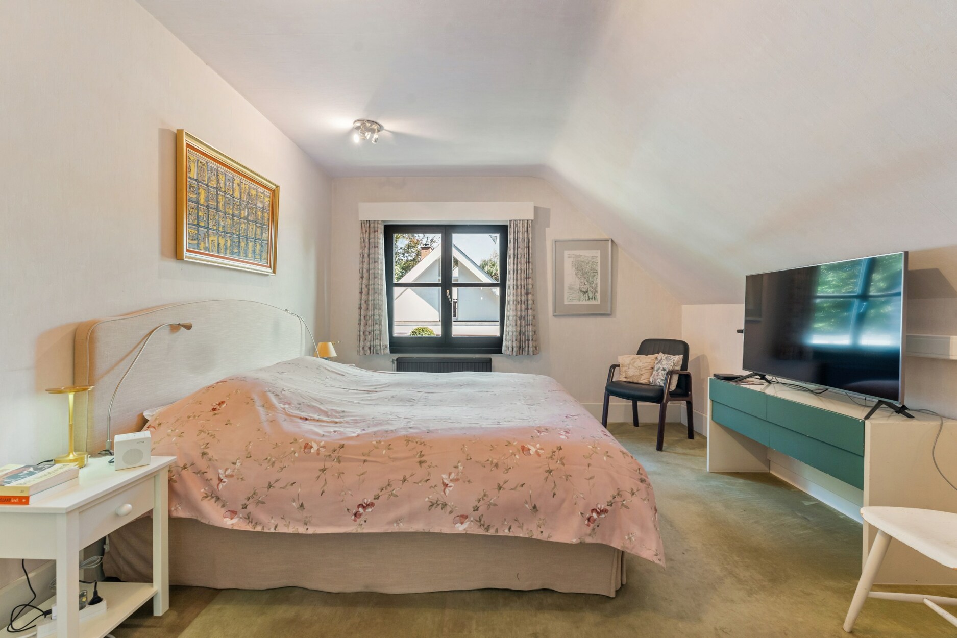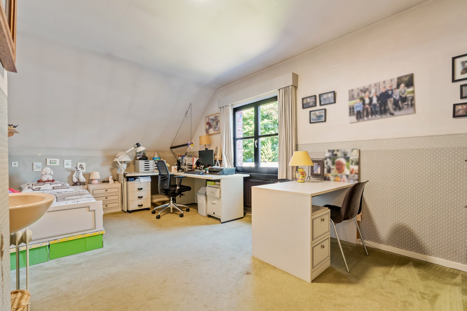De leefruimtes zijn lichtrijk en logisch ingedeeld, met een ruime keuken die uitkijkt op de tuin. Aanpalend bevindt zich een praktische bijkeuken, ideaal als extra berg- of werkruimte. Daarnaast zijn er nog tal van opbergmogelijkheden, waaronder een dubbele garage en een bergzolder, toegankelijk via een uitschuifbare trap. De woning beschikt verder over 5 volwaardige slaapkamers en 2 badkamers, waarvan de master bedroom een en-suite badkamer heeft.