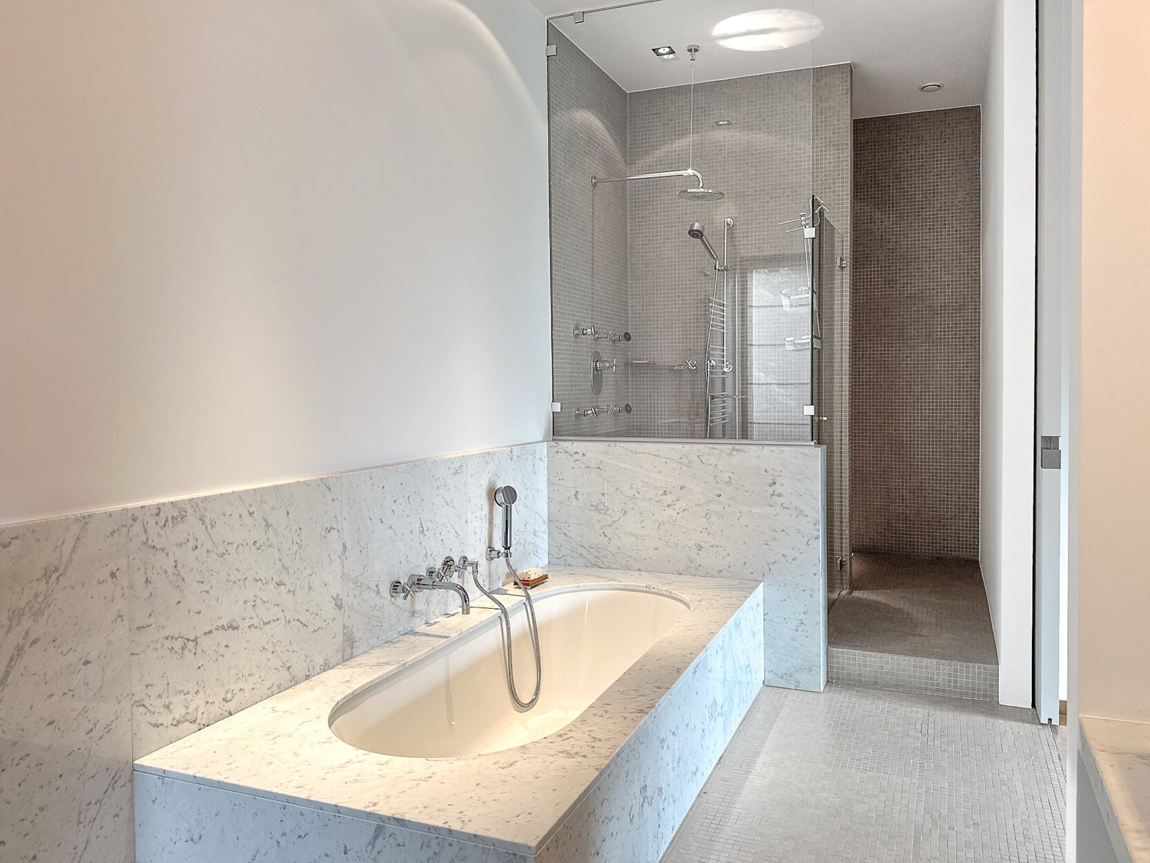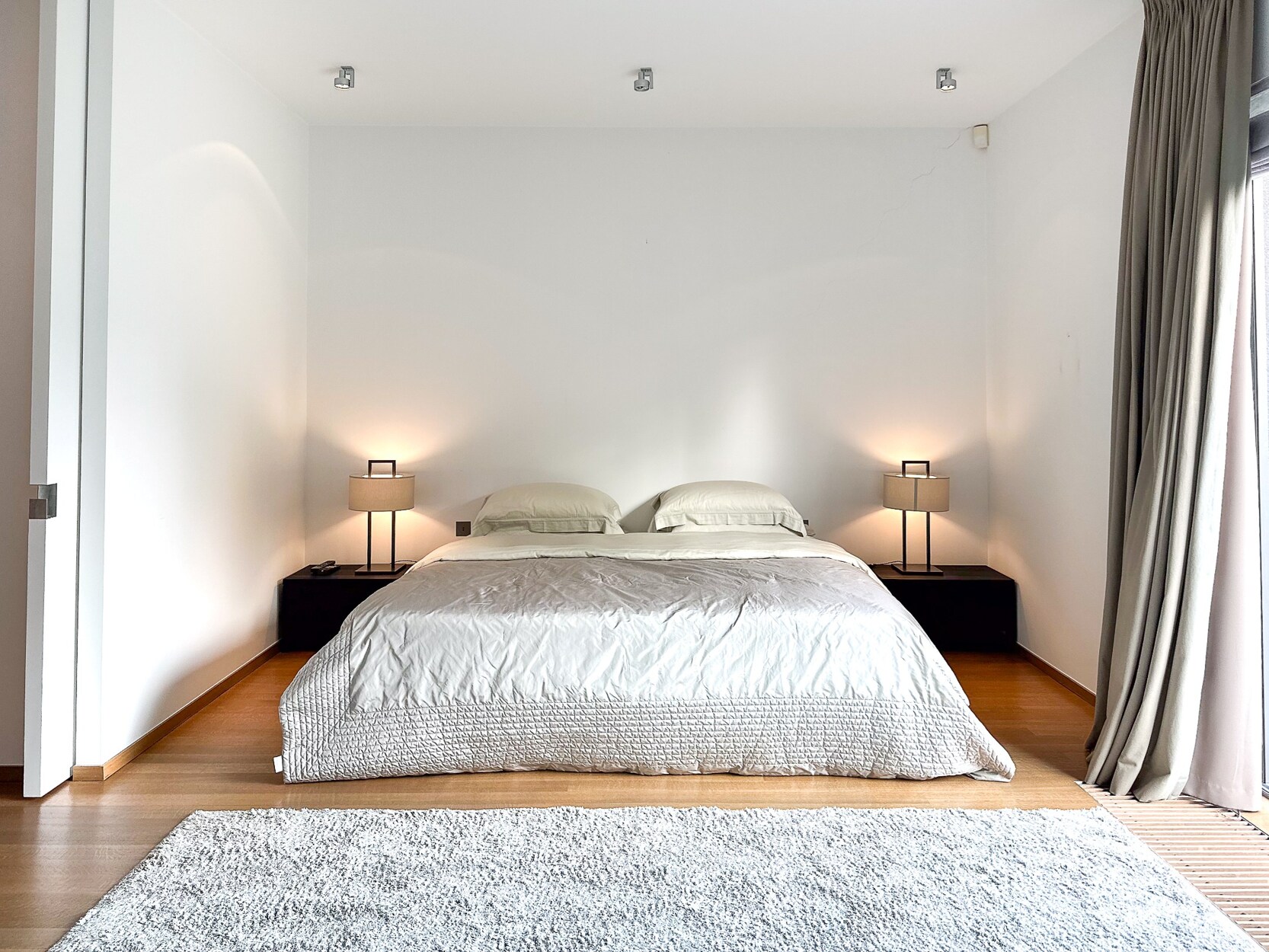 De bovenverdieping herbergt een ruime oudersuite van 60 m², inclusief een kleedkamer en een privébadkamer, die een serene toevluchtsoord biedt. Twee en-suite slaapkamers, elk met eigen badkamer, en twee extra slaapkamers die een badkamer delen, garanderen comfort en privacy. Een prachtig terras van 100 m² bekroont de verdieping en nodigt uit tot ontspanning in de buitenlucht.