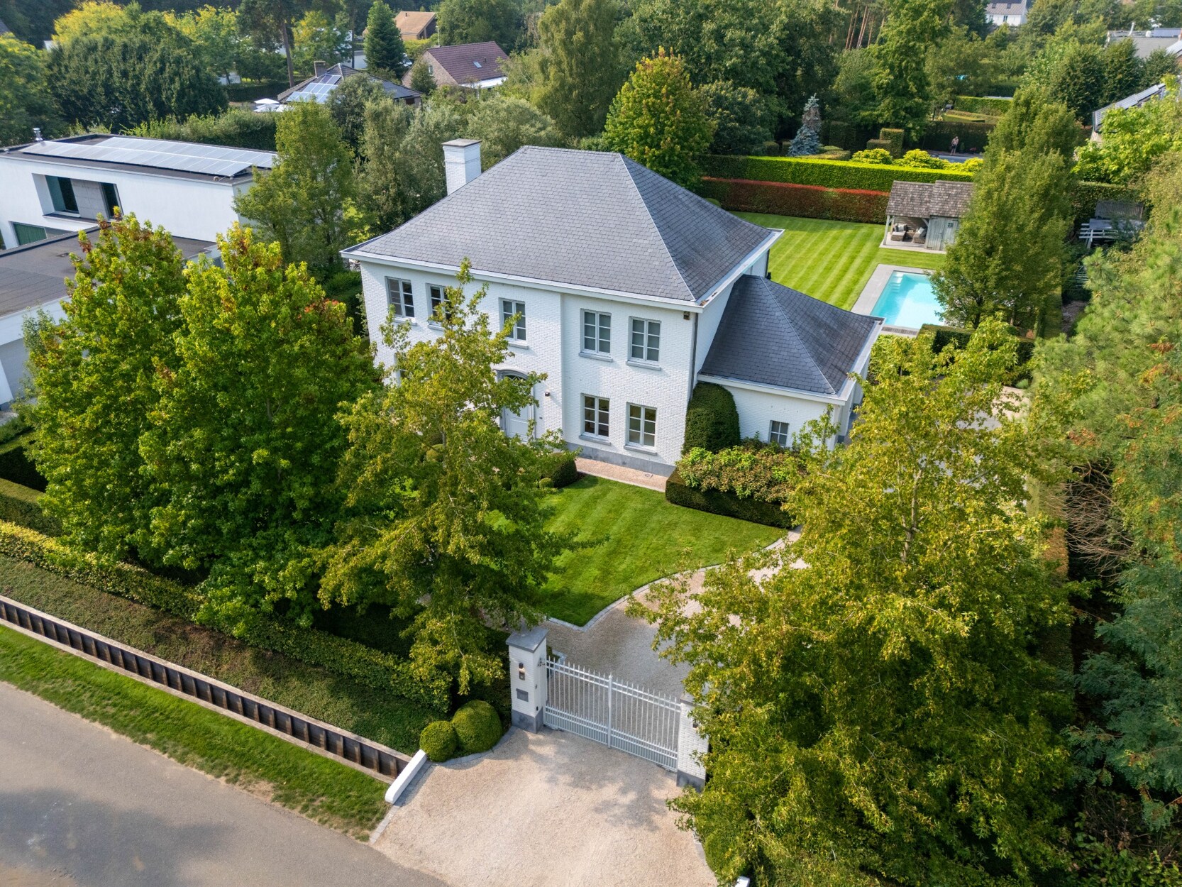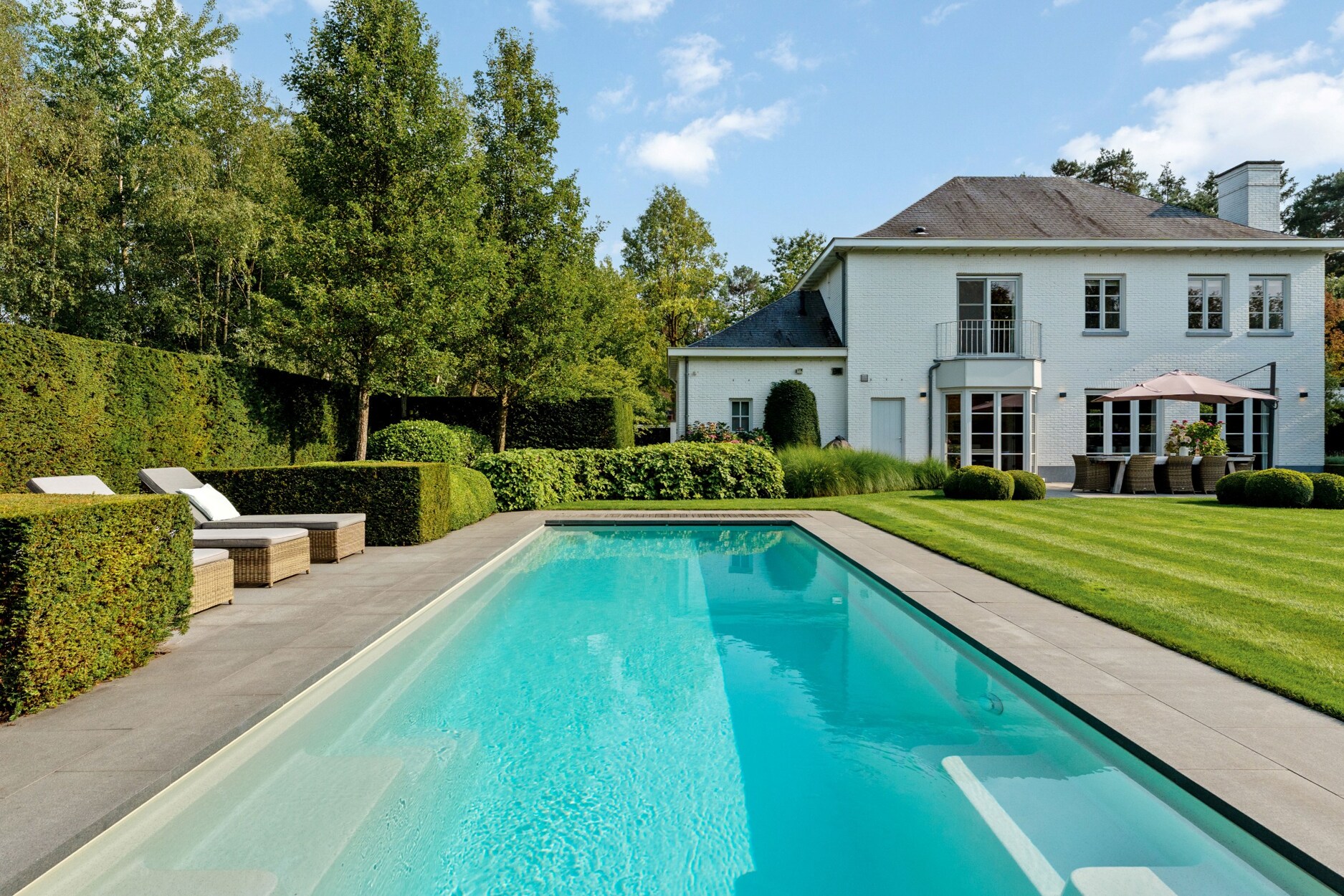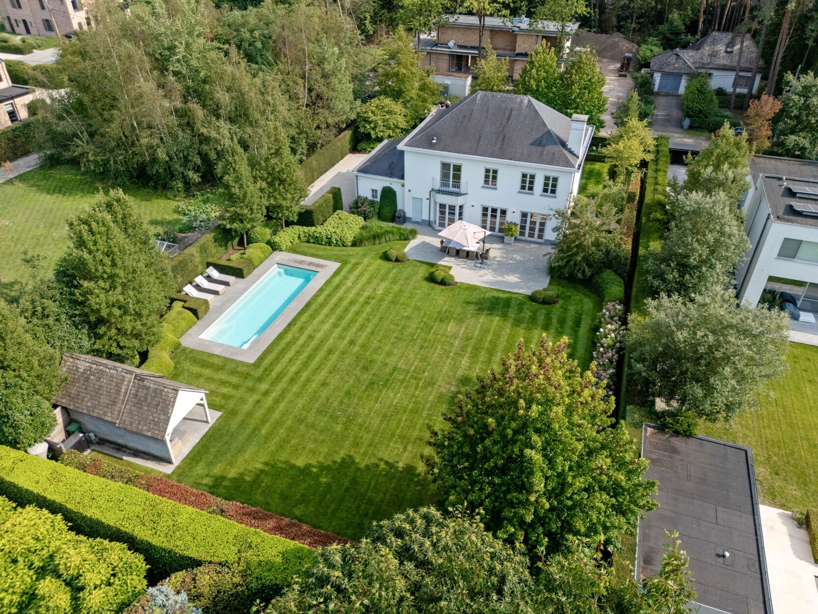 De buitenruimte is een oase van rust en ontspanning waar u in alle privacy kan genieten zonder inkijk. De prachtig aangelegde tuin is uitgerust met een automatisch irrigatiesysteem, sproei-installatie en tuinverlichting doorheen gans de tuin. Het verwarmde monobloc zwembad, aangedreven door een warmtepomp, nodigt uit tot verfrissing en ontspanning. Door de ligging van het zwembad kan u hier genieten van de zon vanaf de late ochtend tot zonsondergang. Achteraan de tuin bevindt zich bovendien een charmant poolhouse, ideaal voor gezellige momenten met familie en vrienden.