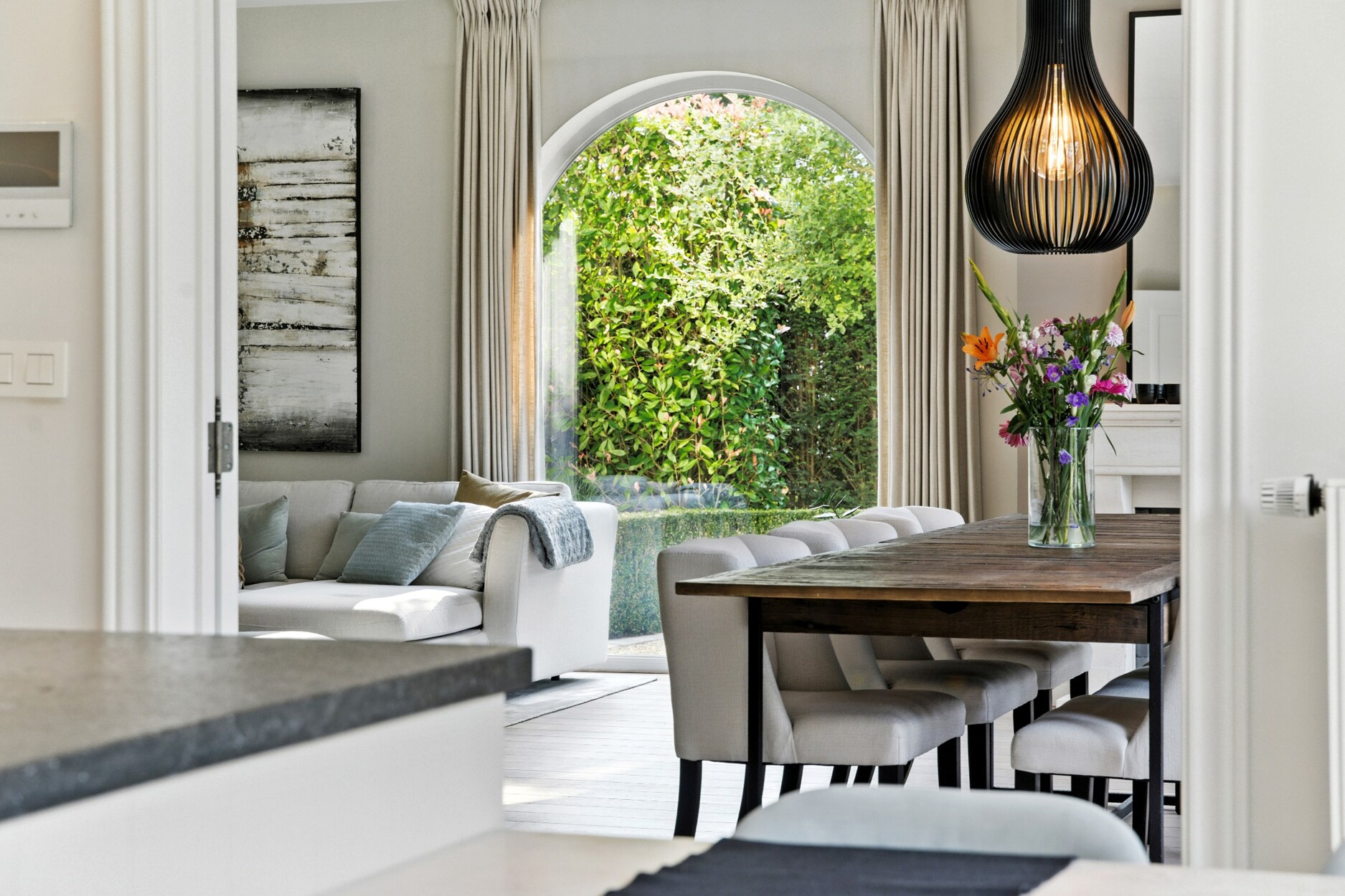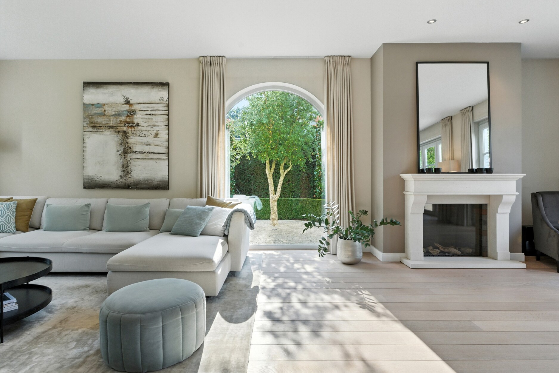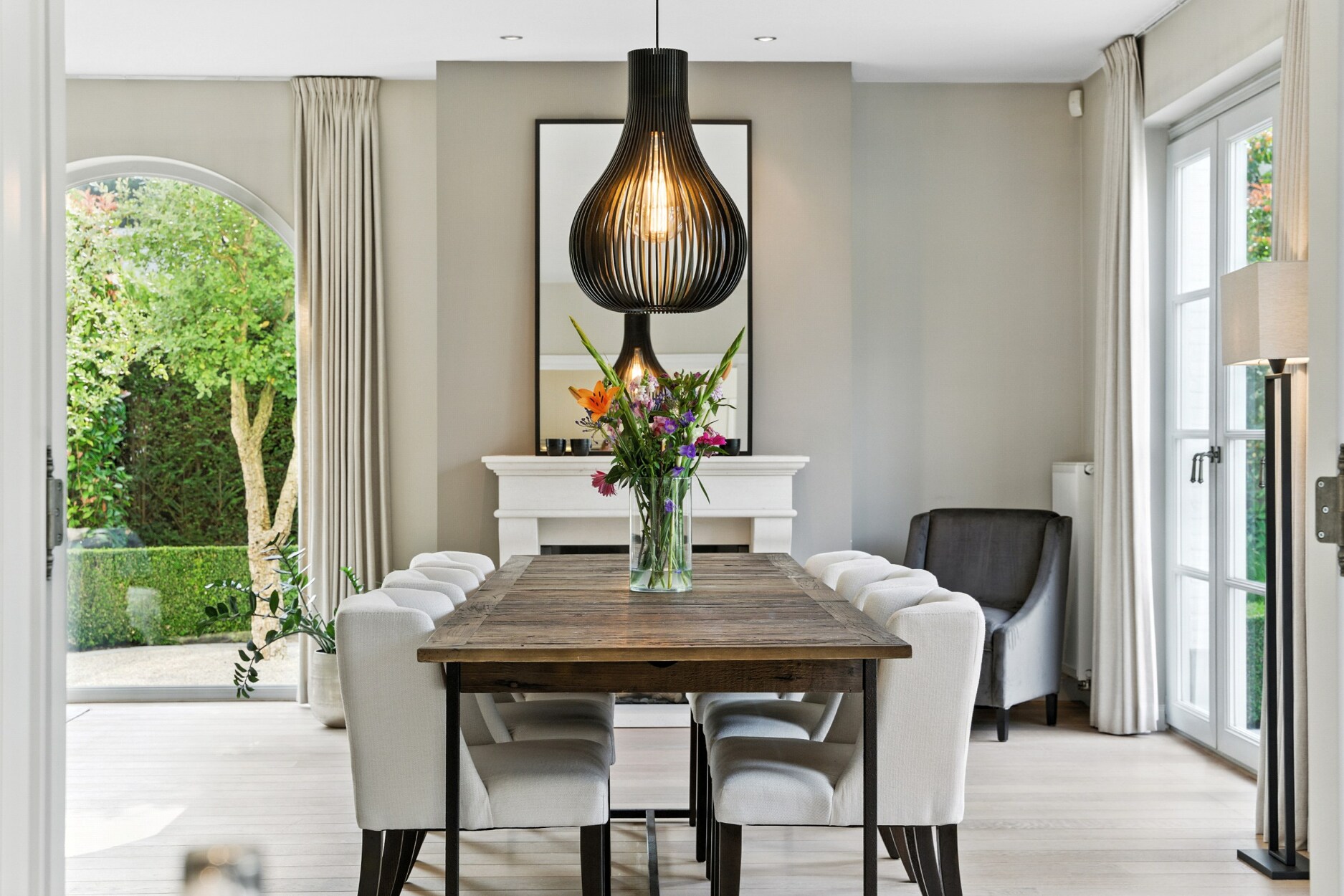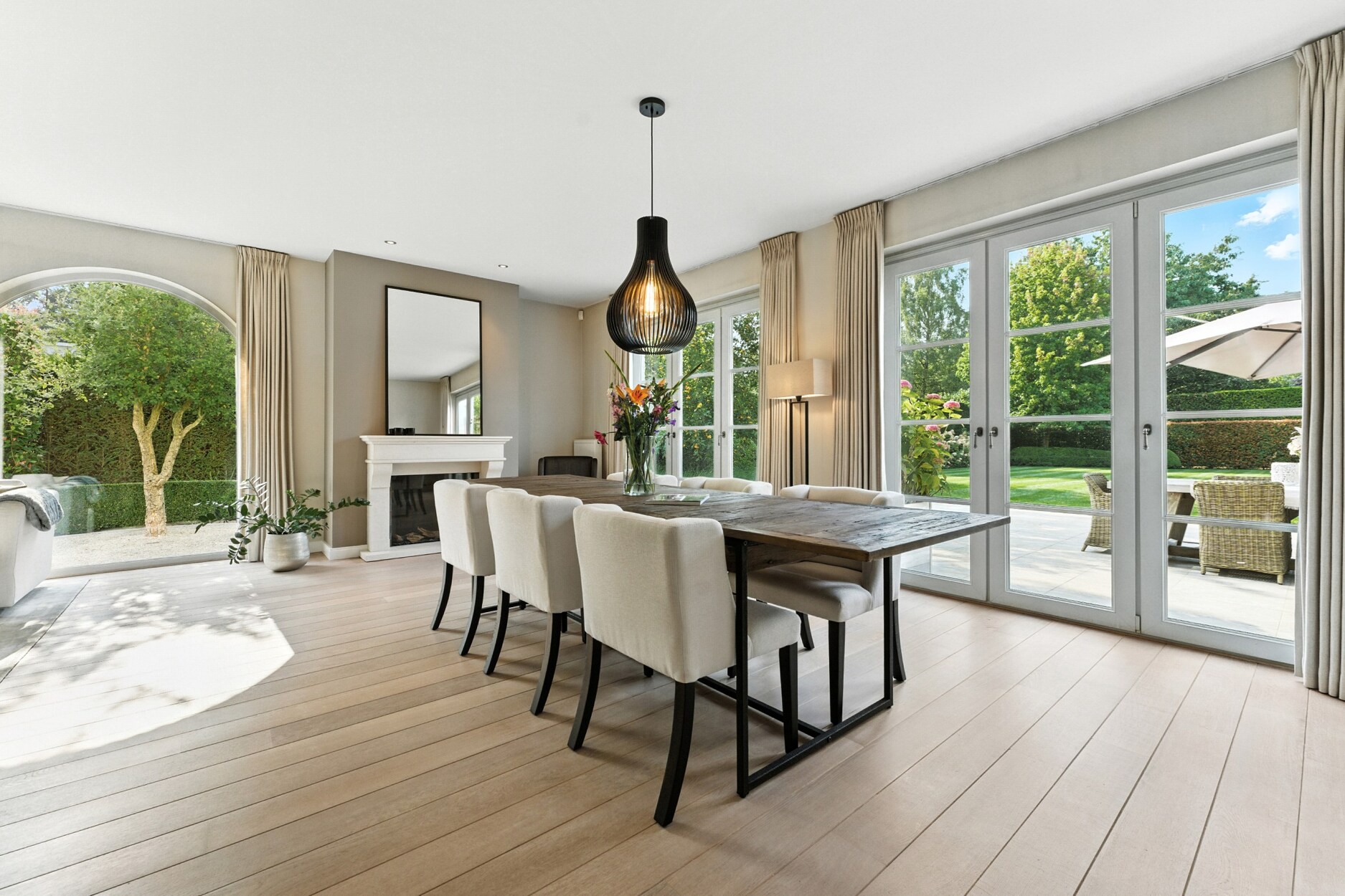 De woning verwelkomt u via een royale inkomhal met gastentoilet. Vervolgens betreedt u de lichtrijke leefruimte, afgewerkt met hoogwaardige massieve parketvloeren en een sfeervolle gashaard. De volledig uitgeruste keuken sluit hier naadloos op aan en biedt alle comfort voor culinaire fijnproevers. Verder beschikt het gelijkvloers over een dubbele inpandige garage met aansluitende berging en een bureauruimte.