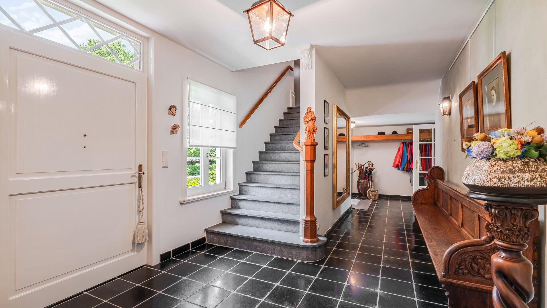 De gezellige voortuin met voldoende parkeergelegenheid brengt u tot de voordeur van deze riante villa. Bij het betreden van de inkomhal ervaart u onmiddellijk de gezellige sfeer. De inkomhal reikt tot de eerste verdieping en vormt het centrale hart van deze villa.