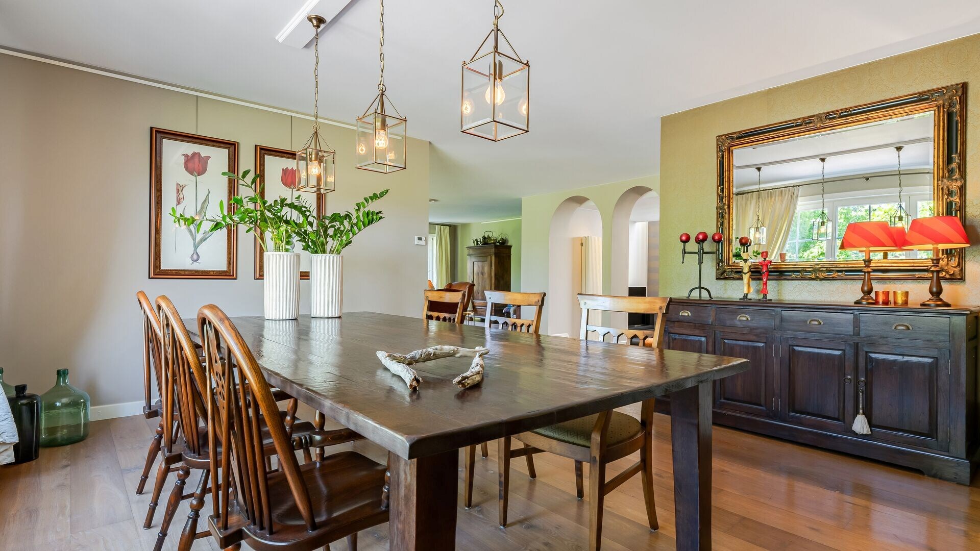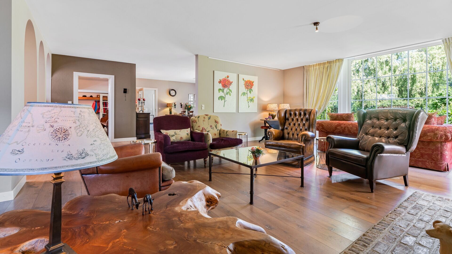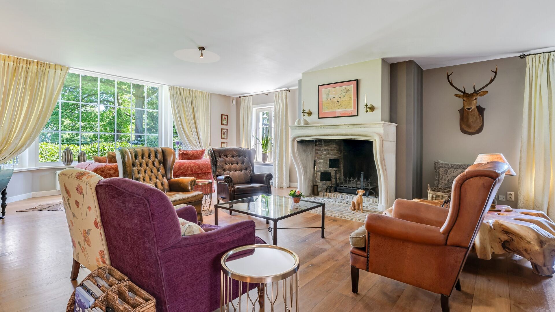 De deuren bieden vanuit deze hal toegang tot de verschillende ruimten. Zo treft u een gastentoilet met tussenruimte, geschikt als vestiaire. Aan de rechterkant bevinden zich de leefruimten, met o.a. een schitterende eetkamer en twee gezellige zithoeken waarvan 1 met grote open haard. Deze leefruimten beschikken allen over een massief eiken parketvloer, grote raampartijen met mooi zicht naar de tuin.