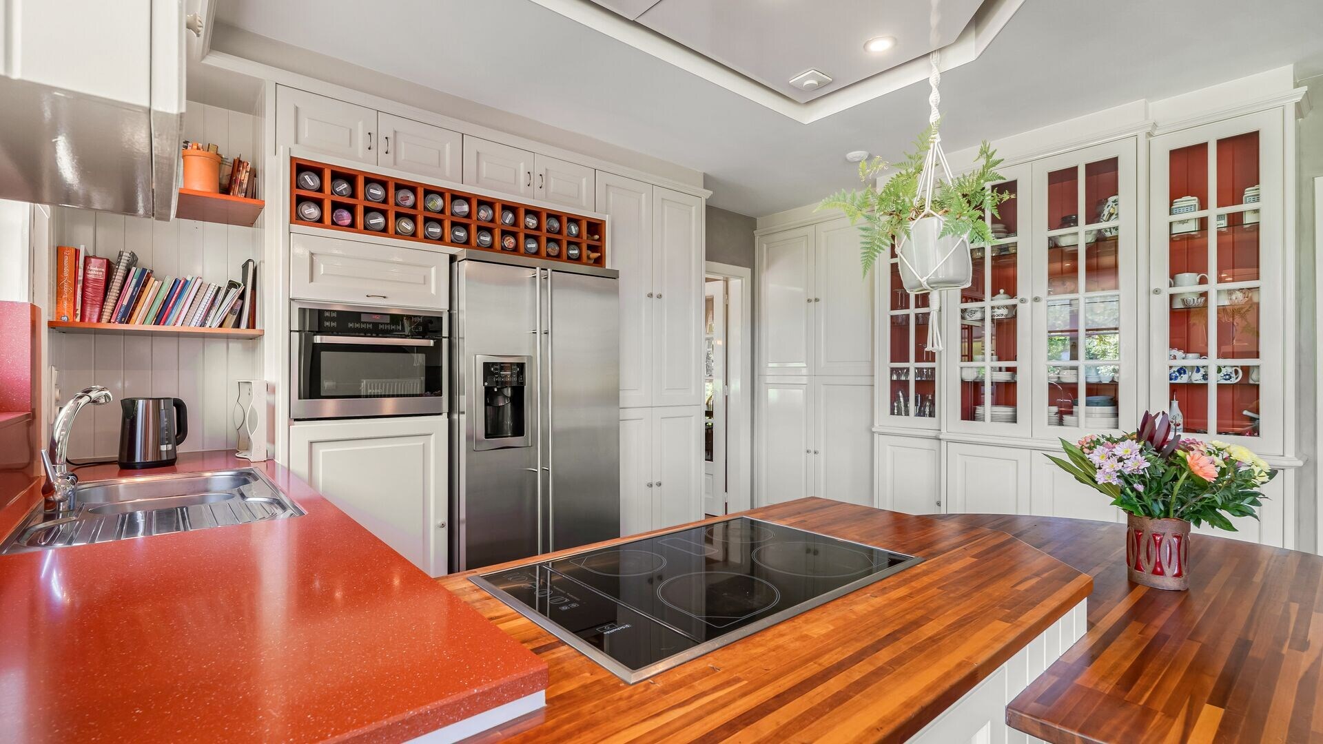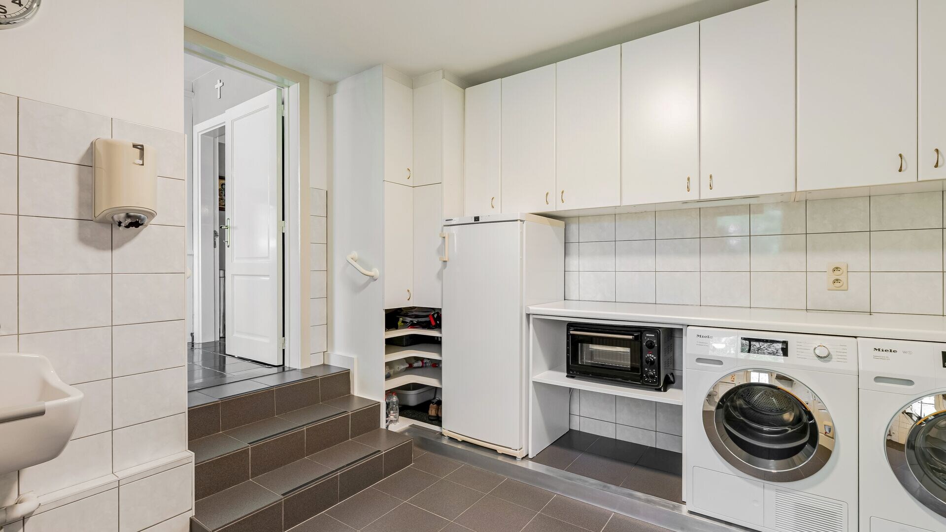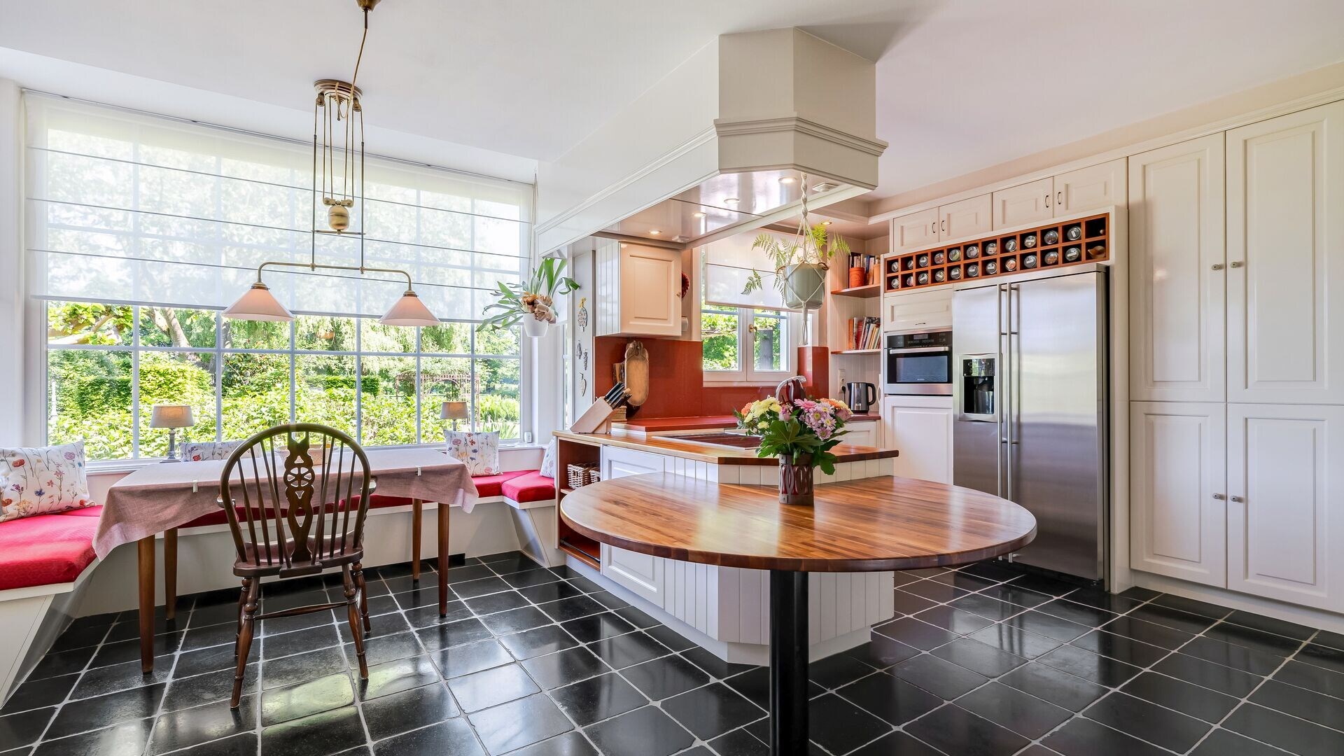Vanuit de centrale inkomhal hebt u toegang tot de riante woonkeuken, compleet ingericht met toestellen, gezellige eethoek en voldoende kastruimte.
