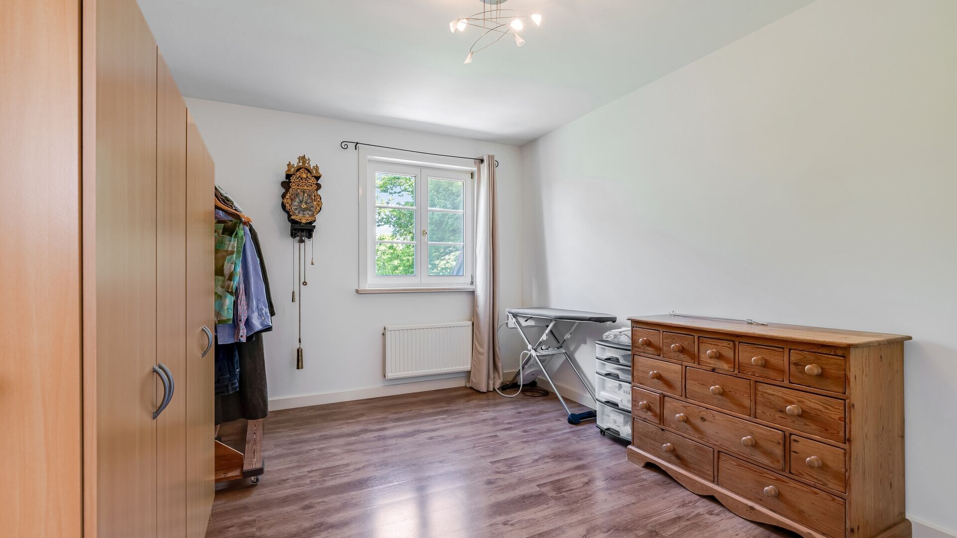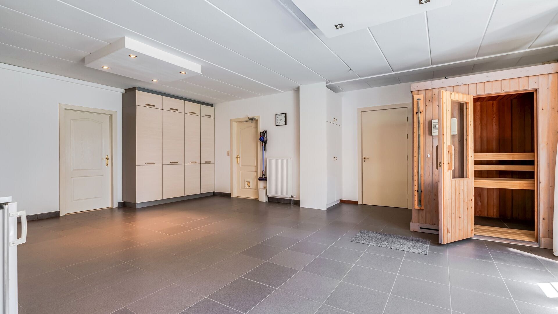 Verder bevindt zich op het gelijkvloers een dubbele inpandige garage, momenteel ingericht als multifunctionele ruimte met sauna en veel opslagmogelijkheden. Inclusief extra werkplaats en aparte technische ruimte. Ideaal voor ontspanning, hobby's en praktische toepassingen.