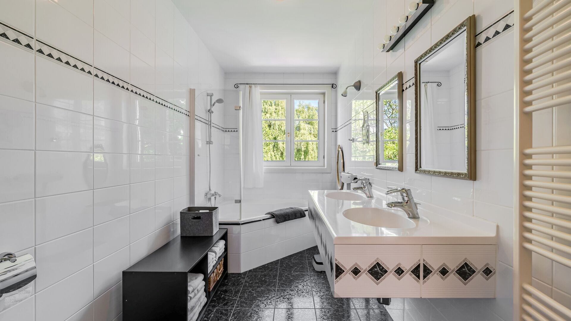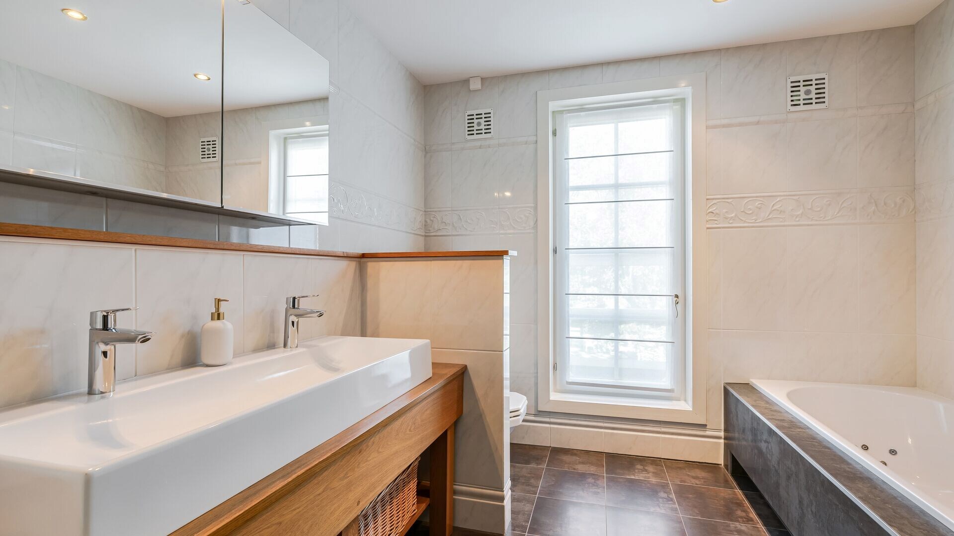 Verder nog vier ruime slaapkamers met veel lichtinval. De tweede badkamer op deze verdieping is voorzien van ligbad en dubbele lavabo in meubel.