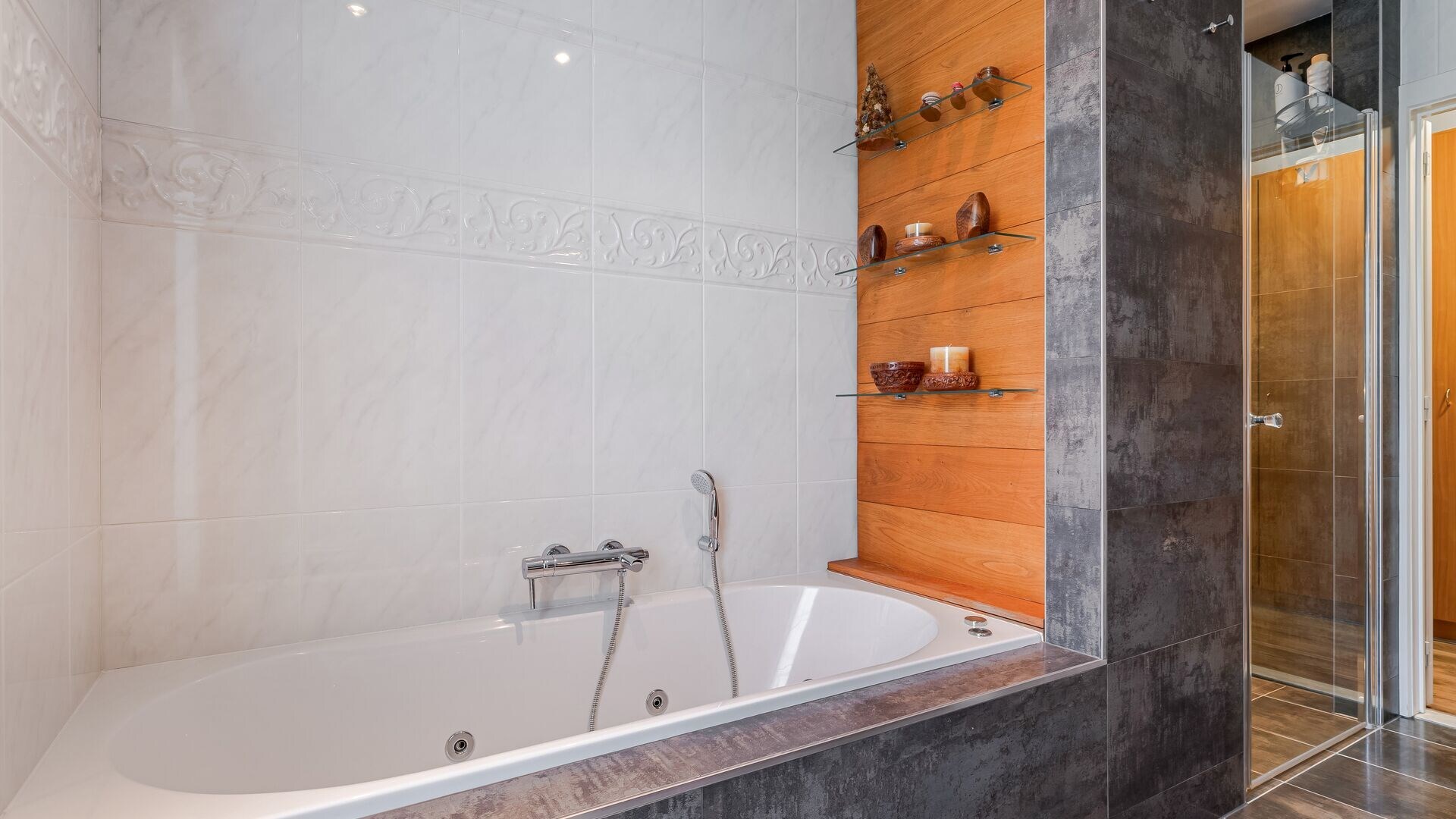 De stijlvolle trap brengt u vanuit de centrale inkomhal naar de bovenliggende verdieping. De ruime overloop geeft toegang tot de sfeervolle mastersuite met eigen badkamer. De badkamer is voorzien van een ligbad, douche, toilet en dubbele wastafel in meubel.