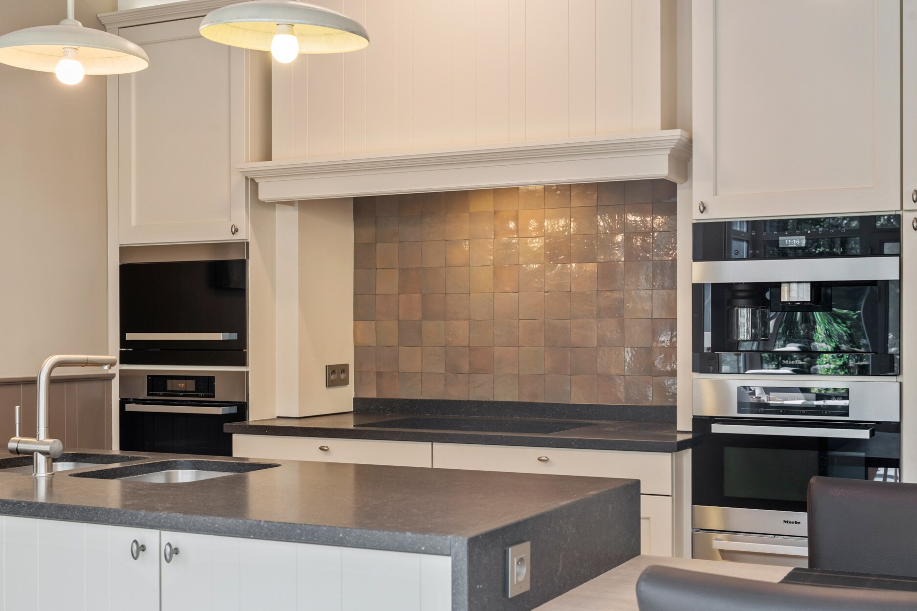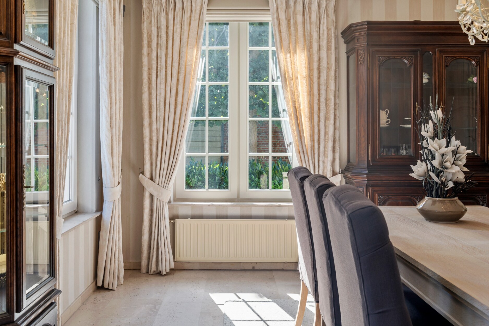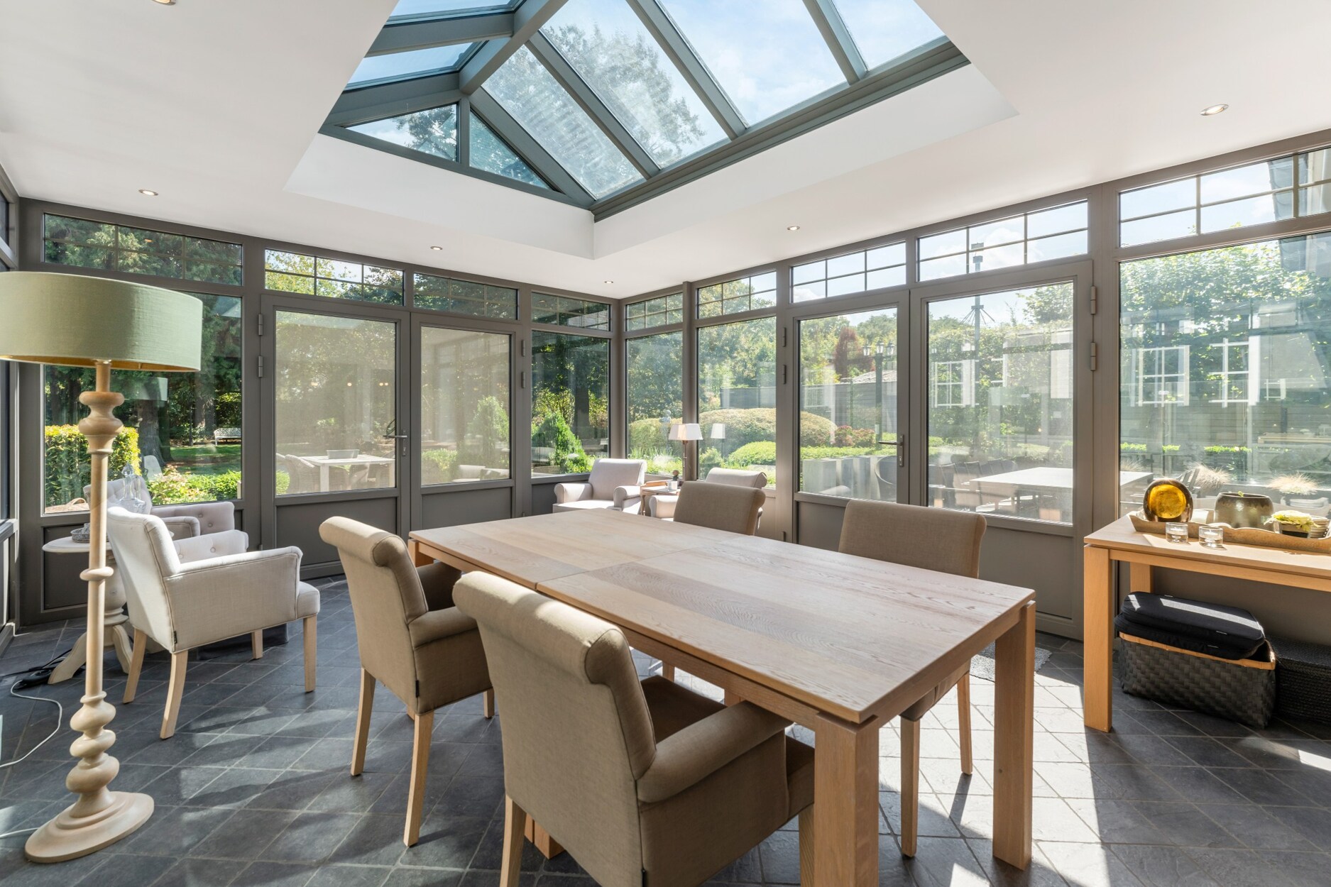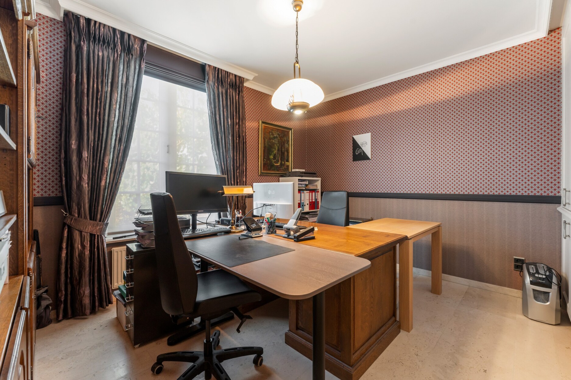 De ruime inkomhal met apart toilet biedt enerzijds toegang tot de bureauruimte met ingemaakte kasten en anderzijds tot de gezellige leefruimte. De leefruimte omvat vele ramen waardoor u een prachtig zicht heeft over de groene tuin. Door het gebruik van warme en kwalitatieve materialen is het hier heerlijk vertoeven. Aansluitend aan het zitgedeelte bevindt zich de luxueuze keuken die is geïnstalleerd met koffiemachine, afwasmachine, warmhoudlade, stoomoven, oven, microgolf en natuurstenen werkblad. De aanpalende tuinkamer is in alle seizoenen optimaal te gebruiken, hier heeft u echt het gevoel buiten te leven. Op de gelijkvloerse verdieping is een slaapkamer met ingemaakte kasten aanwezig, alsook een ruime badkamer met hoekbad, toilet, bidet, douche en dubbele lavabo. Hierdoor is de woning uitermate geschikt om gedeeltelijk als zorgwoning te gebruiken. De woning is ook zeer praktisch ingericht door de aanwezigheid van een wasplaats/berging, dubbele inpandige garage met vernieuwde elektrische poorten, inpandige fietsenberging en kelder.