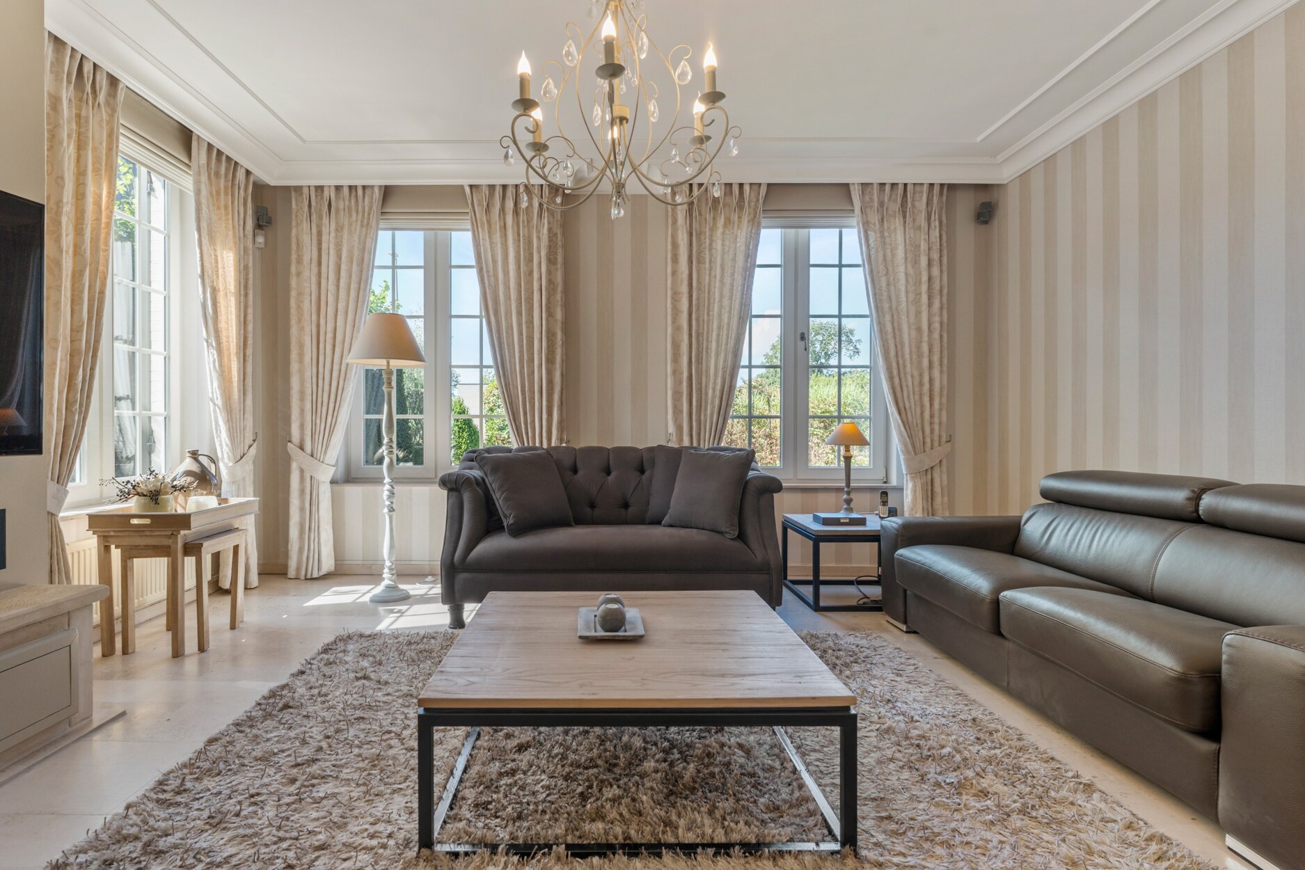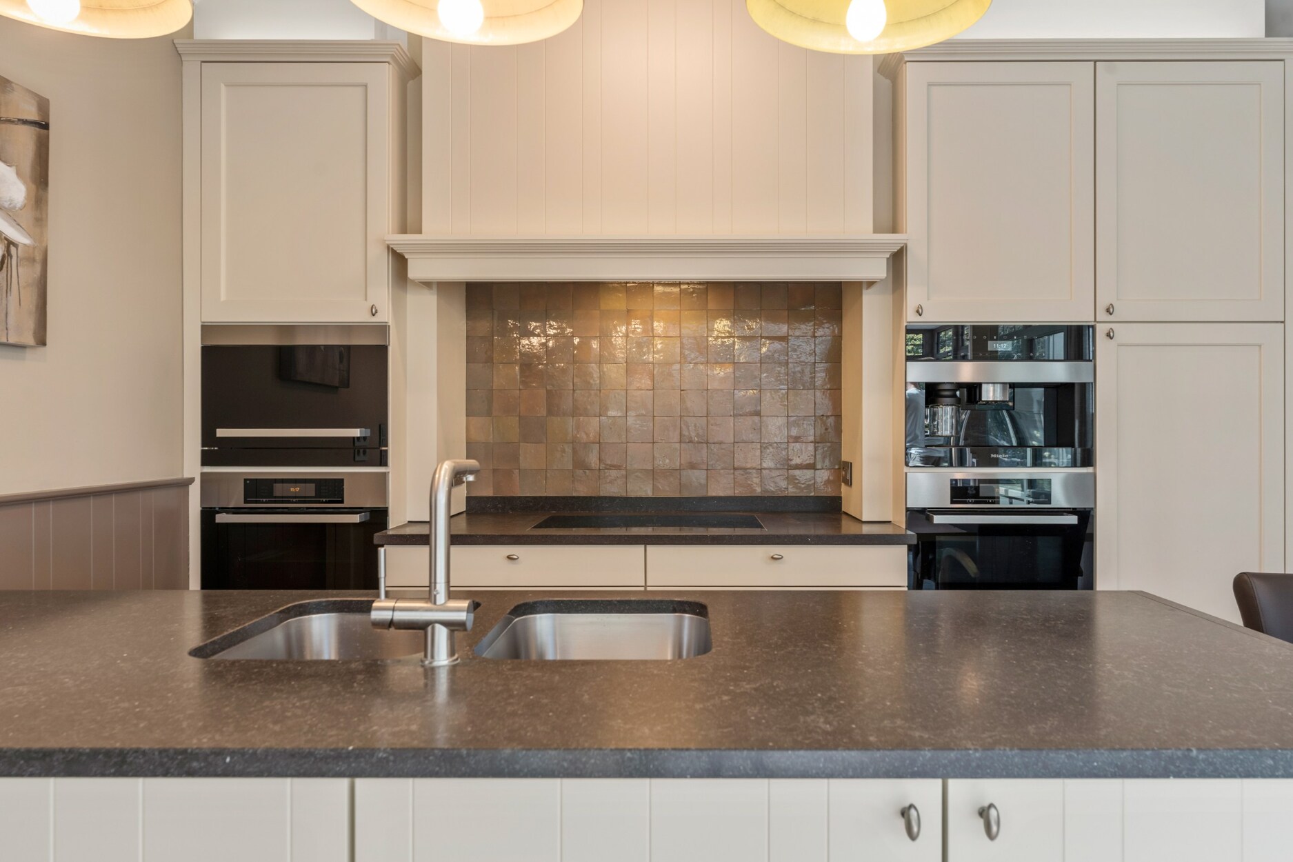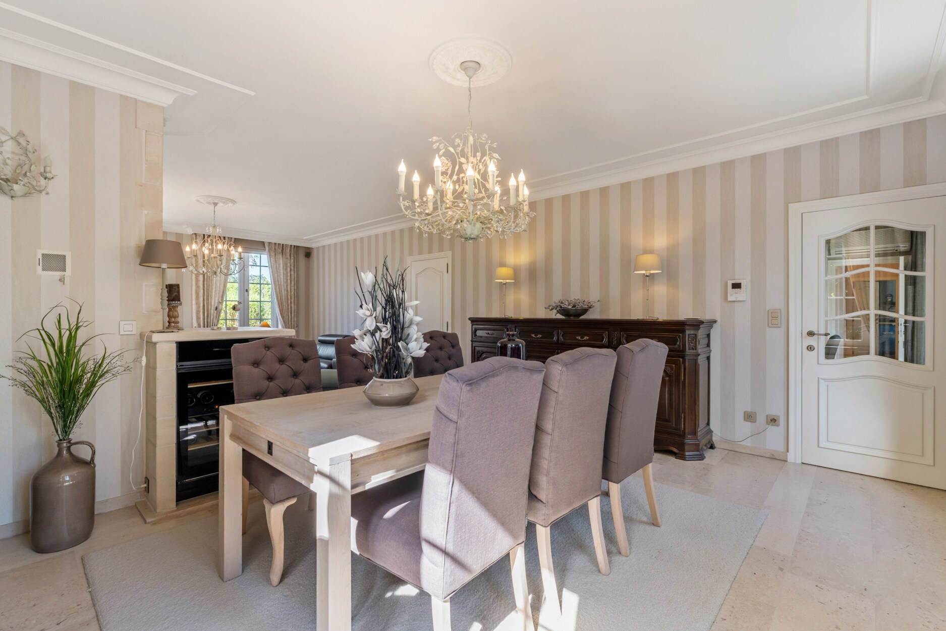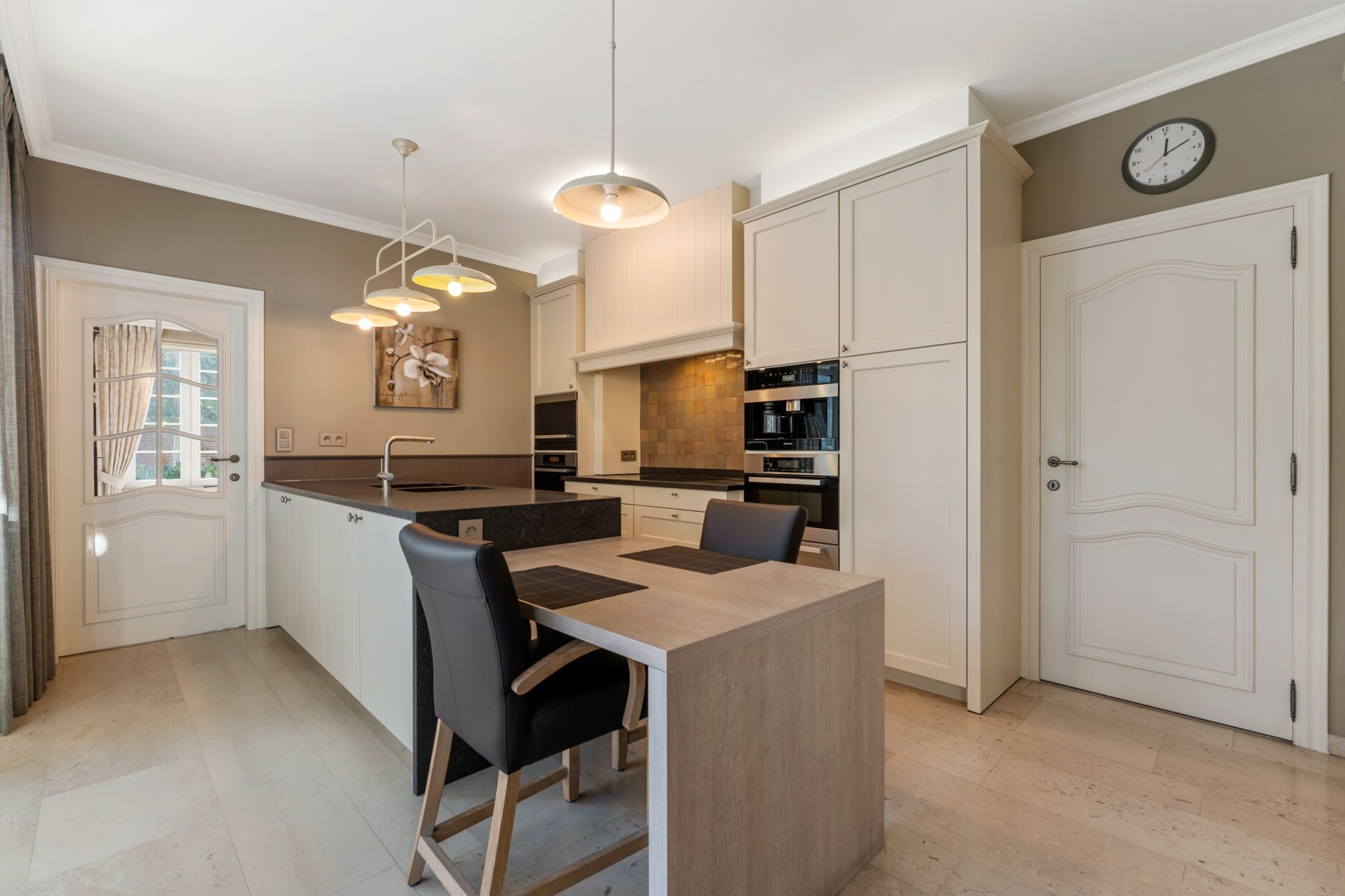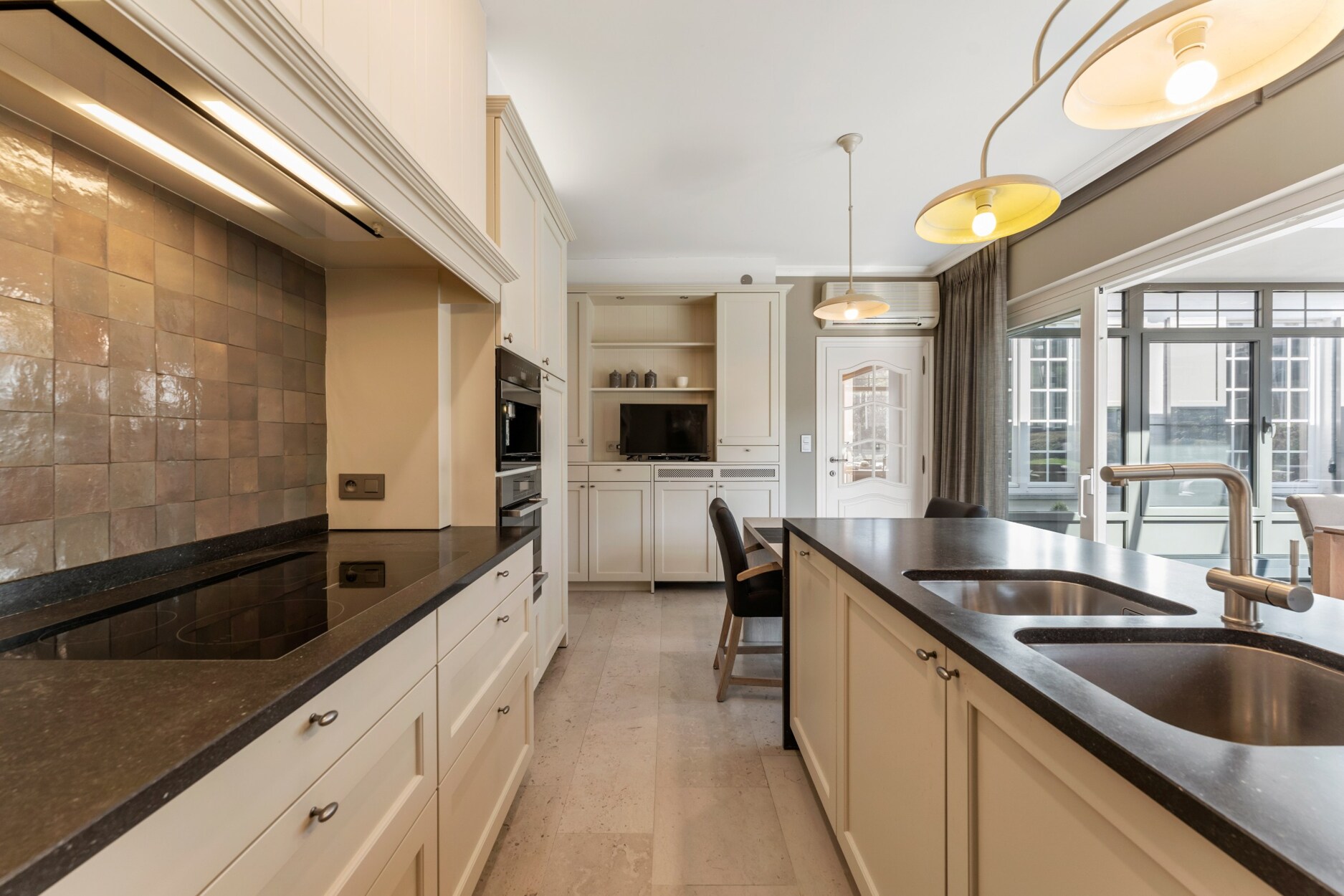De ruime inkomhal met apart toilet biedt enerzijds toegang tot de bureauruimte met ingemaakte kasten en anderzijds tot de gezellige leefruimte. De leefruimte omvat vele ramen waardoor u een prachtig zicht heeft over de groene tuin. Door het gebruik van warme en kwalitatieve materialen is het hier heerlijk vertoeven. Aansluitend aan het zitgedeelte bevindt zich de luxueuze keuken die is geïnstalleerd met koffiemachine, afwasmachine, warmhoudlade, stoomoven, oven, microgolf en natuurstenen werkblad. De aanpalende tuinkamer is in alle seizoenen optimaal te gebruiken, hier heeft u echt het gevoel buiten te leven. Op de gelijkvloerse verdieping is een slaapkamer met ingemaakte kasten aanwezig, alsook een ruime badkamer met hoekbad, toilet, bidet, douche en dubbele lavabo. Hierdoor is de woning uitermate geschikt om gedeeltelijk als zorgwoning te gebruiken. De woning is ook zeer praktisch ingericht door de aanwezigheid van een wasplaats/berging, dubbele inpandige garage met vernieuwde elektrische poorten, inpandige fietsenberging en kelder.