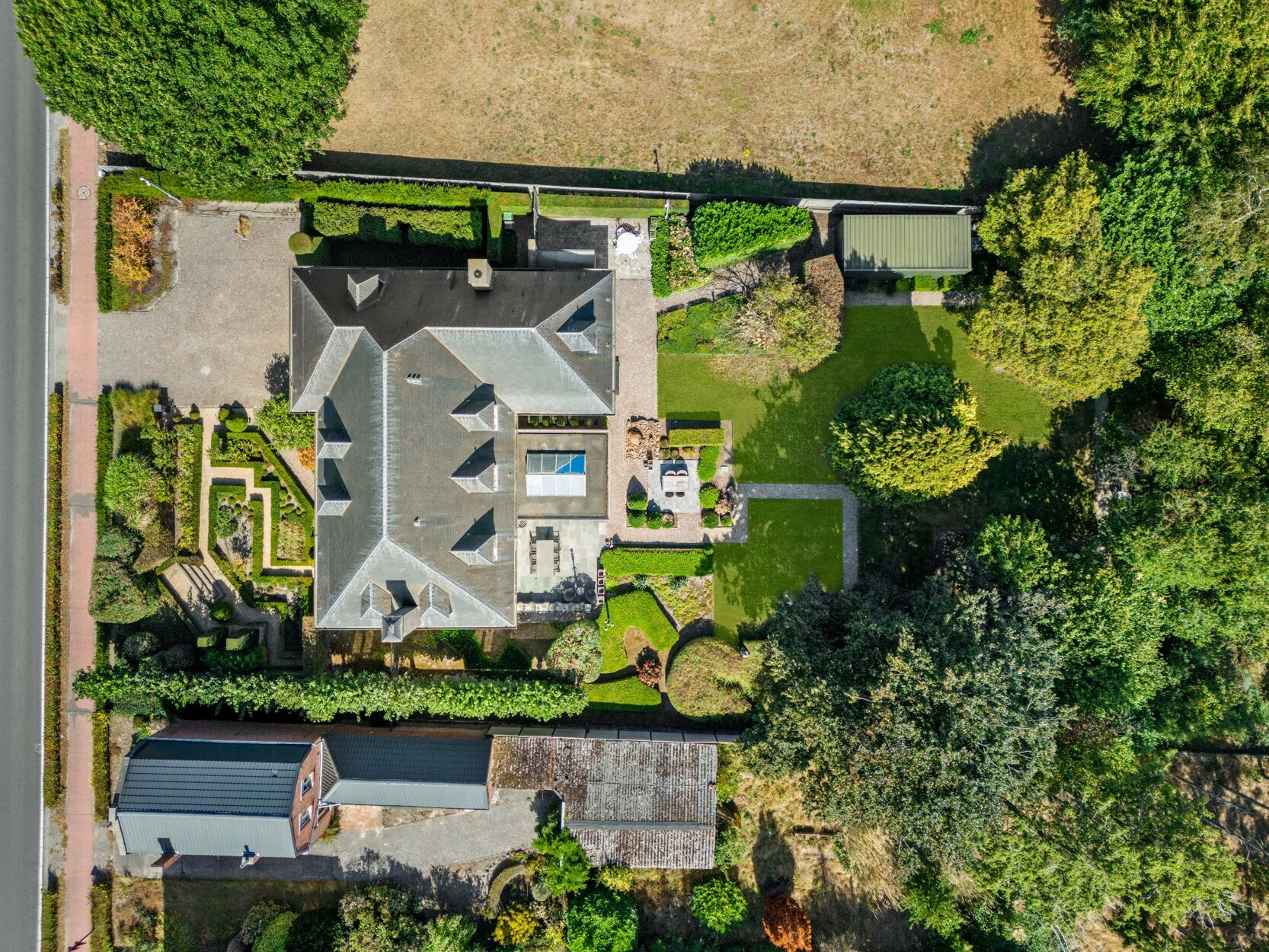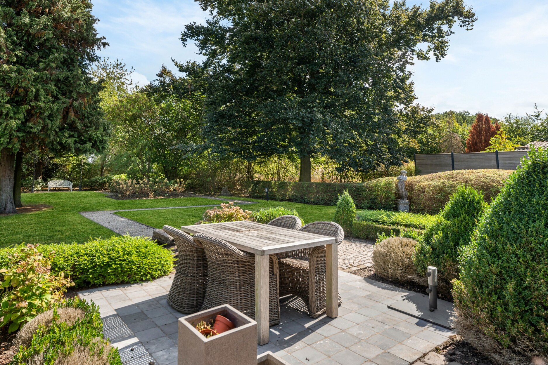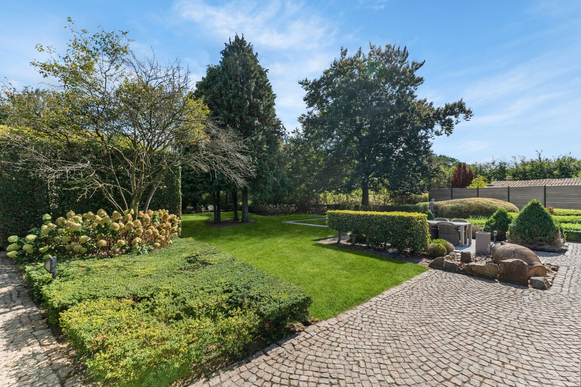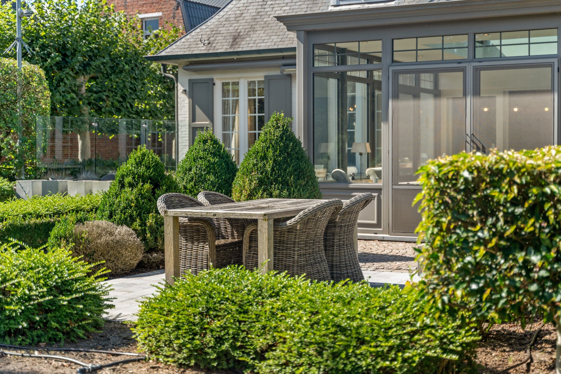 De woning is rondom omgeven door groen. De tuin is volledig aangelegd met verhard terras met automatisch zonnescherm, beregeningsinstallatie, tuinhuis en fraaie beplanting. In deze prachtige tuin geniet u van alle privacy.