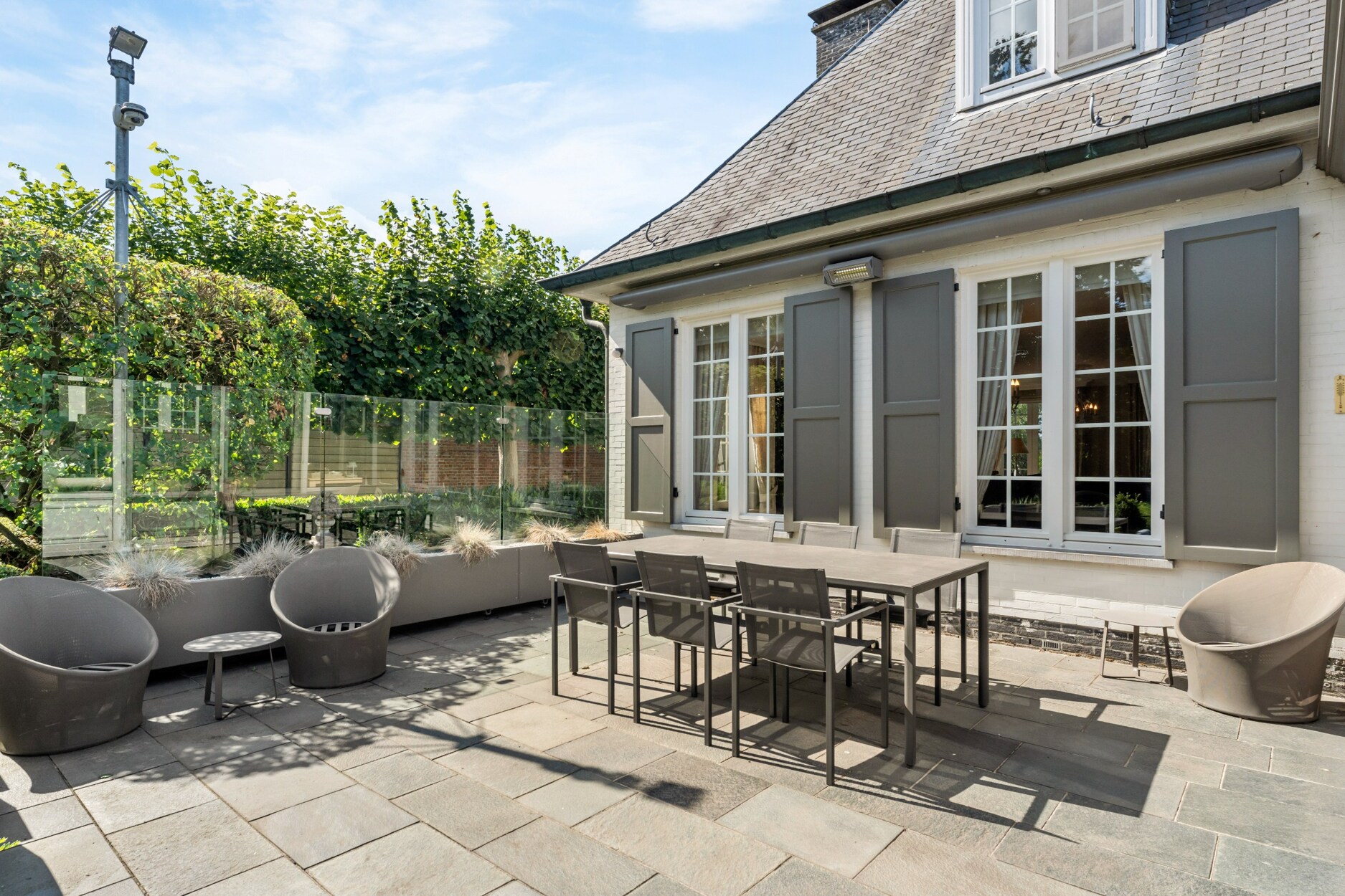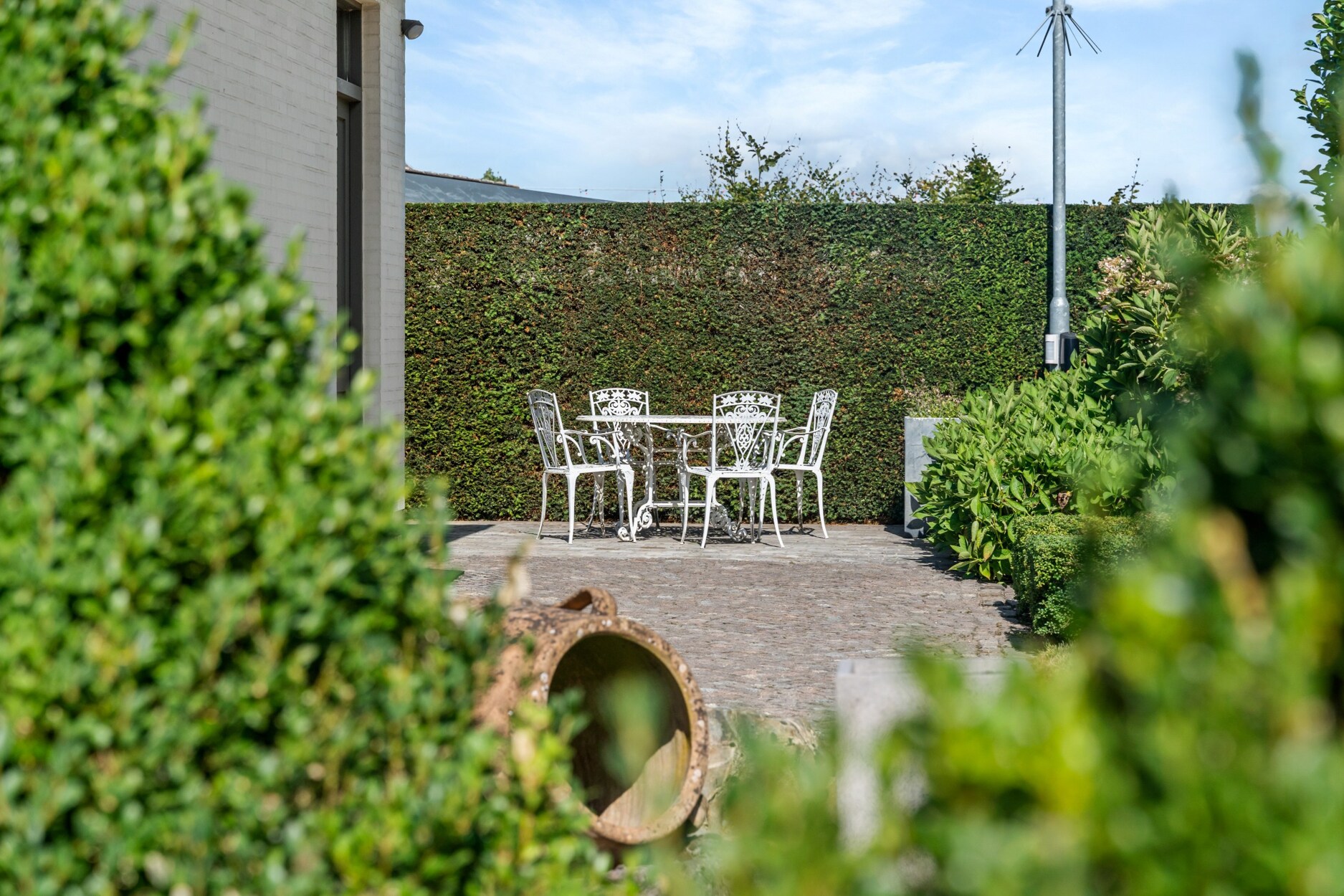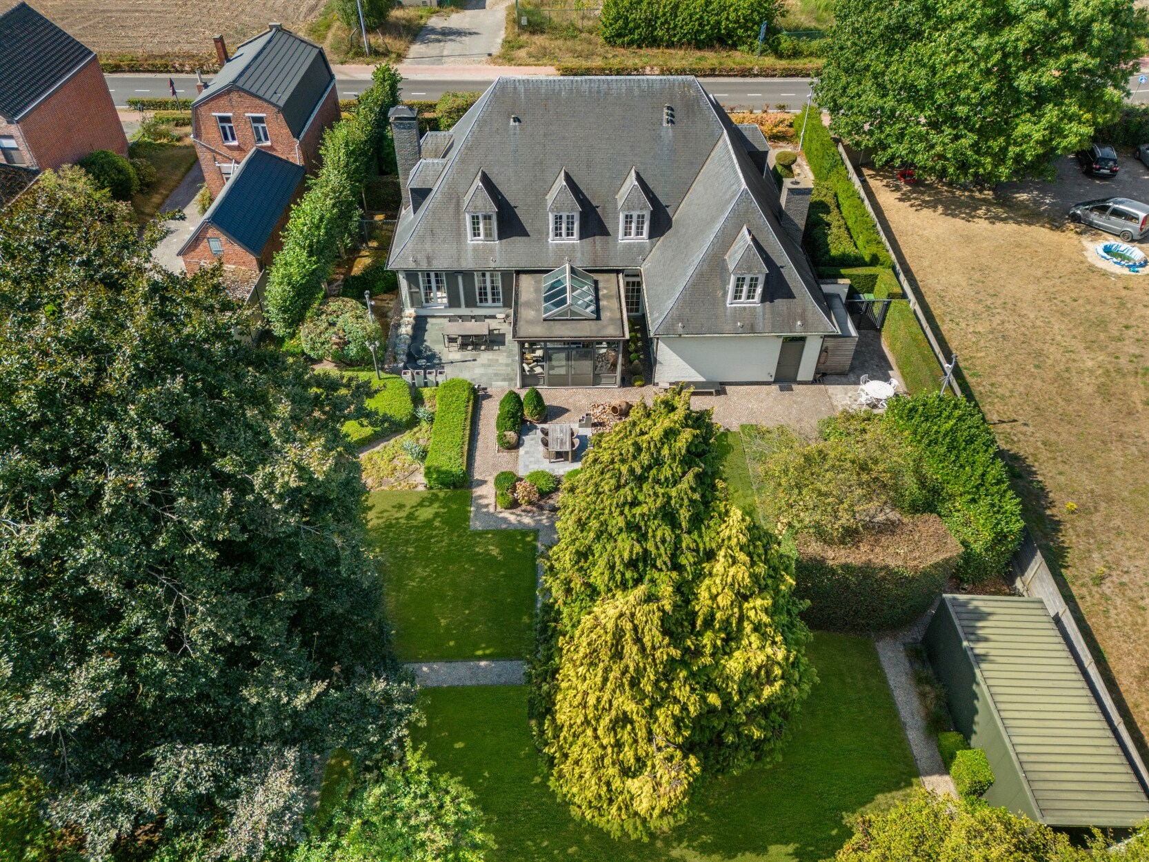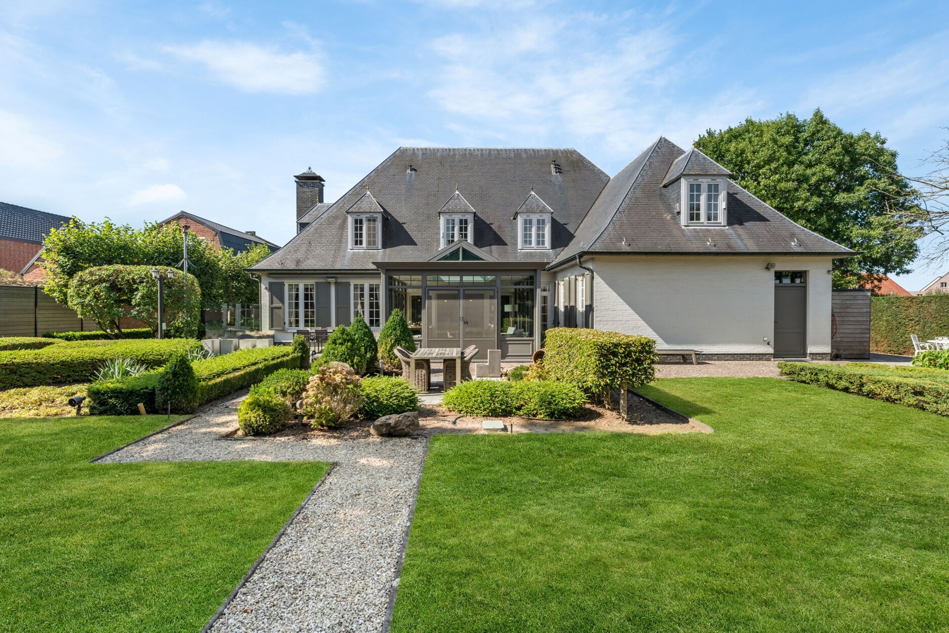 De woning is rondom omgeven door groen. De tuin is volledig aangelegd met verhard terras met automatisch zonnescherm, beregeningsinstallatie, tuinhuis en fraaie beplanting. In deze prachtige tuin geniet u van alle privacy.