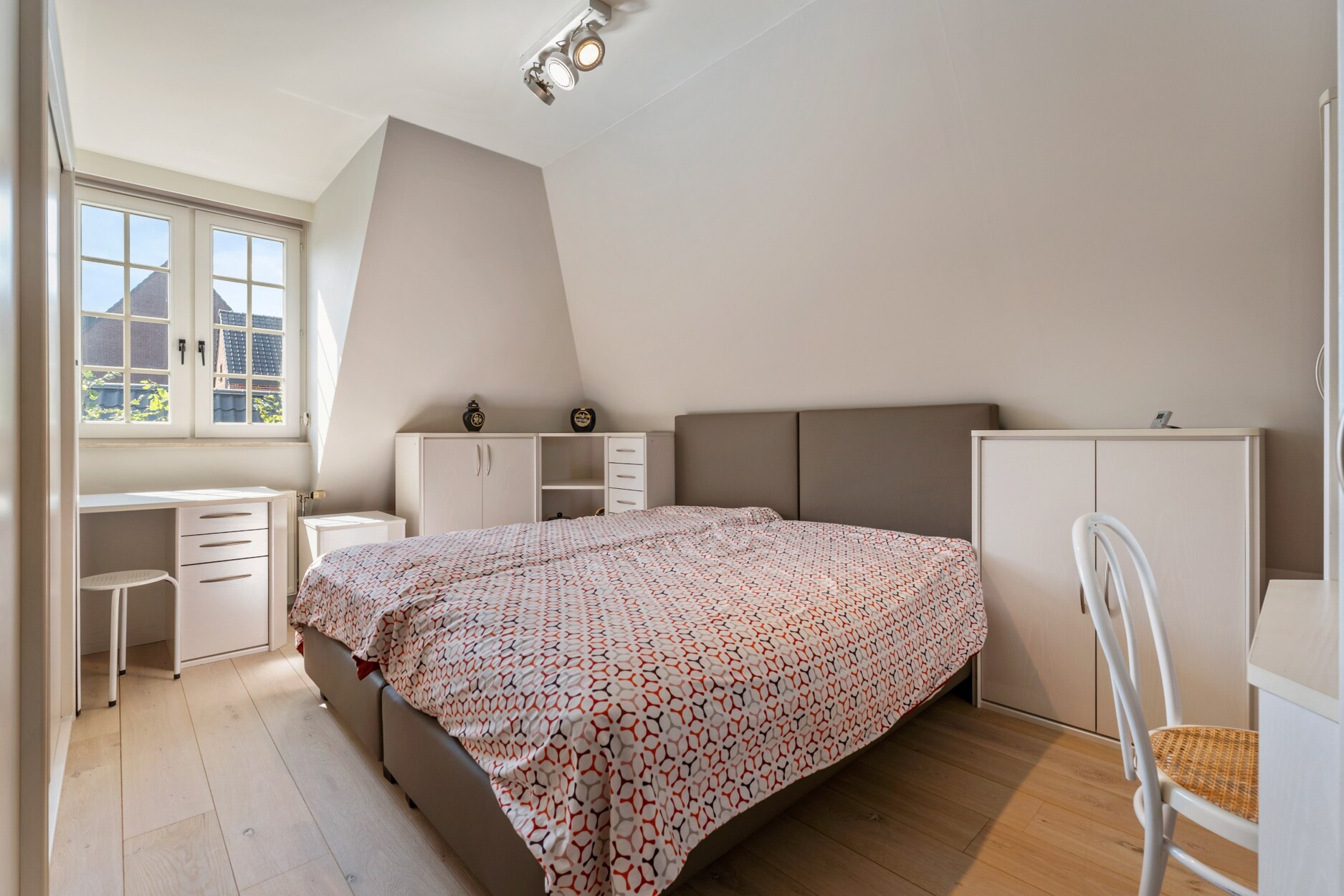 Op de eerste verdieping bevinden er zich 4 slaapkamers op parket en dressingruimte, alsook een tweede badkamer met douche, bad, dubbele lavabo en apart toilet. De zolder is bereikbaar via een vaste trap.