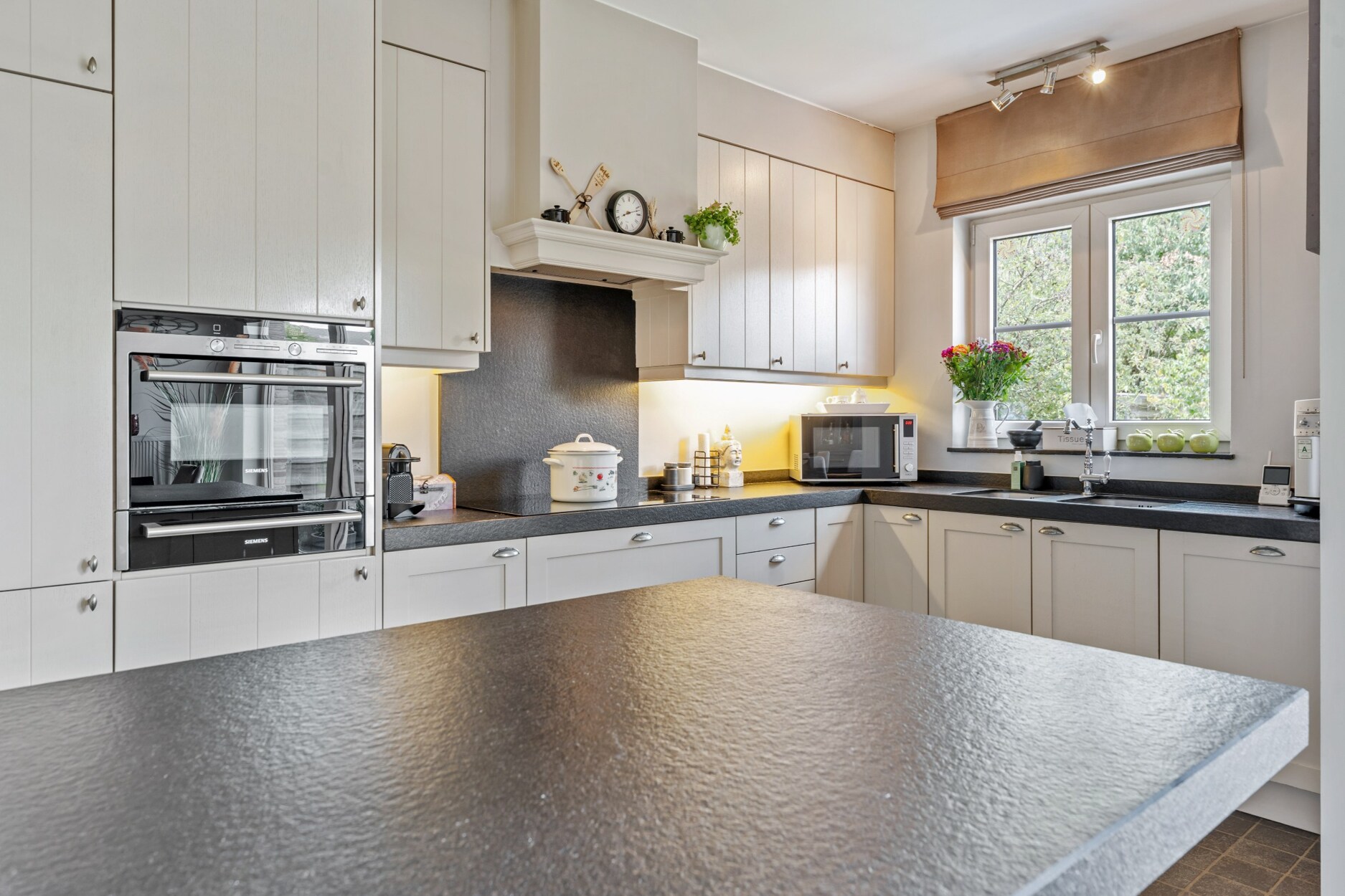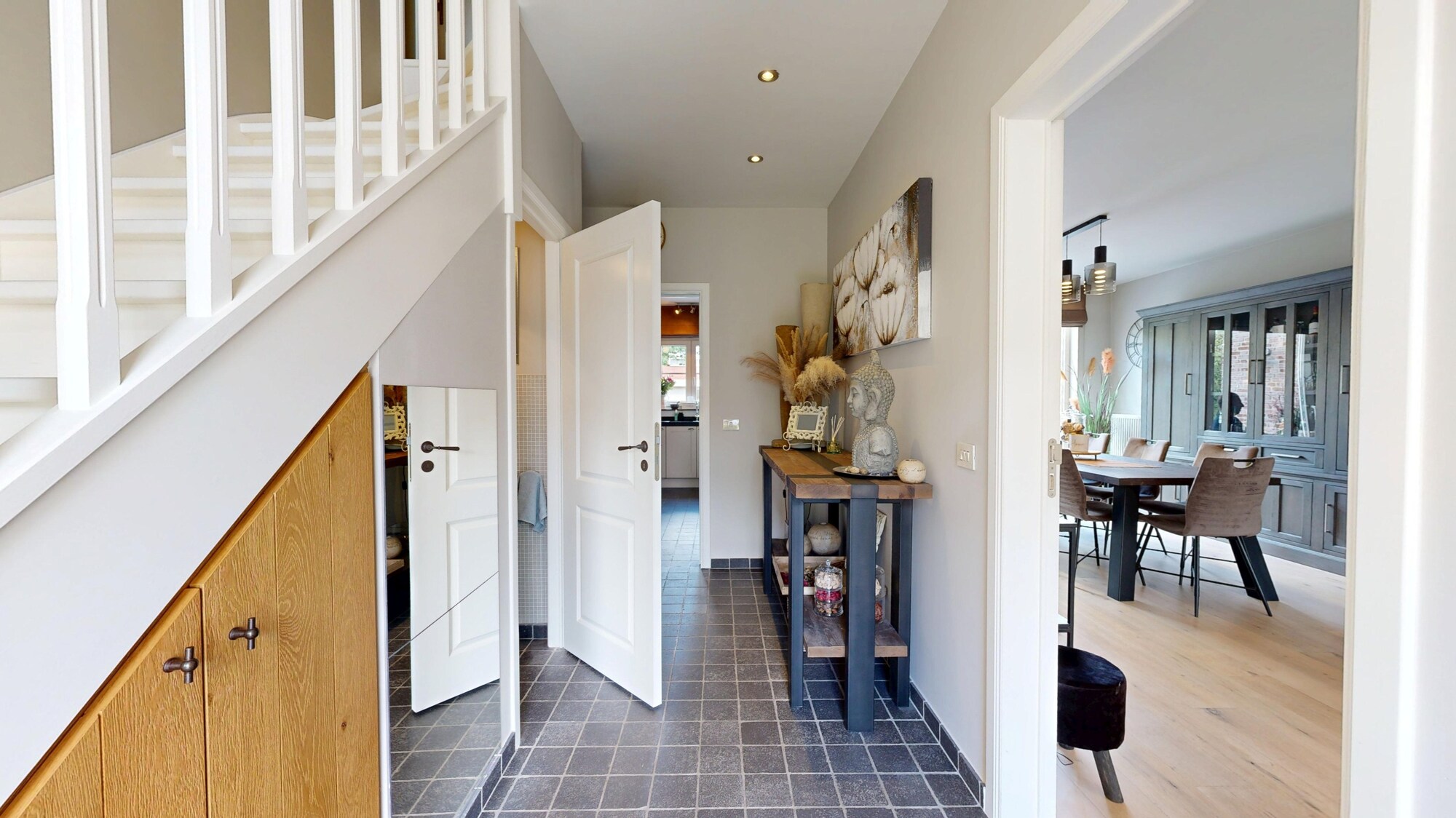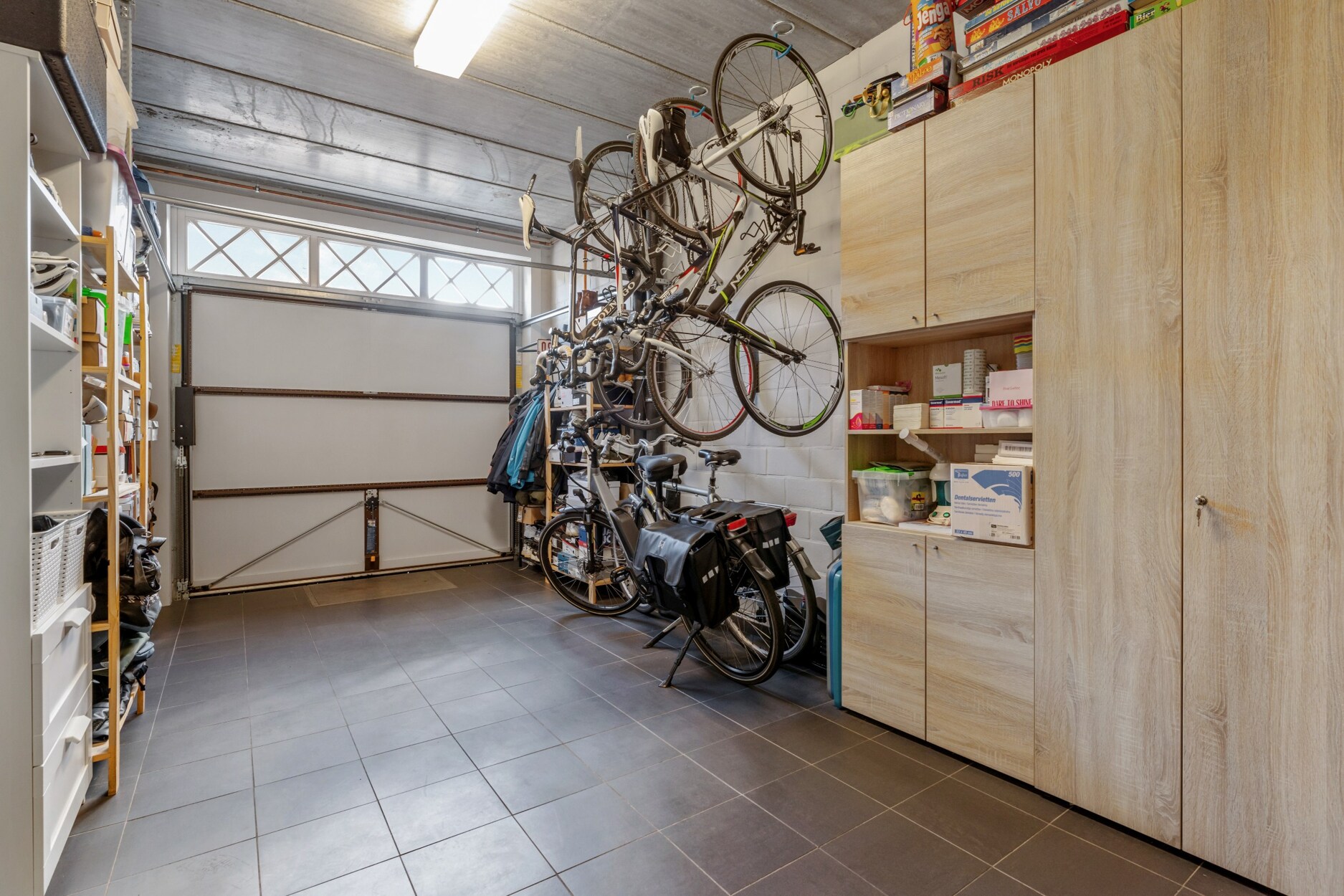 Via de inkomhal met vestiaire en gastentoilet krijg je meteen zicht op de elegante trap en de leefruimte. De woonkamer baadt in het licht dankzij grote ramen en een schuifraam naar het terras. Aansluitend vind je de ruime, volledig uitgeruste keuken met natuurstenen werkblad en hoogwaardige toestellen (combi-oven, koelkast, inductiekookplaat, warmhoudlade, dampkap en vaatwasser). Achteraan bevindt zich een praktische wasplaats/berging met toegang tot de tuin, én een inpandige garage.