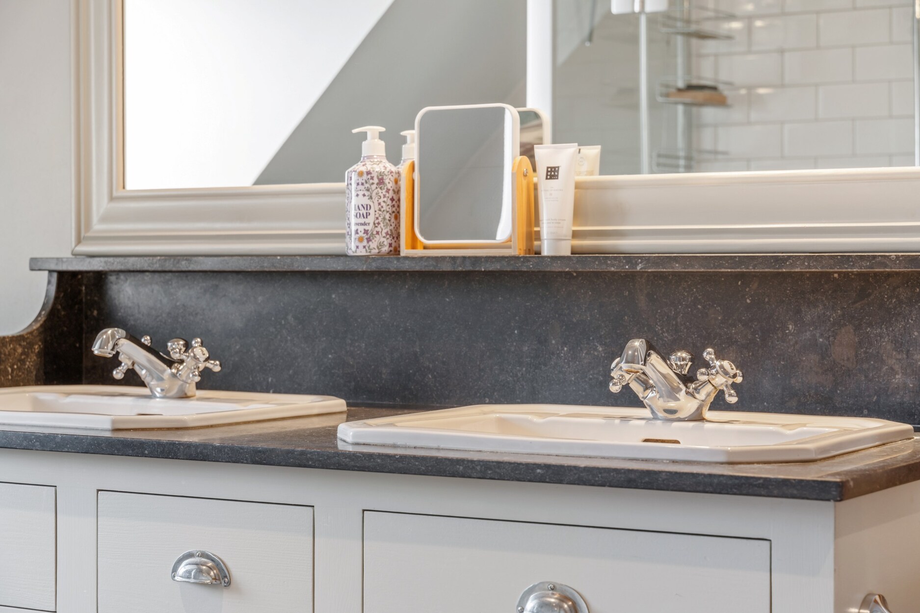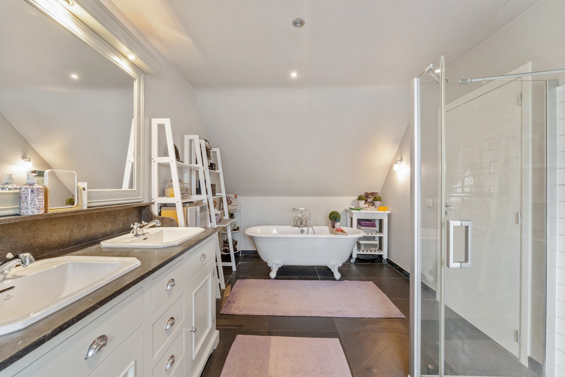 Hier bevinden zich drie slaapkamers, waaronder een royale master bedroom met maatwerkkasten. De ruime badkamer is een oase van comfort met een vrijstaand bad, inloopdouche, tweede toilet en stijlvol wastafelmeubel.
