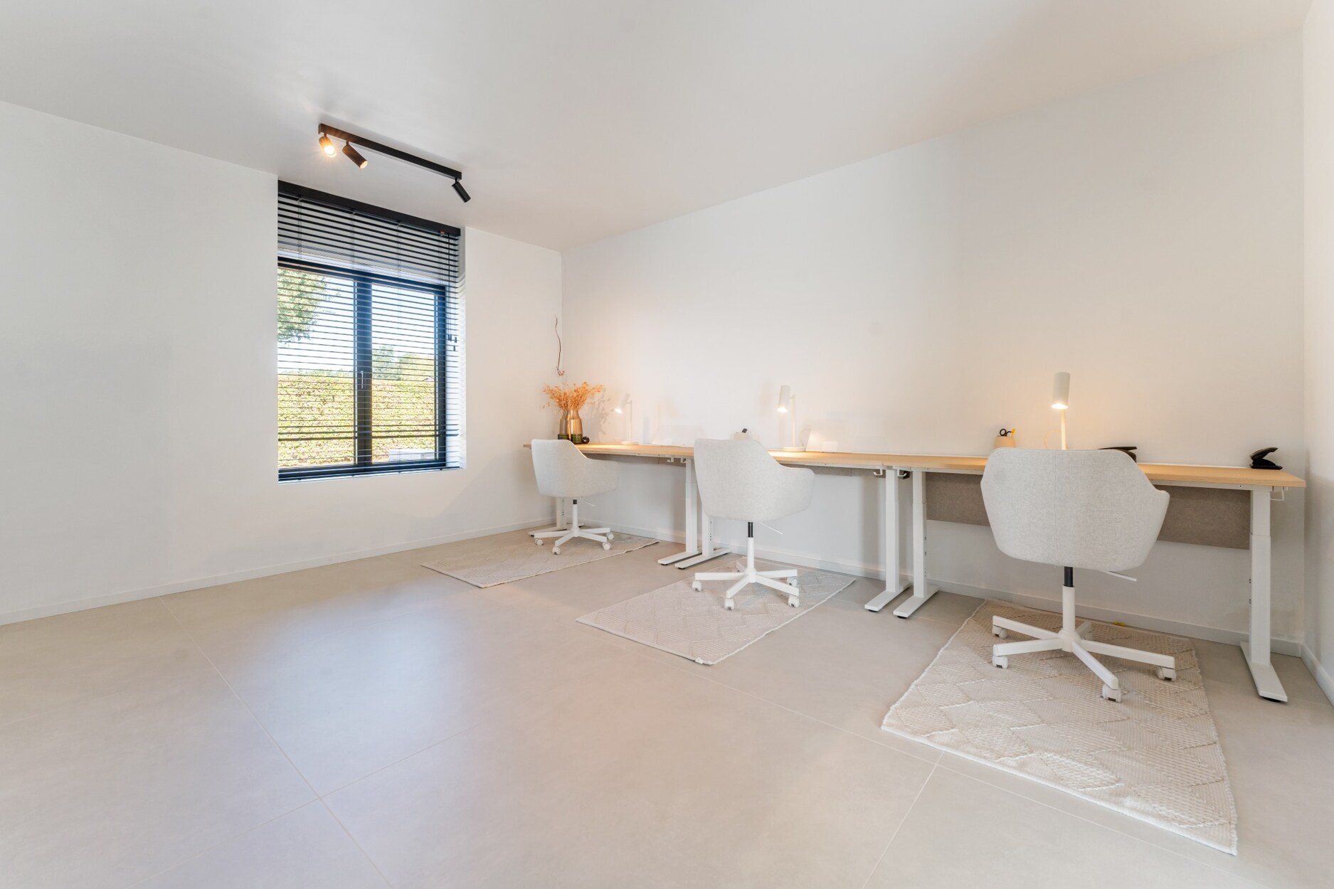 Bij het betreden van de ruime inkomhal met gastentoilet zal u meteen het ruimte-en lichtgevoel ervaren. De woonkamer beschikt over een mooie eetkamer en een gezellige zithoek. De leefkeuken bevindt zich aanpalend en is zelf nog te voorzien. Hier kan u helemaal uw eigen ding doen! Aanpalend de keuken treft 2 handige bergplaatsen te gebruiken als voorraadkamer of als extra bergruimte. Tevens kelder van ca 12m². Op de gelijkvloerse verdieping zijn 2 ruime bureauruimtes voorzien maar kunnen ook dienst doen als slaapkamer.