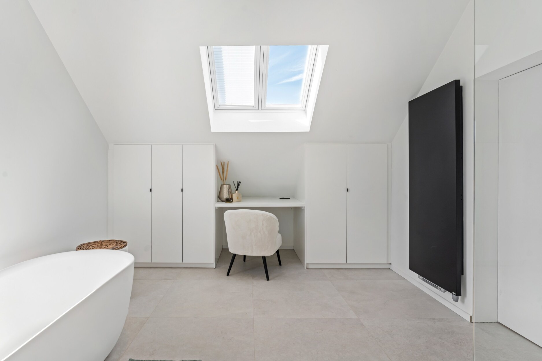 De betonnen trap brengt u tot de bovenverdieping. De masterbedroom bevindt zich rechts achteraan van de villa en geniet van extra inbouwkasten en ruimte om een ensuite badkamer te creëren. Verder 2 zeer ruime kinderkamers en een badkamer met douche, bad, dubbele wastafel en opbergkasten.